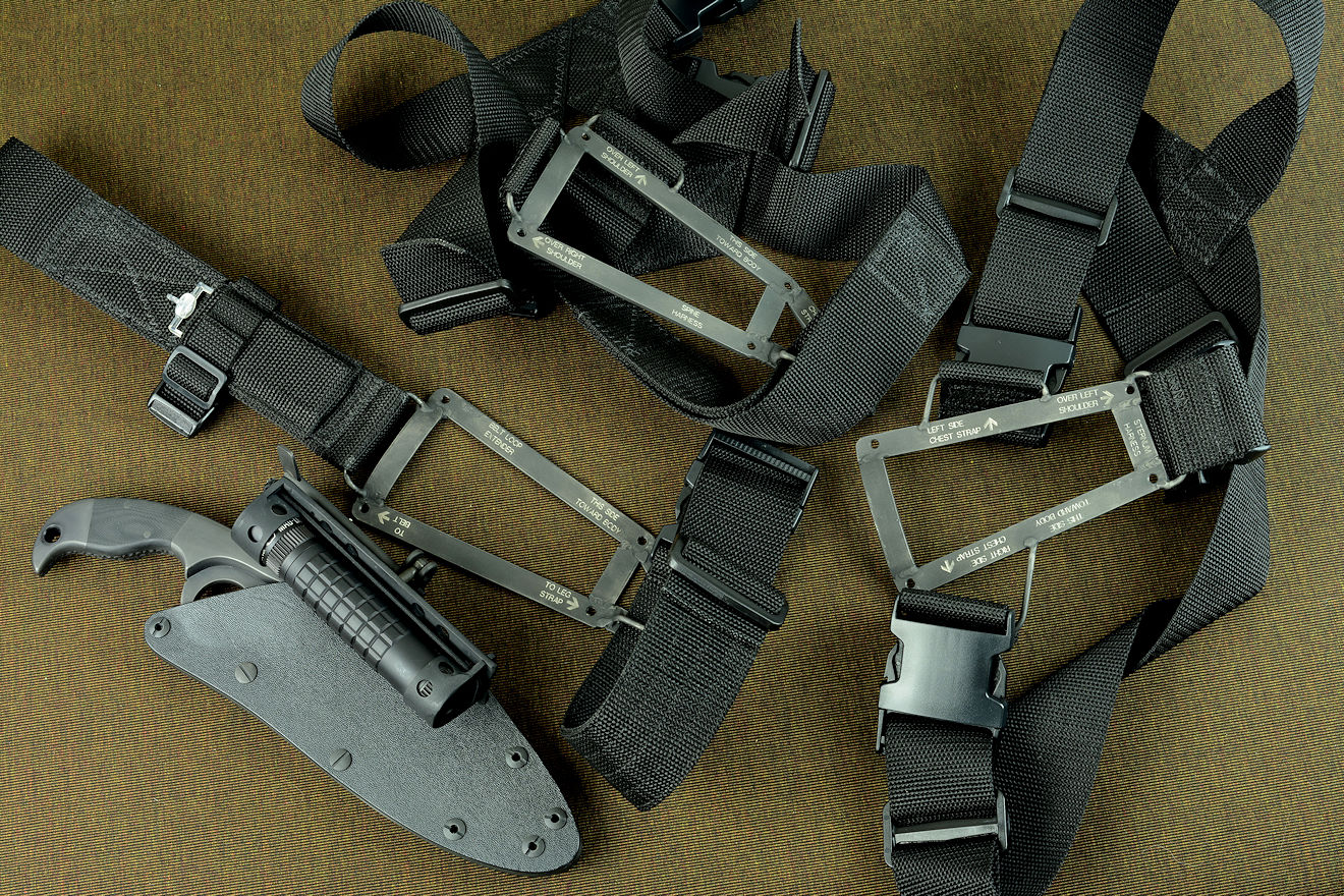 This intensive and packed kit includes my entire modular sheath wearing system: the belt loop extender, the sternum harness and the spine harness. This allows fast changes between setups and wear modules by simply loosening and replacing four thumbscrews on the sheath. With entire modular systems included in both black and coyote, this is the absolute best knife sheath wear system made in the world. All of it is handmade with the highest quality components in my studio. Look at the videos listed below and I'm certain you'll appreciate the thought, background, and input of my counterterrorism clients, my tactical, military, and law enforcement clients who have been so generous with their ideas, evaluation, and testing of the components.