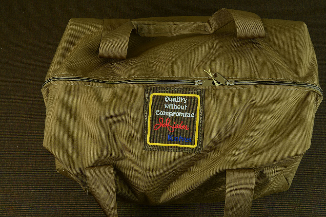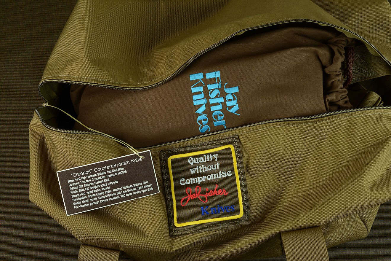 Accessories: This is an example of my commitment to the entire knife experience, from design to working service, with some of the finest professional knife users in the world. Since the bolt pattern of the sheath matches my 2.5" bolt pattern for my accessories, most of my accessories can be used on this sheath, including any new ones I develop. At the request of the counterterrorism professionals, this knife comes with the most complete bunker of attachment, wear, and useful accessories made in the world today! I even hand-make the heavy 1000 denier duffle bags to hold the entire kit. The kit includes my modular sheath wear system components, in both coyote and black: