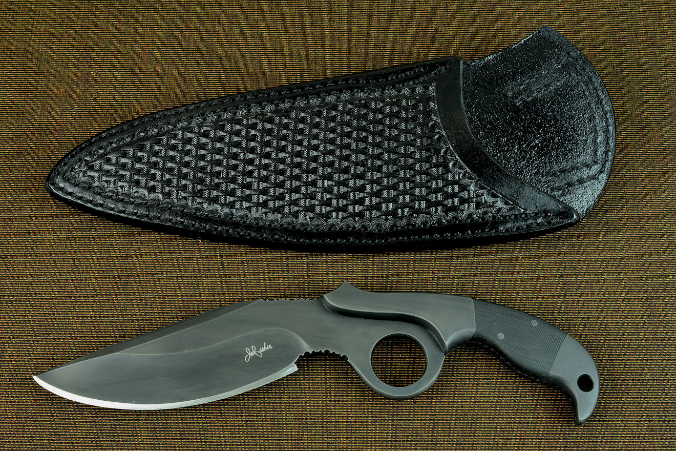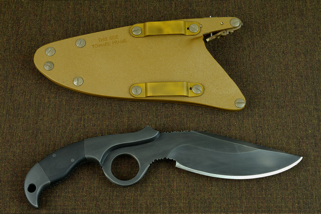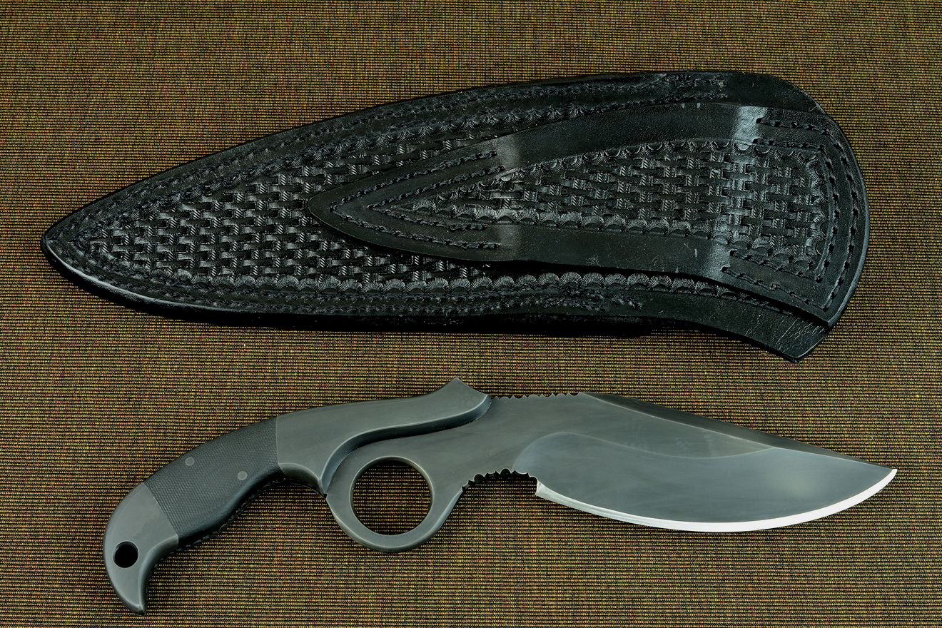The knife design is my combination of my desirable and successful "Hooded Warrior" blade pattern, and with features of my "Ari B'Lilah" Israeli YAMAM counterterrorism handle design, in a thick, strong, heavy form. Taking its root from my "Kairos," this is a large, curvaceous, strong slicing blade with forward finger ring security. For historical background, my Hooded Warrior blade pattern was designed with direct input from a sniper in the 101st Airborne way back in Operation Iraqi Freedom. The deep belly of the blade, the aggressive point and the two-thirds length top swage were incorporated to offer a serious piercing point with a generous amount of slashing curvature for defensive and counterterrorism tactical use.