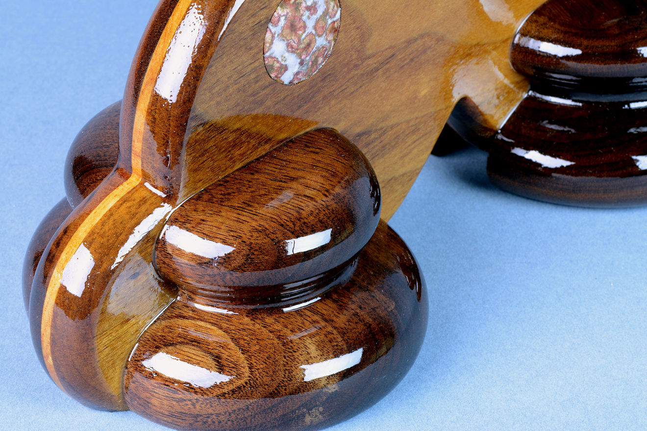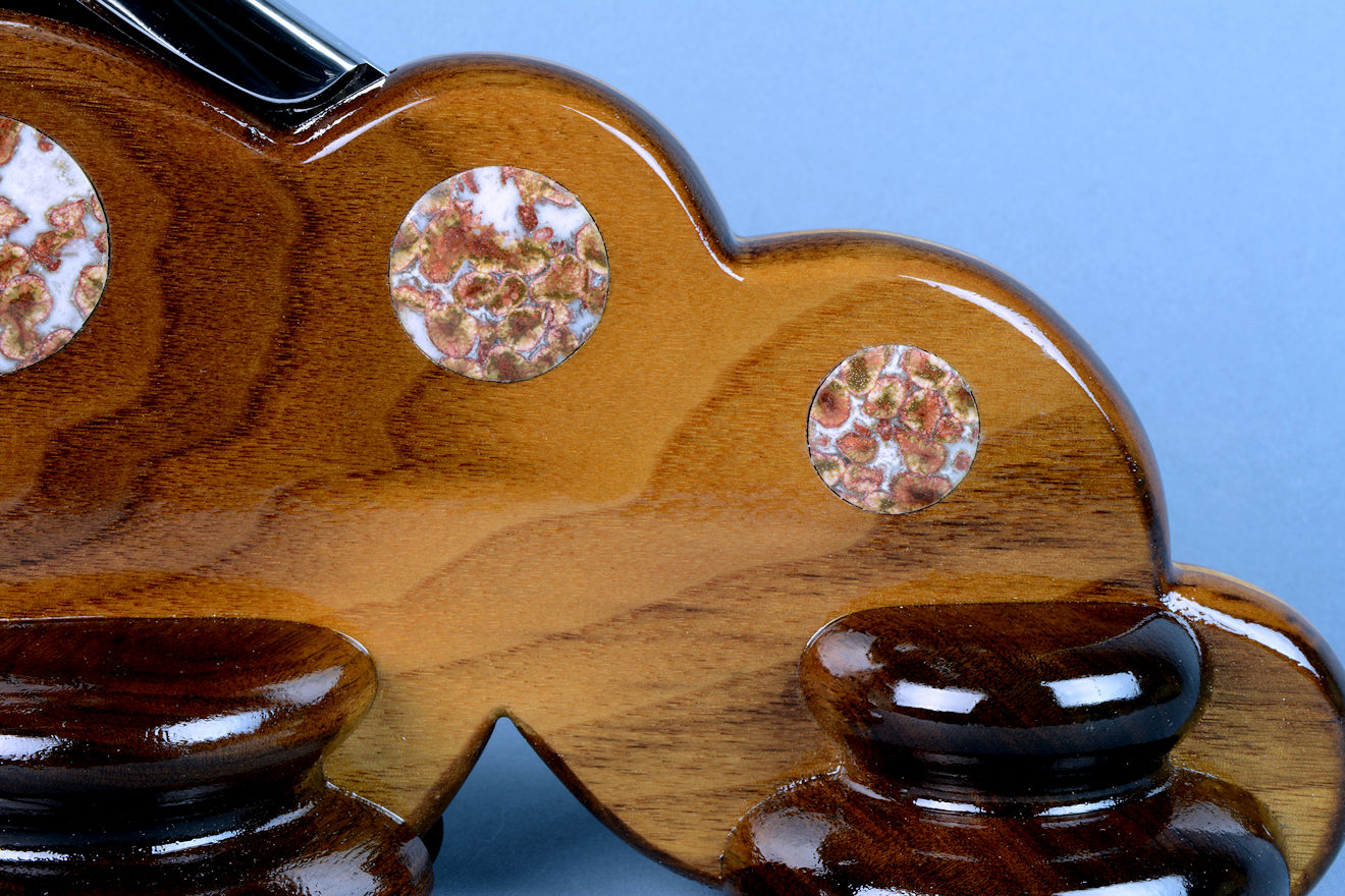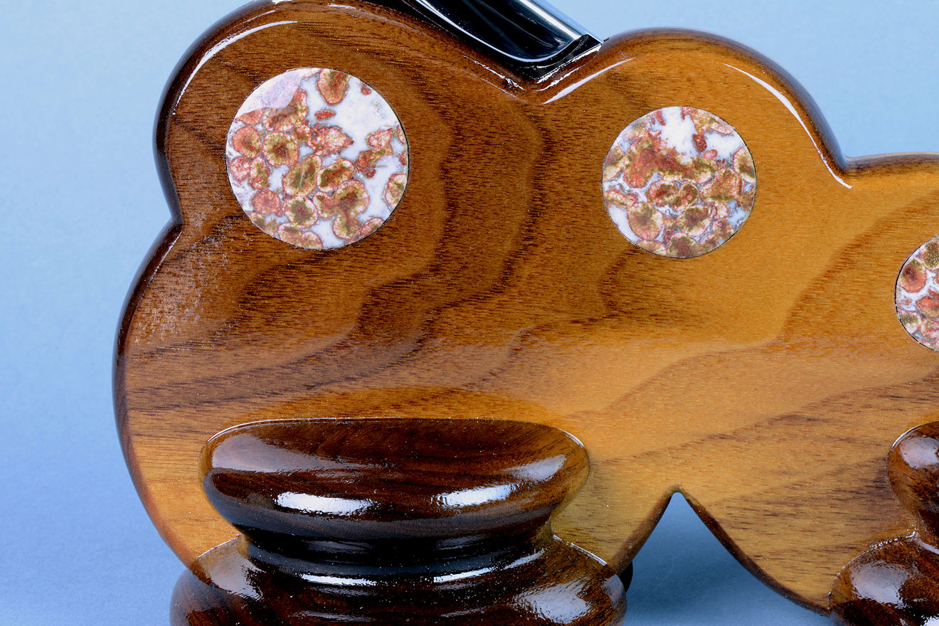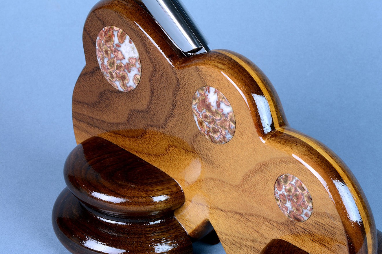 - Stand: American Black Walnut, Ash Hardwoods, Poppy Jasper Gemstone Cabochon Inlays, Neoprene Feet
