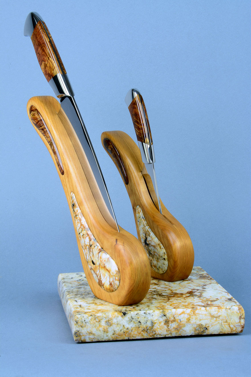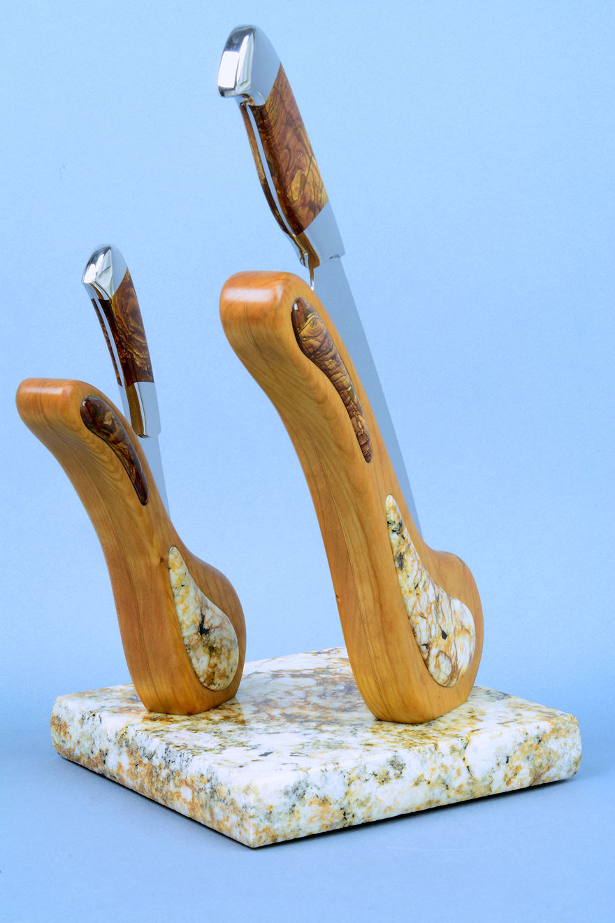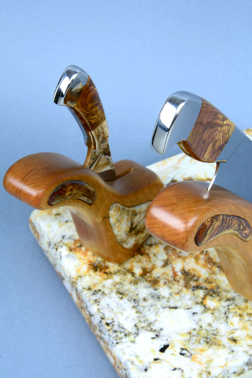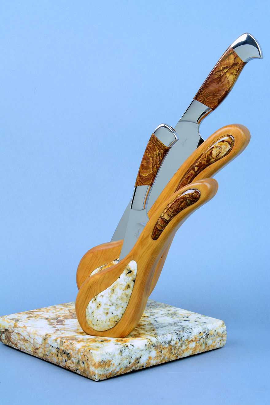 In the photo above, you can experience the beauty and arrangement of the sculpted stand without the knives. No other person in the world, no source anywhere is as dedicated to the full concept of the knife arrangement and completion. I hand cut, carved, and polished all of the stone to a bright glassy finish, and rounded and polished the edges of the solid Delicatus Gold Granite base. The Black Cherry hardwood forms are mounted with stainless steel screws through the granite, and the base block has inlaid neoprene feet to protect any surface the stand rests upon, while allowing air to circulate underneath for sanitation and cleanliness. This is a massive block and stand, making the entire piece extremely stable and safe.