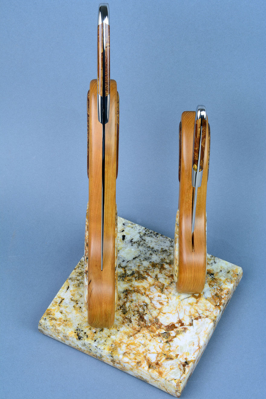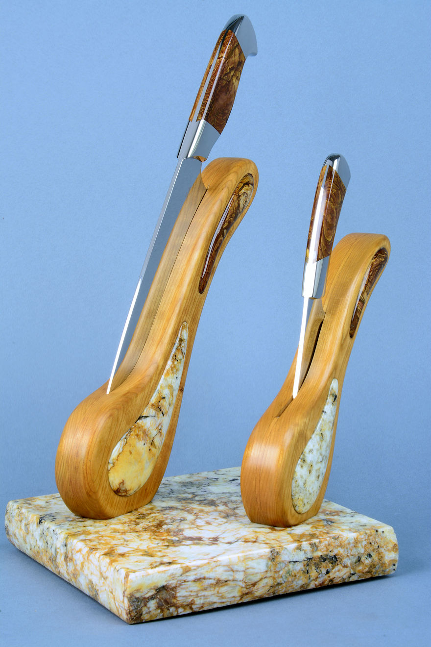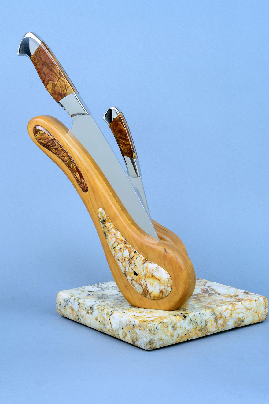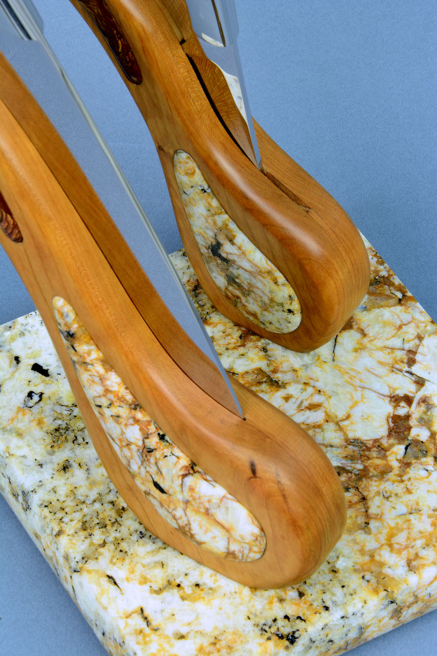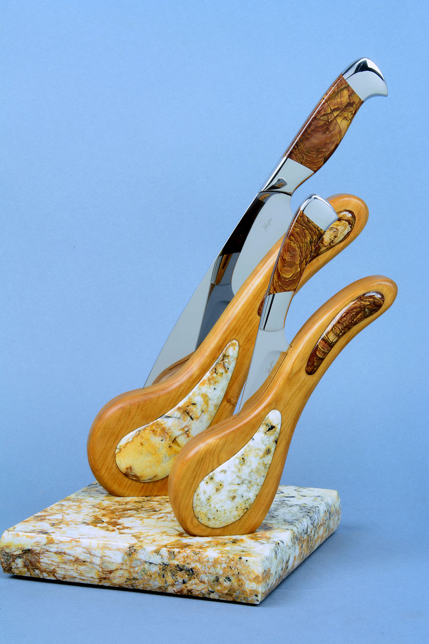 In the photo above, you can experience the beauty and arrangement of the sculpted stand without the knives. No other person in the world, no source anywhere is as dedicated to the full concept of the knife arrangement and completion. I hand cut, carved, and polished all of the stone to a bright glassy finish, and rounded and polished the edges of the solid Delicatus Gold Granite base. The Black Cherry hardwood forms are mounted with stainless steel screws through the granite, and the base block has inlaid neoprene feet to protect any surface the stand rests upon, while allowing air to circulate underneath for sanitation and cleanliness. This is a massive block and stand, making the entire piece extremely stable and safe.
