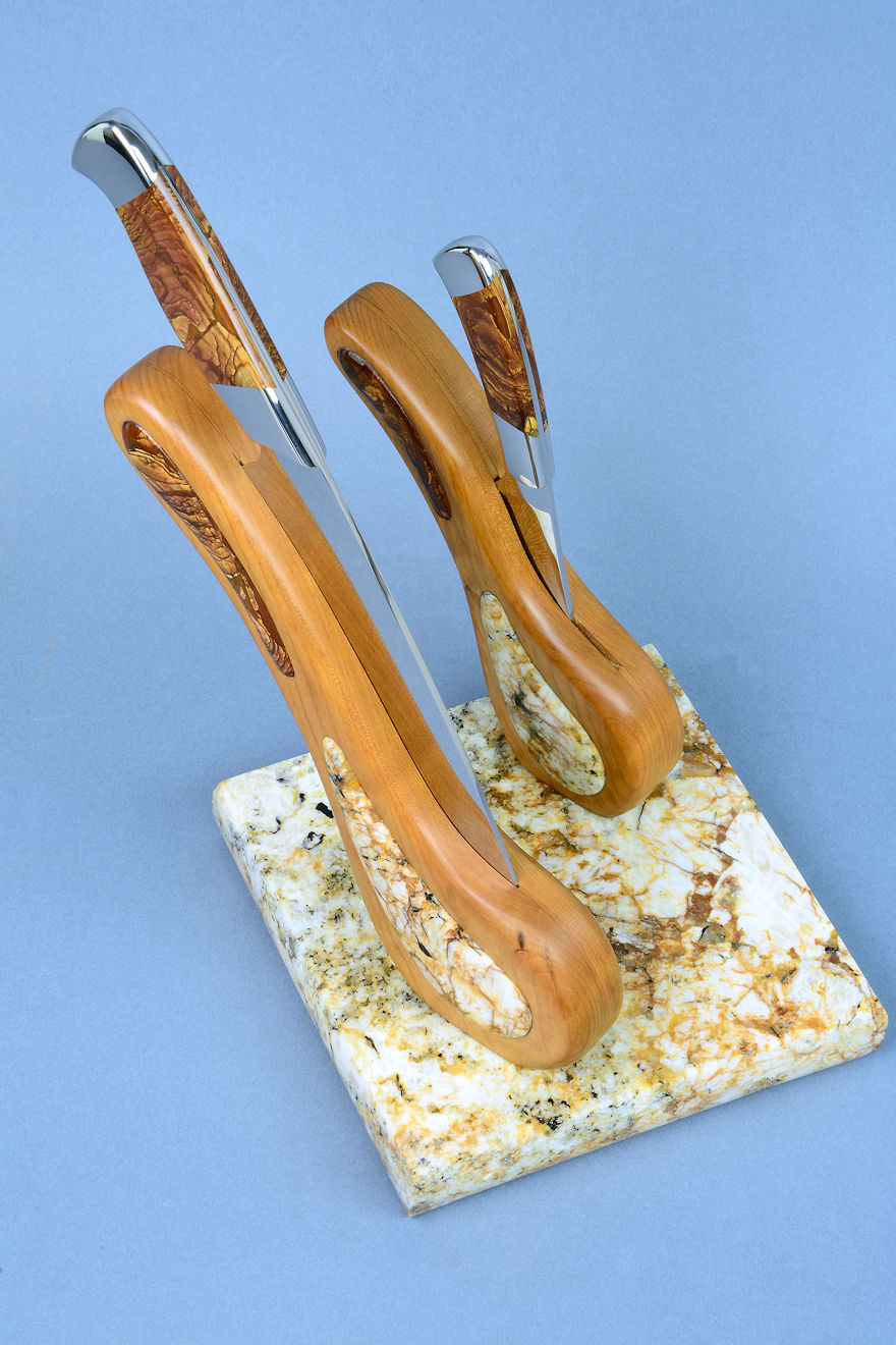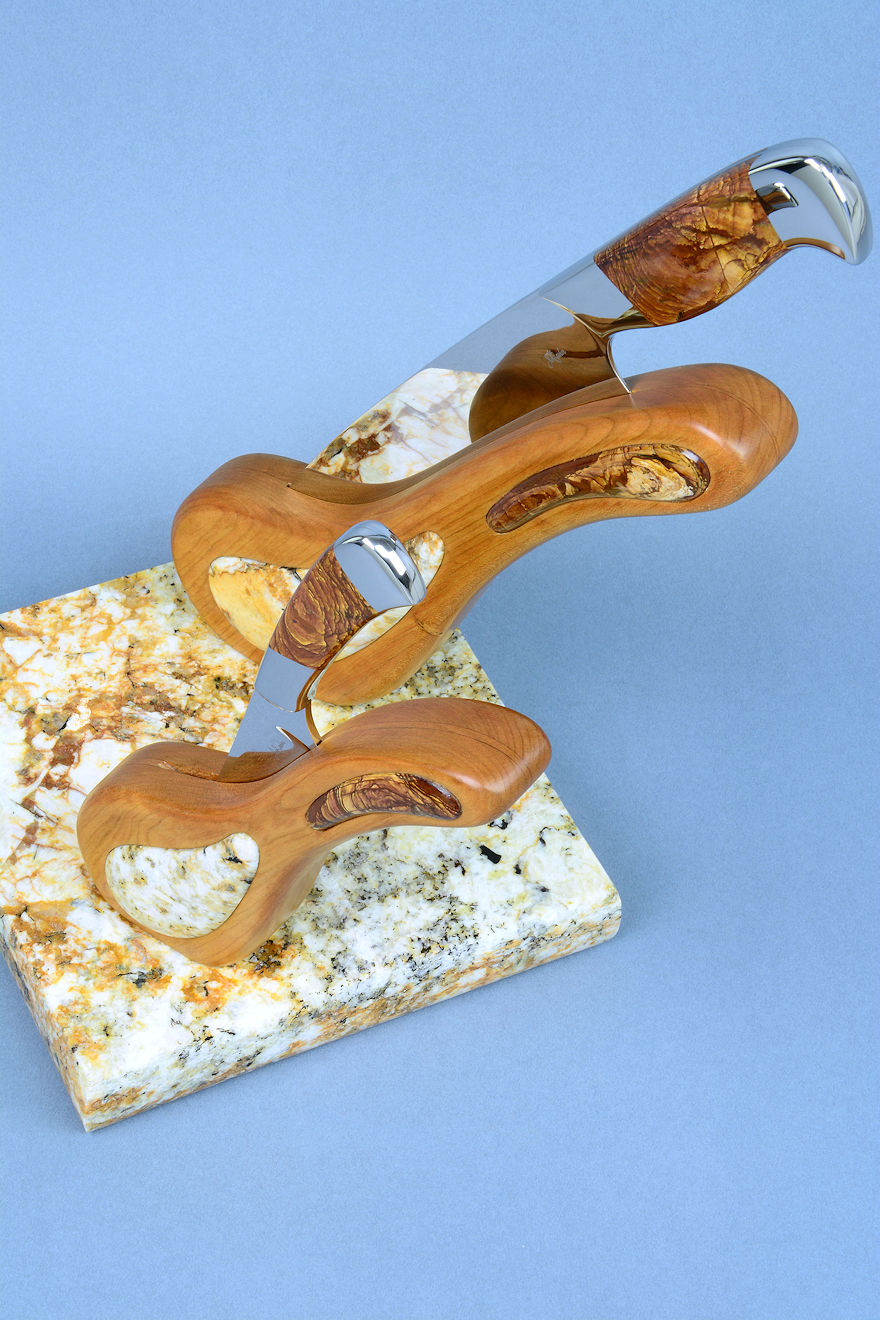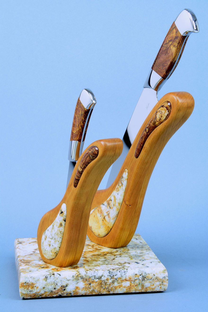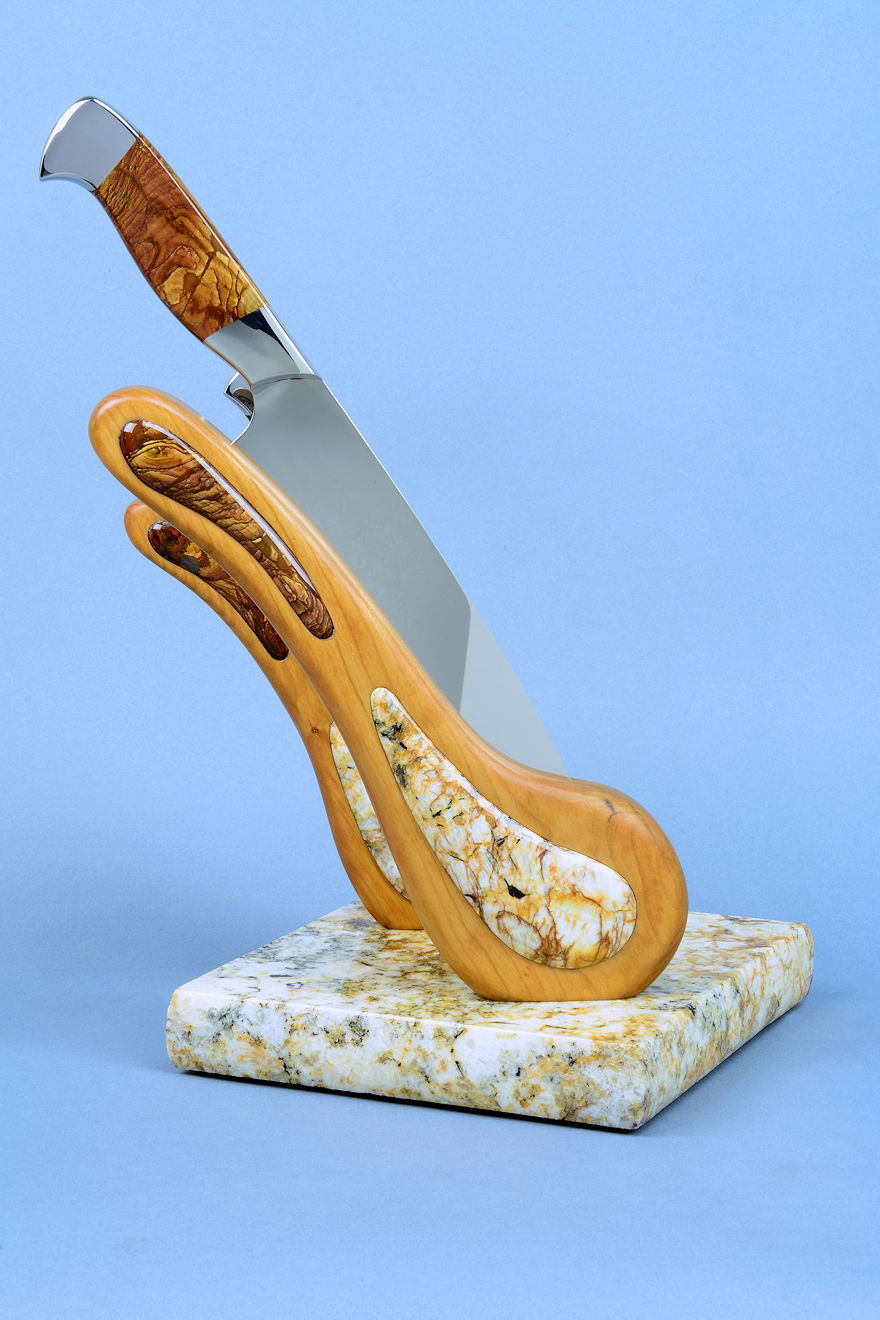 In the photo above, you can experience the beauty and arrangement of the sculpted stand without the knives. No other person in the world, no source anywhere is as dedicated to the full concept of the knife arrangement and completion. I hand cut, carved, and polished all of the stone to a bright glassy finish, and rounded and polished the edges of the solid Delicatus Gold Granite base. The Black Cherry hardwood forms are mounted with stainless steel screws through the granite, and the base block has inlaid neoprene feet to protect any surface the stand rests upon, while allowing air to circulate underneath for sanitation and cleanliness. This is a massive block and stand, making the entire piece extremely stable and safe.