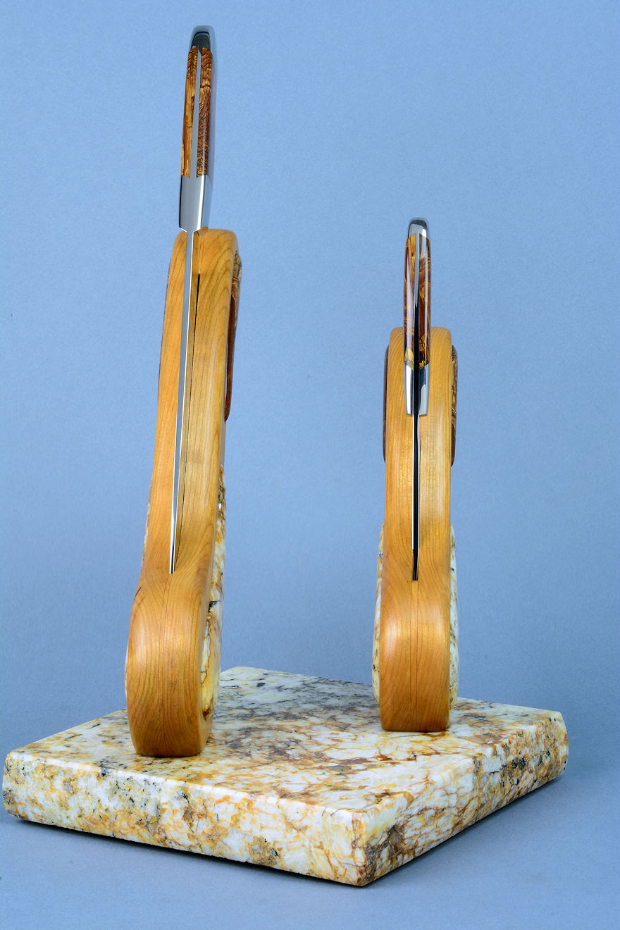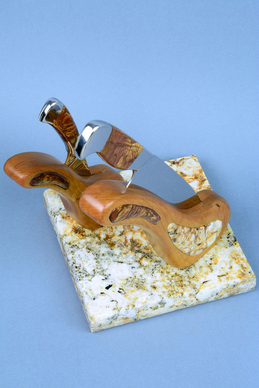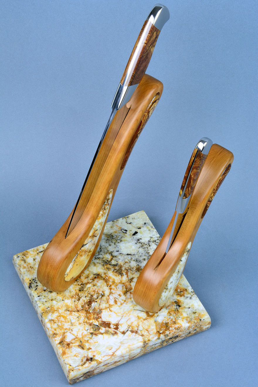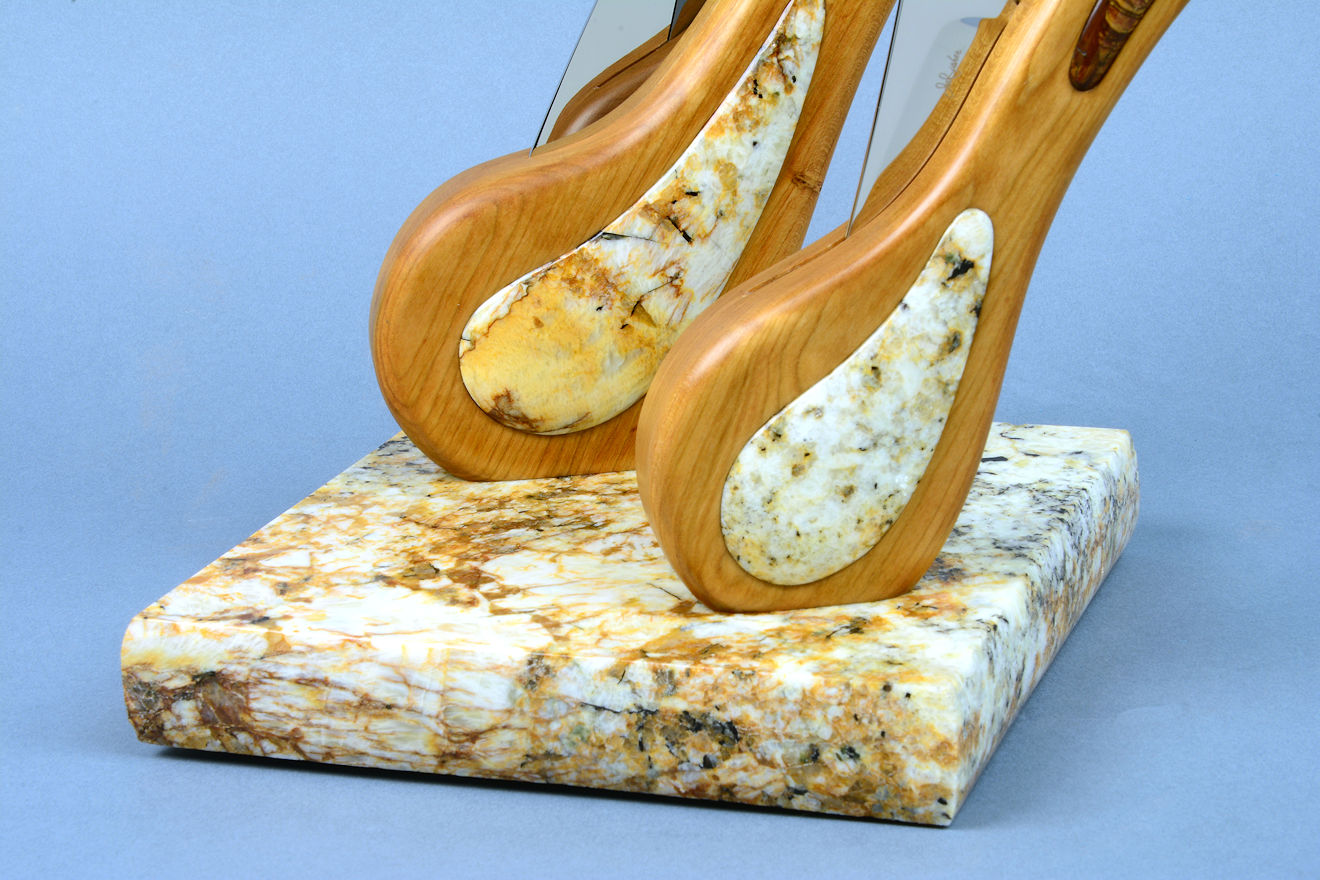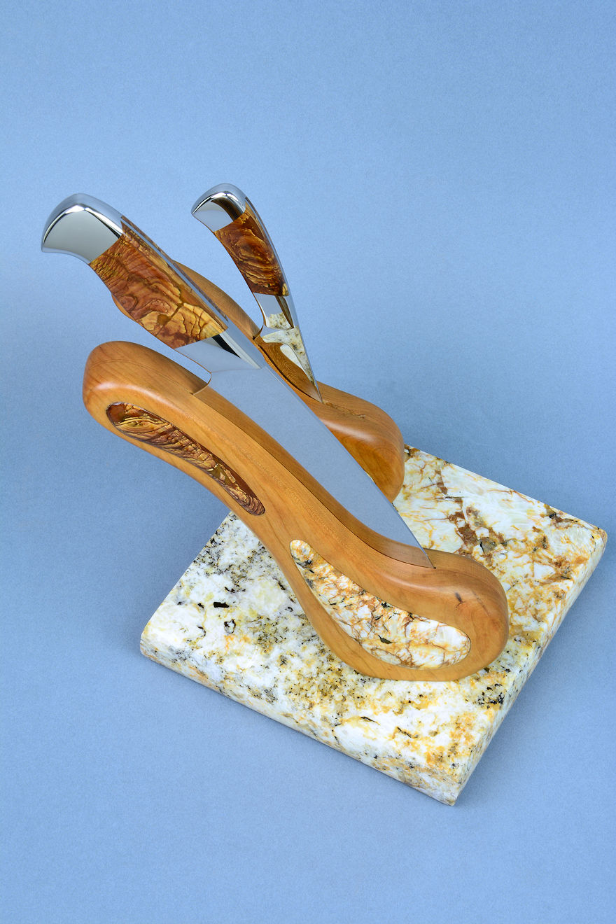In the photo above, you can experience the beauty and arrangement of the sculpted stand without the knives. No other person in the world, no source anywhere is as dedicated to the full concept of the knife arrangement and completion. I hand cut, carved, and polished all of the stone to a bright glassy finish, and rounded and polished the edges of the solid Delicatus Gold Granite base. The Black Cherry hardwood forms are mounted with stainless steel screws through the granite, and the base block has inlaid neoprene feet to protect any surface the stand rests upon, while allowing air to circulate underneath for sanitation and cleanliness. This is a massive block and stand, making the entire piece extremely stable and safe.