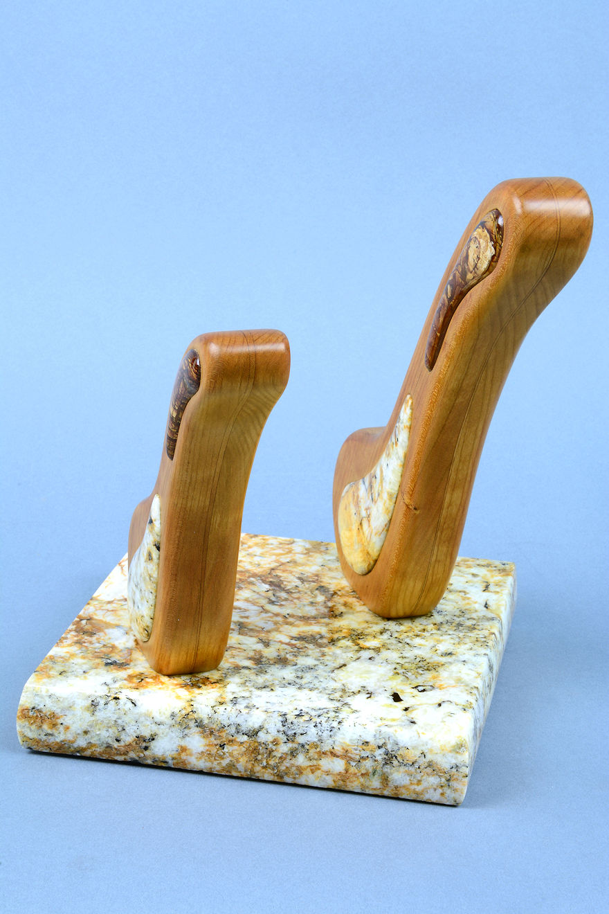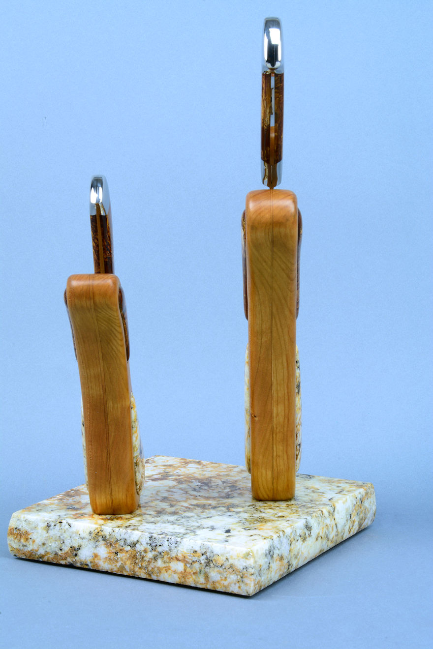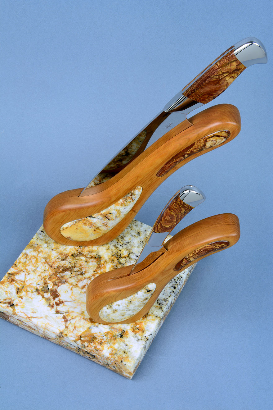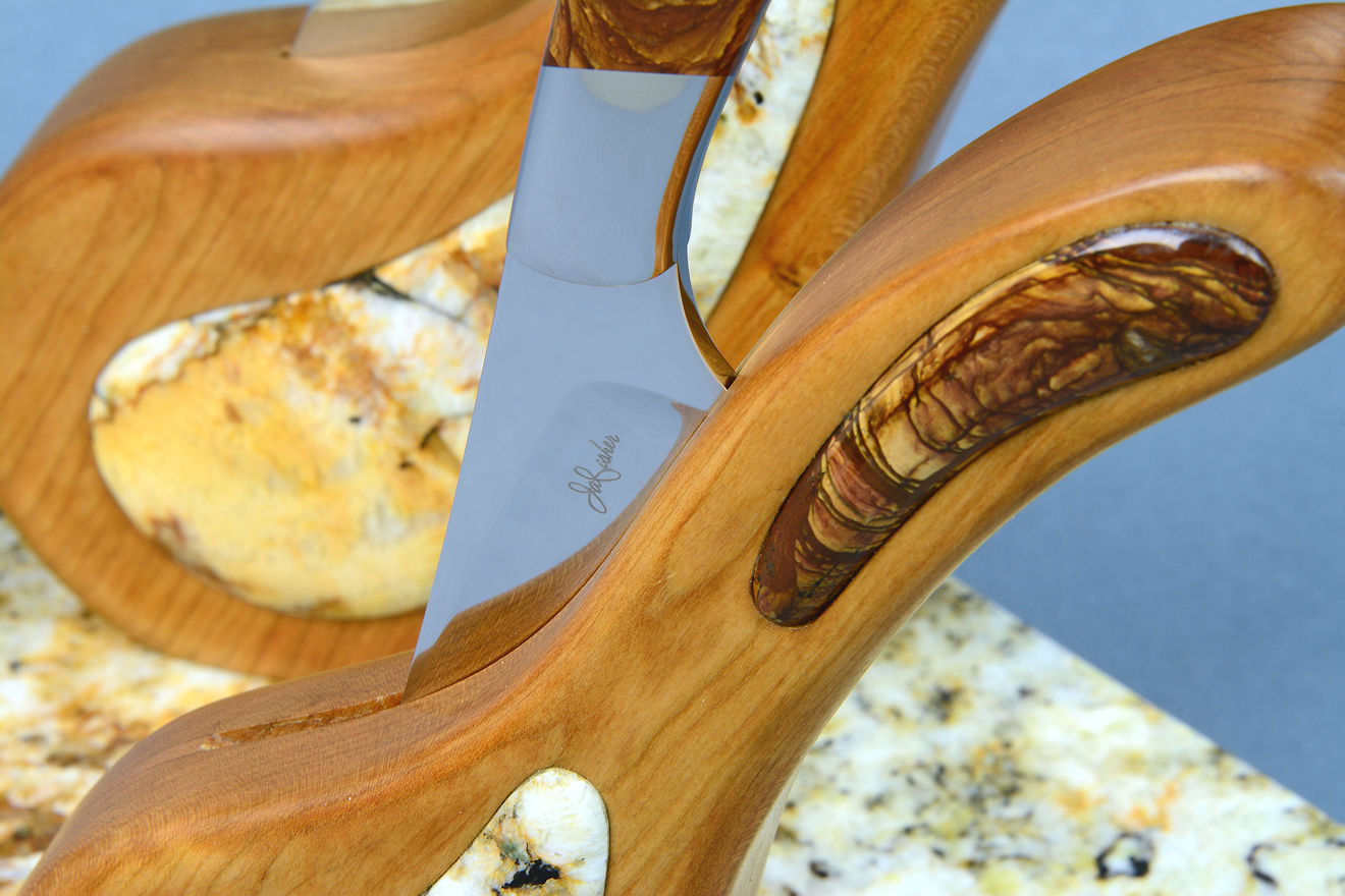 In the photo above, you can experience the beauty and arrangement of the sculpted stand without the knives. No other person in the world, no source anywhere is as dedicated to the full concept of the knife arrangement and completion. I hand cut, carved, and polished all of the stone to a bright glassy finish, and rounded and polished the edges of the solid Delicatus Gold Granite base. The Black Cherry hardwood forms are mounted with stainless steel screws through the granite, and the base block has inlaid neoprene feet to protect any surface the stand rests upon, while allowing air to circulate underneath for sanitation and cleanliness. This is a massive block and stand, making the entire piece extremely stable and safe.
