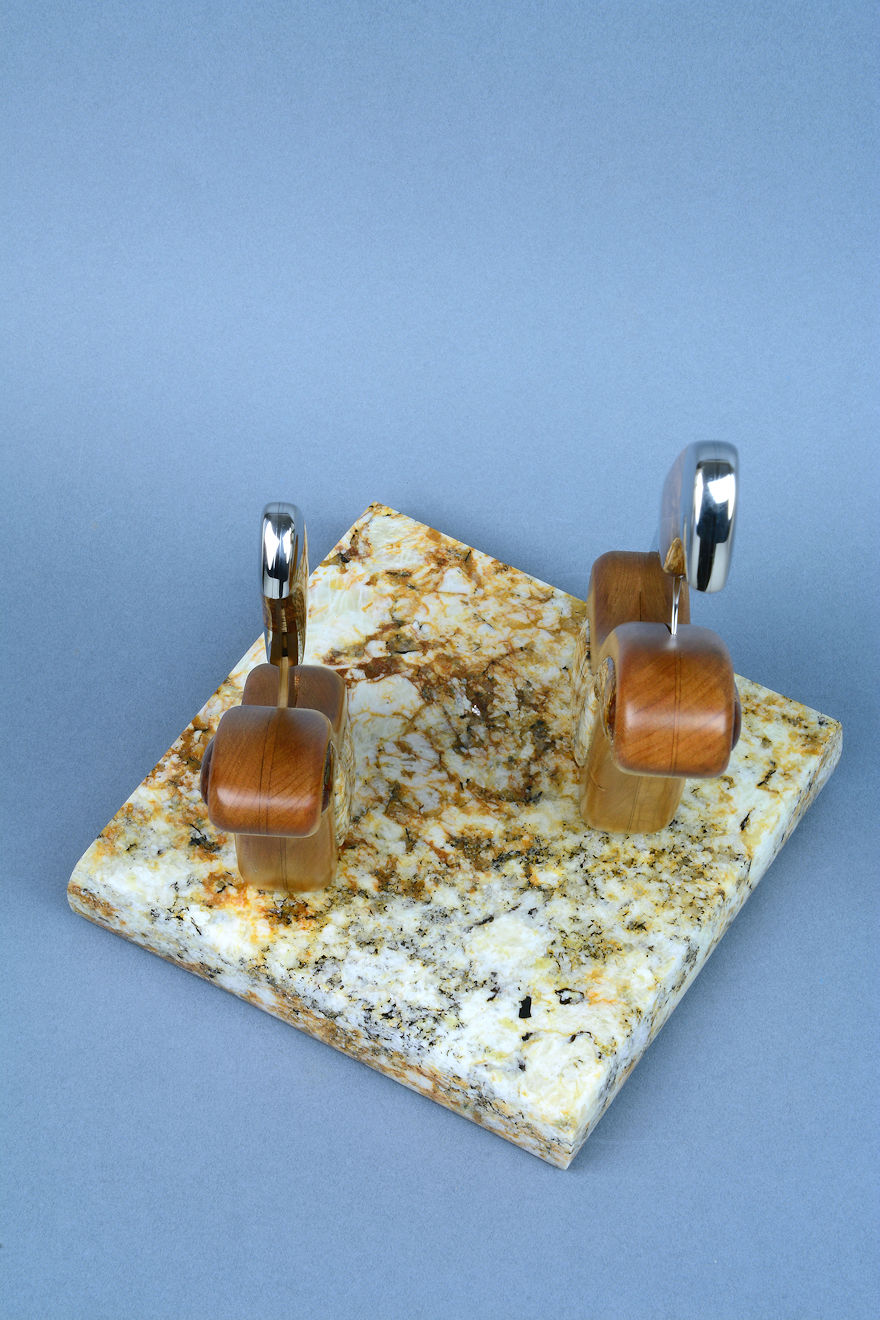 The photo above shows the bottom of the Delicatus Gold Granite base, with the inset neoprene feet, the screw mounting holes, and the legend plate. I cut a special inset for the legend plate to protect it; I made it in engraved black lacquered brass, permanently sealed and mounted into the base for posterity. Even if the documentation is lost, the provenance remains with the artwork.