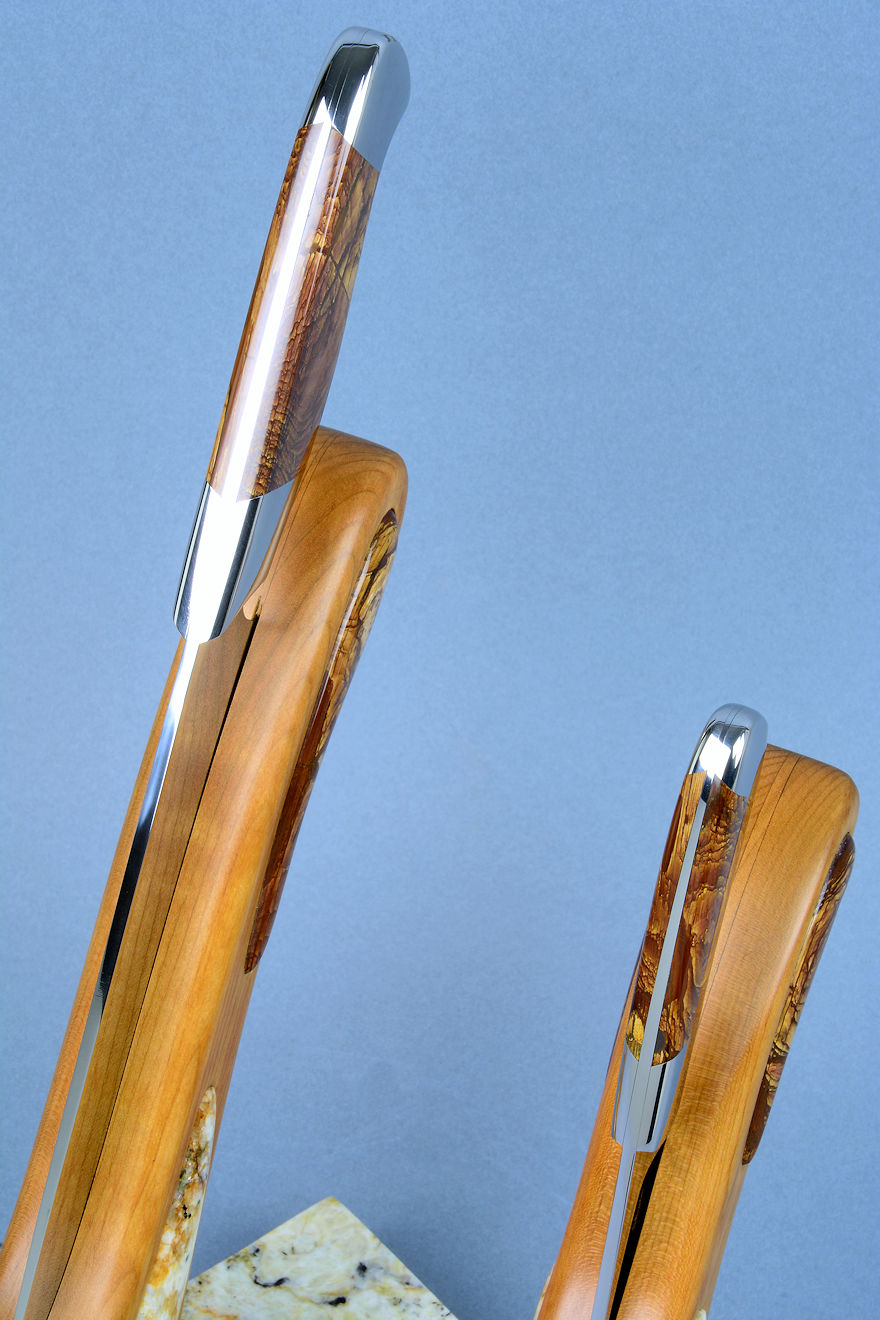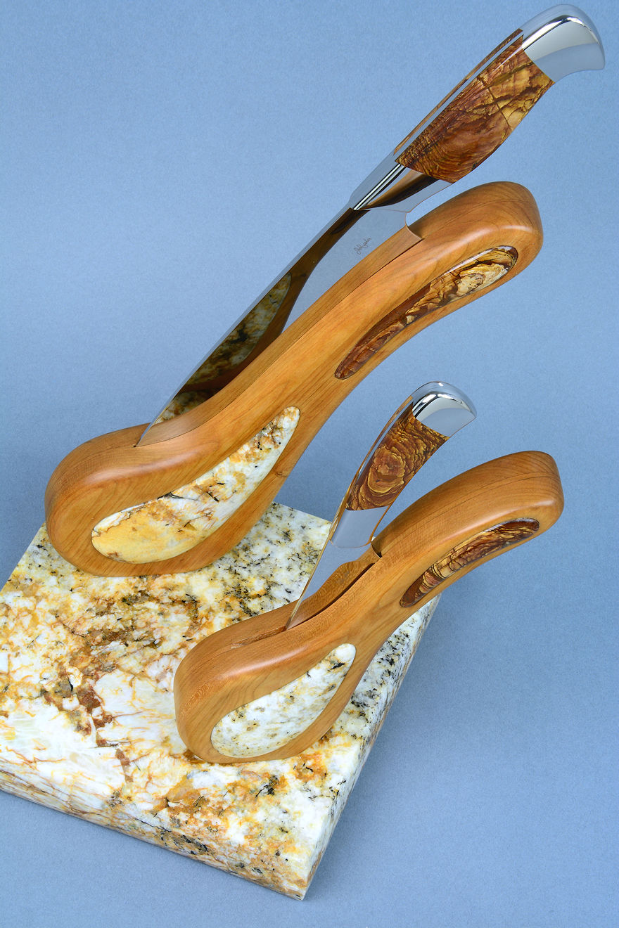 A classic pair of knives is a traditional chef's knife based on the French Sabatier design, paired with a small to medium-sized knife with a more slender tip profile. In this chef's pair, I've made my popular Concordia chef's knife with my Talitha utility knife. I've used the finest premium materials, with sculptural stands that incorporate color, design, shape, and rhythm to the entire piece. This is one of the very finest chef's pair of knives you will ever see, truly one of the very best ever made.