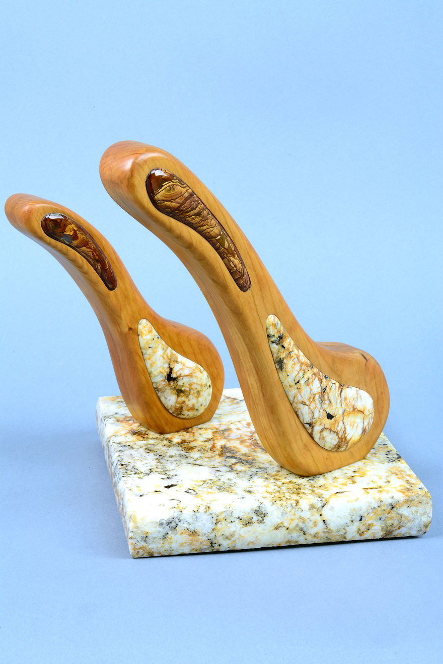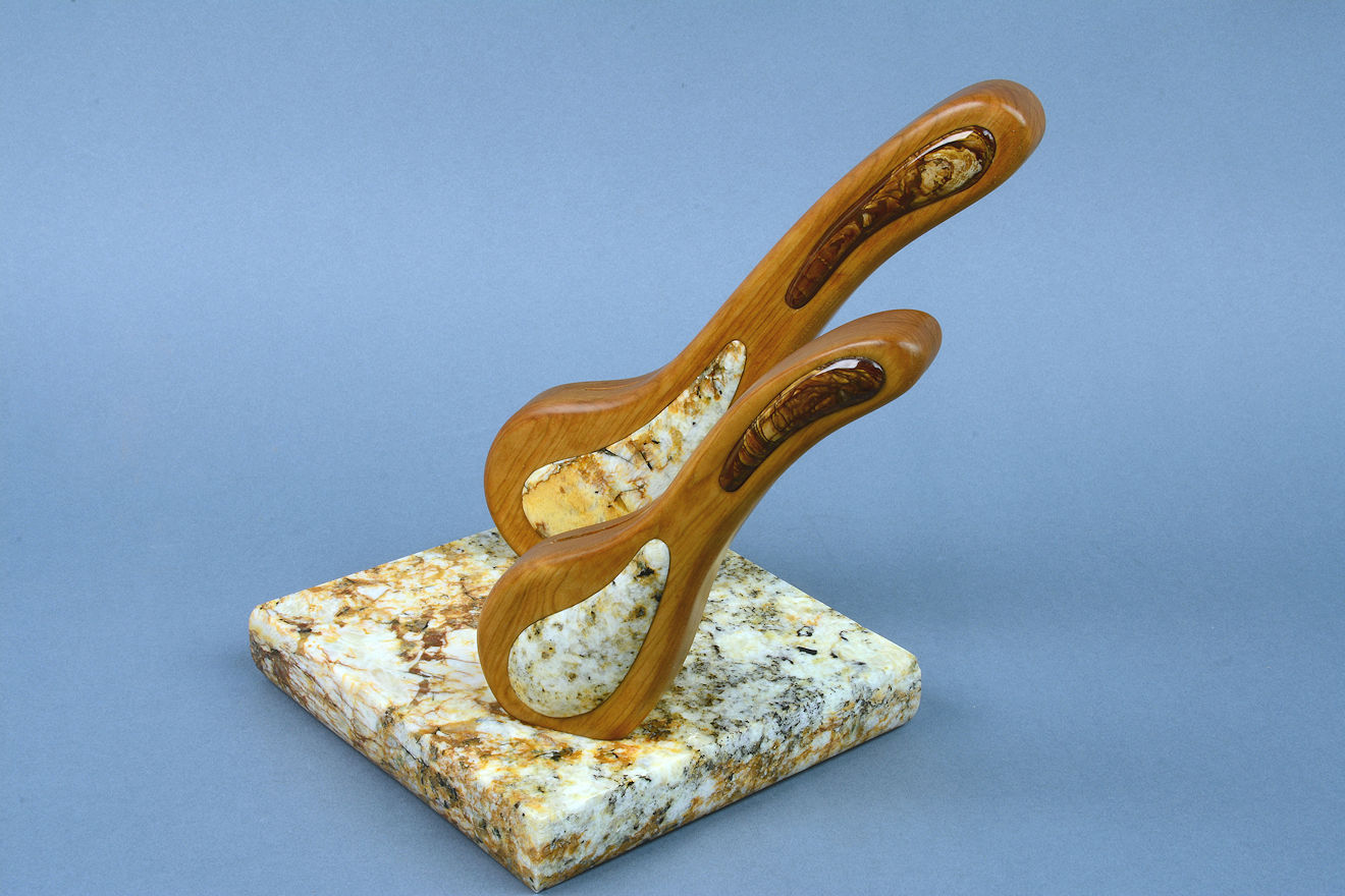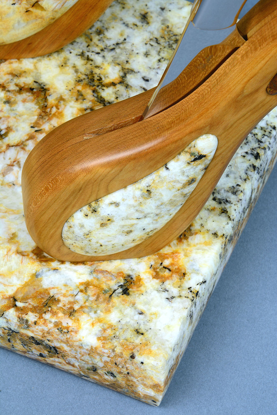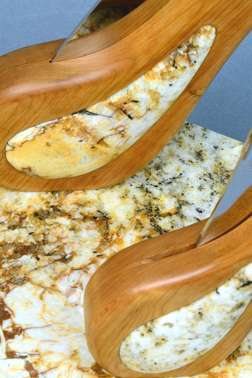 The Granite I chose is Delicatus Gold Granite from Brazil. While this granite is available in many different tones and color depths, I chose complimentary color and patterned pieces, cut, shaped, carved, ground, and polished them to fit the stand and blend well with the Jasper and Cherry components. You can see the colors almost bleed from one piece to the next, even though the materials are strikingly different. This is a hard, tough granite, an everlasting stone. The bold patterns are echoed in the substantial carved polished granite inlays.