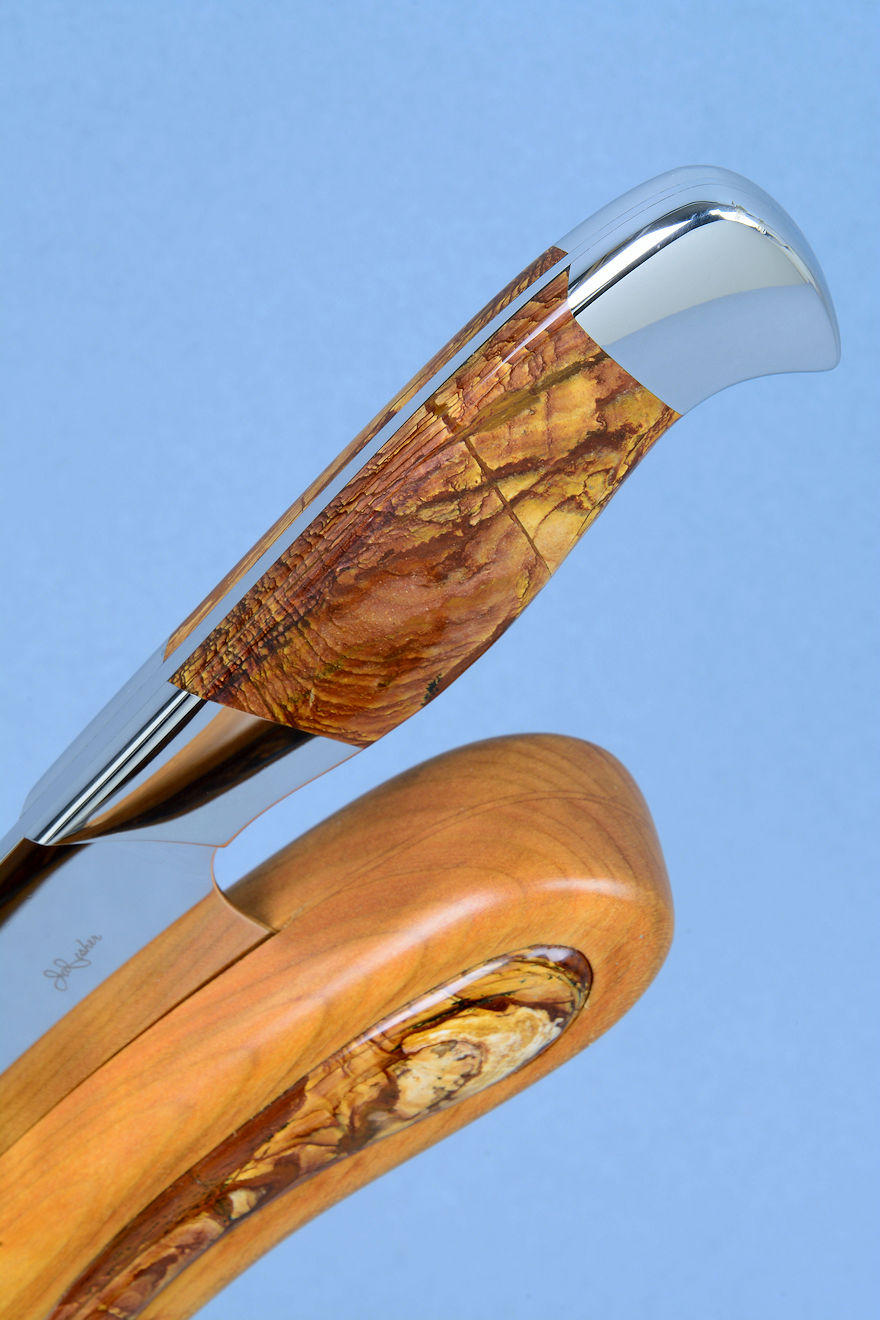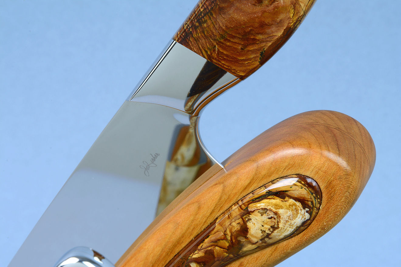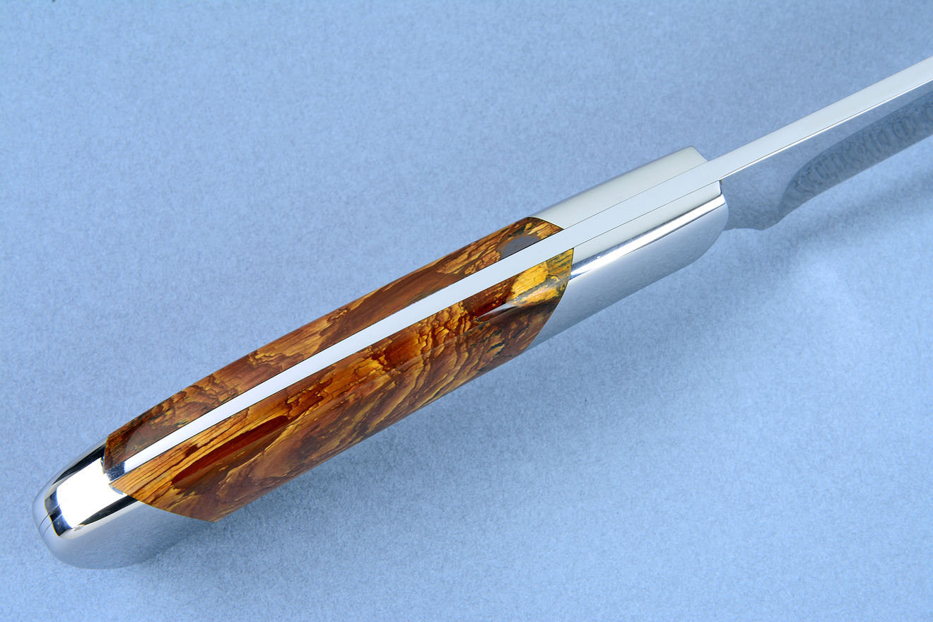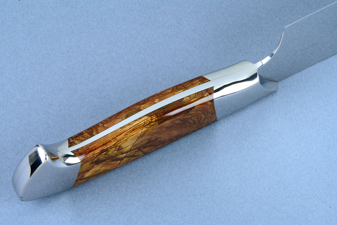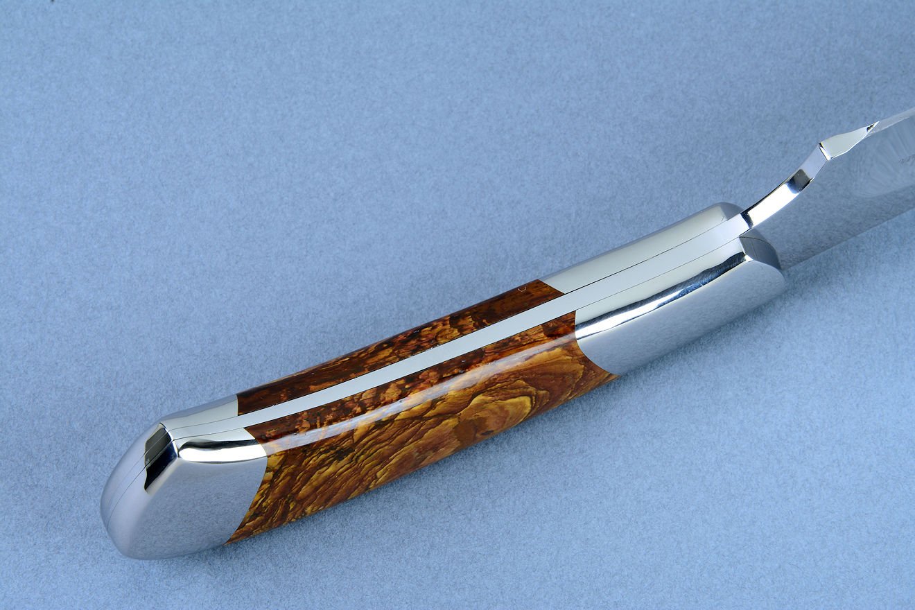 The bolsters of both of the knives are made of 304 high nickel, high chromium austenitic stainless steel. This is the same steel used in Food Contact Safe and approved restaurant equipment, a steel tough enough to be used for stainless steel nuts, bolts, and fasteners. This is a high chromium steel that requires no care whatever; it's extremely corrosion-resistant and will not darken or oxidize in any way, ever. I've mounted the bolsters with zero-clearance peened pins; they are permanently bonded to the knife tangs. The bonding is actually stronger than spot welds since the pins penetrate completely through the tang and are swelled in place. The bolsters are sealed with Food Contact Safe sealant, so the knives meet all Food Contact Safety requirements. The bolsters are rounded, contoured, and polished for comfort, and are dovetailed to lock and bed the handle scales to the fully tapered tangs. I chose to offer a very clean, smooth spine with no filework for the easiest cleaning possible.