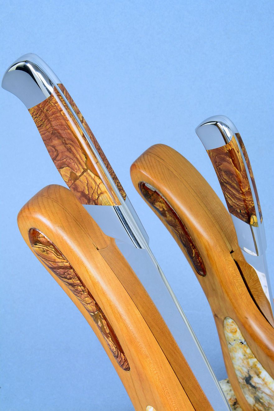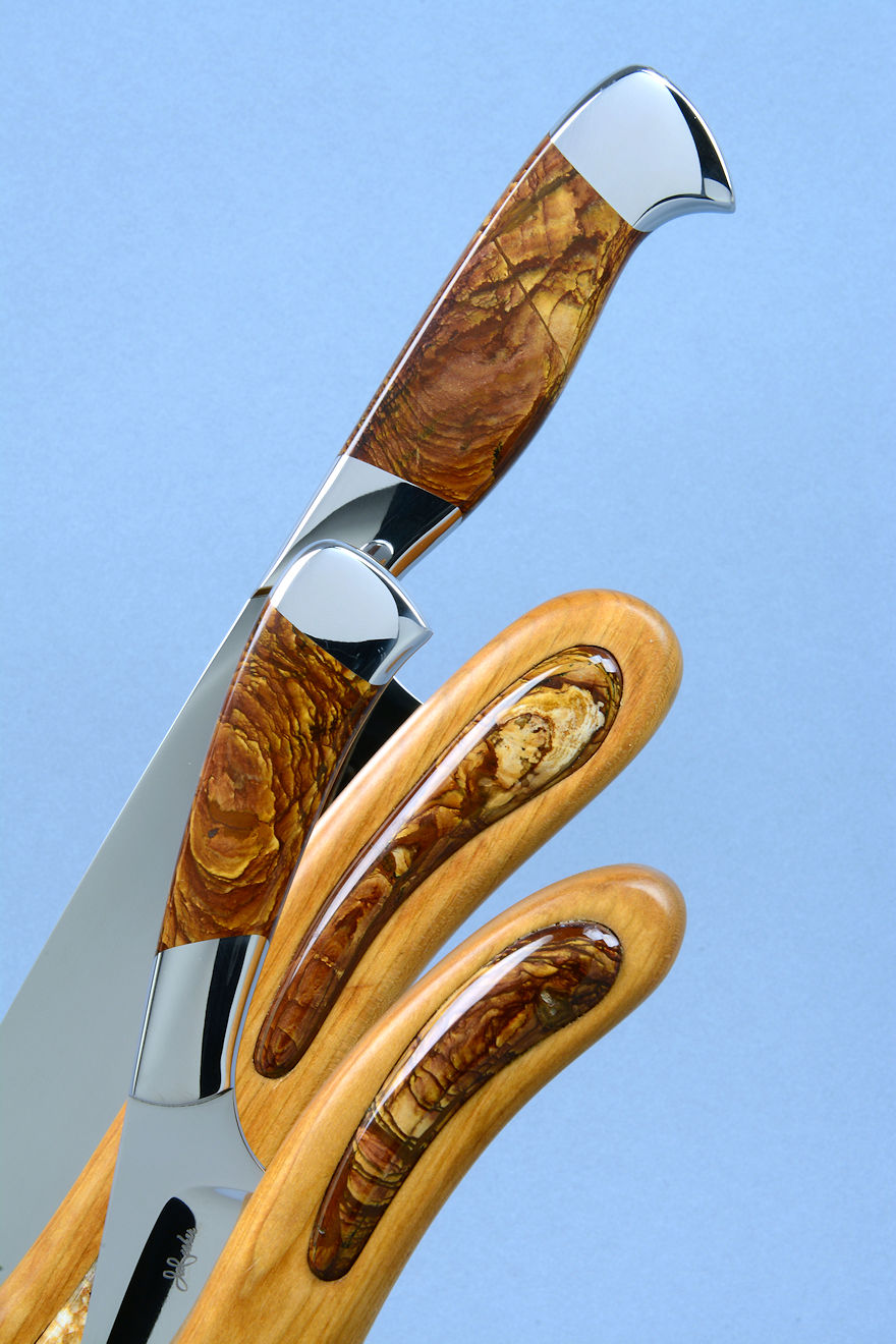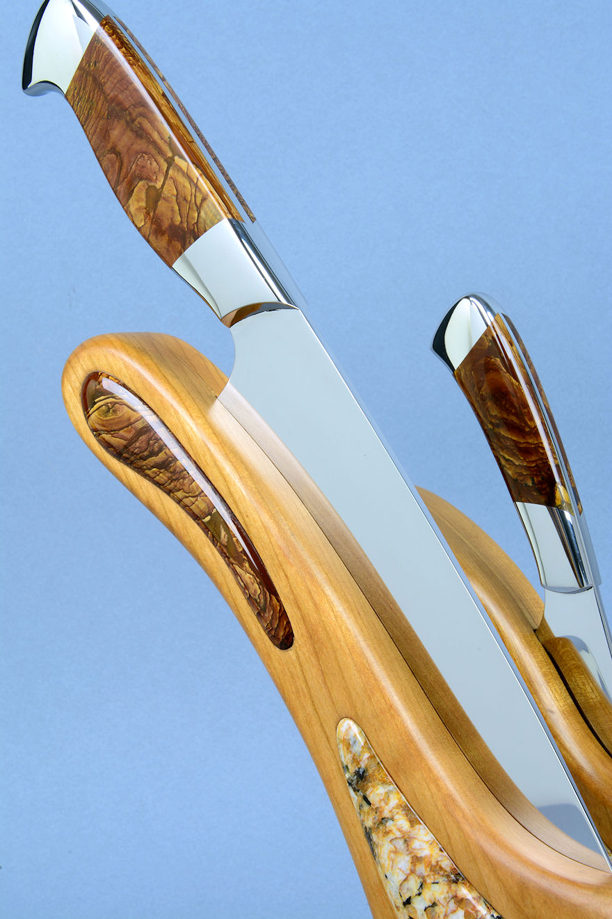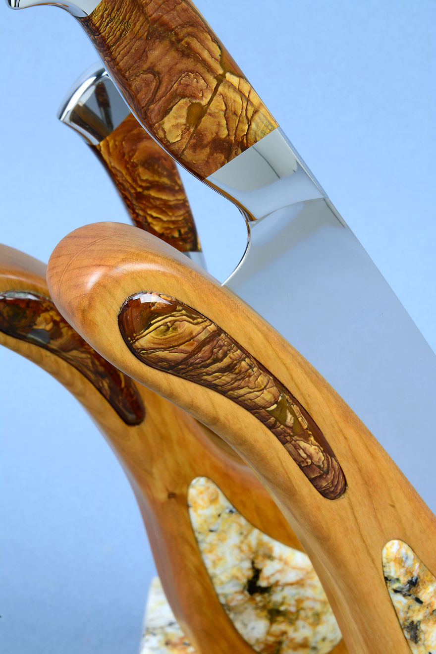 The patterned and hand-carved inlaid gemstones in the stand represent a tremendous amount of work. This is why you will find no knife stand anywhere, made by anyone in the world like what you see here. Focusing on just one inlay in the photo above, I created large domed, finished and polished carvings of gemstone, carefully fitted and mounted in hand-carved American Black Cherry hardwood. These gemstones are polished and match the handles beautifully, bringing the piece together just as I envisioned.