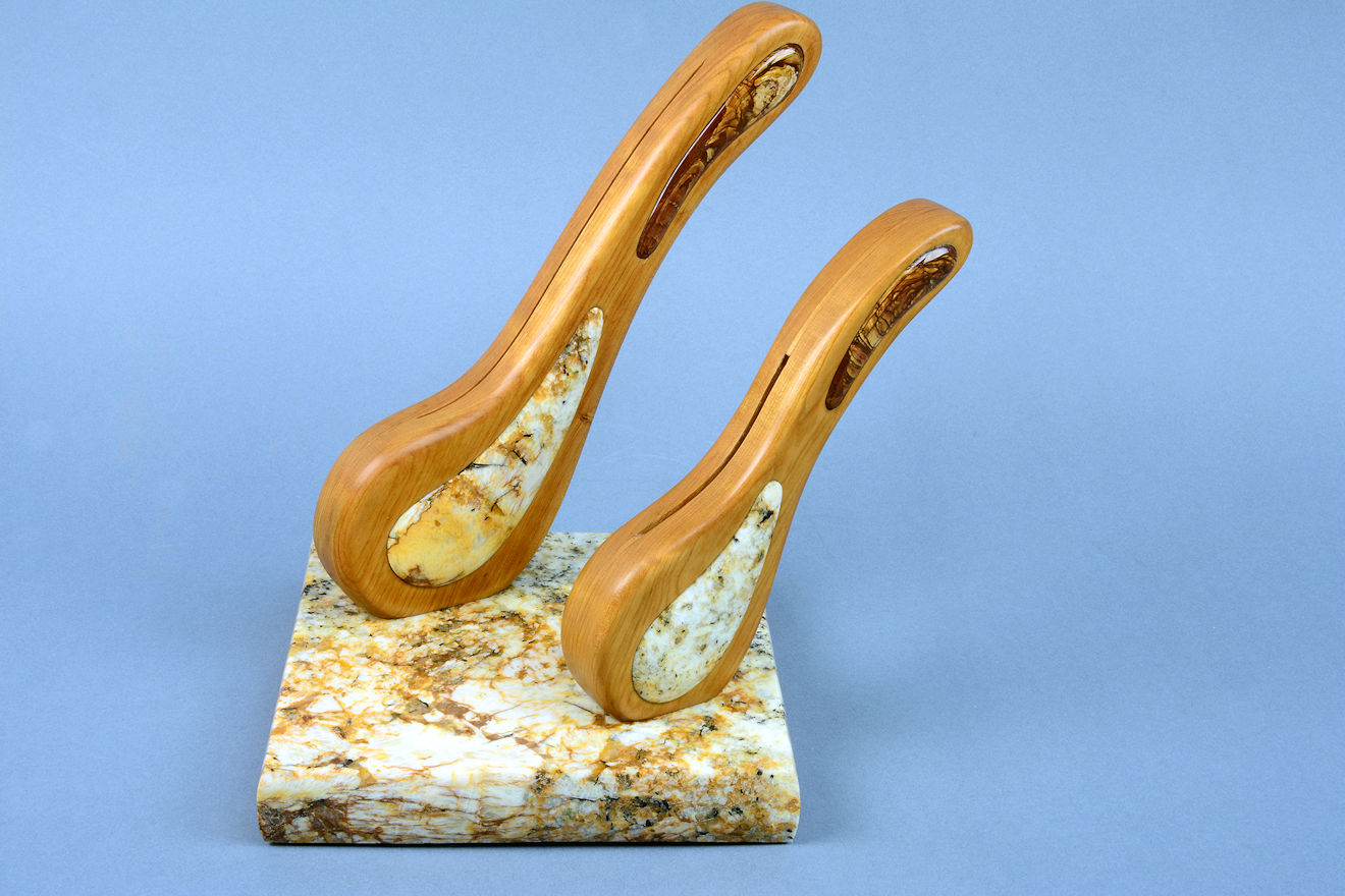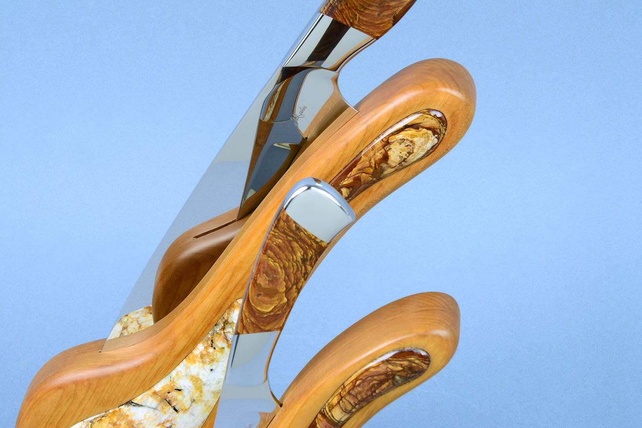 There are two main stand forms, each made of American Black Cherry, frequently simply called Cherry hardwood. This is a very fine American wood from our eastern hardwood forests. Black Cherry is not black in color; the name refers to the tree. You can see the natural color of the hardwood in this stand. The hand-carved and hand-finished forms are shaped in the idea of a splash, or paisley, or dolphin form that is one of the oldest decorative forms in human history. Some even see musical notes in the shape of the form. Each carved sculpture is made of several components of Cherry, with snug slots for the blade points and cutting edges. This allows the knives to be displayed completely while offering no cutting edges to the fingers for safety.