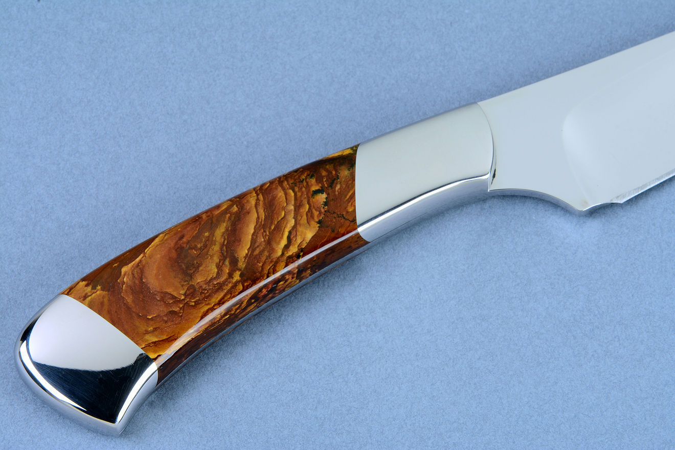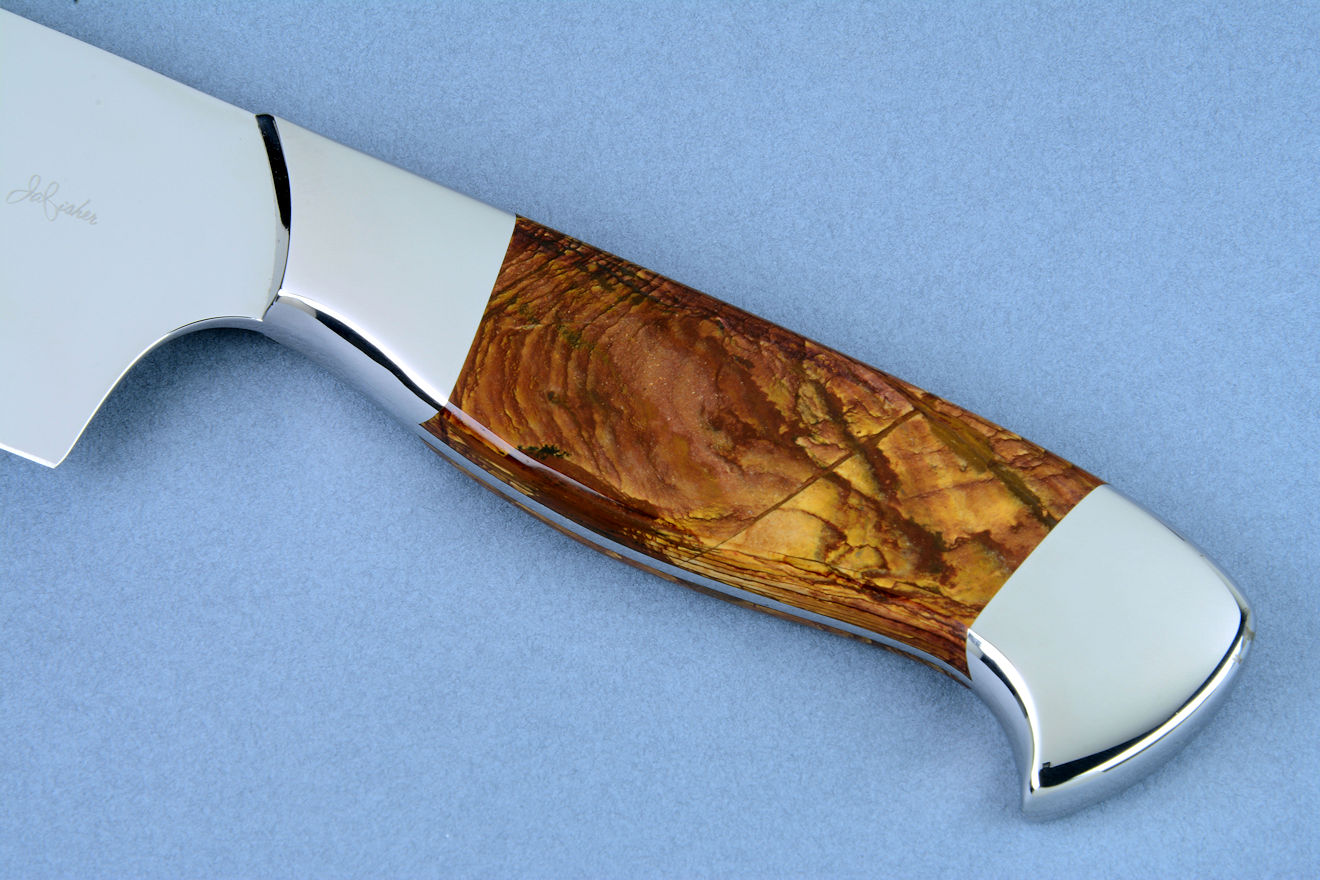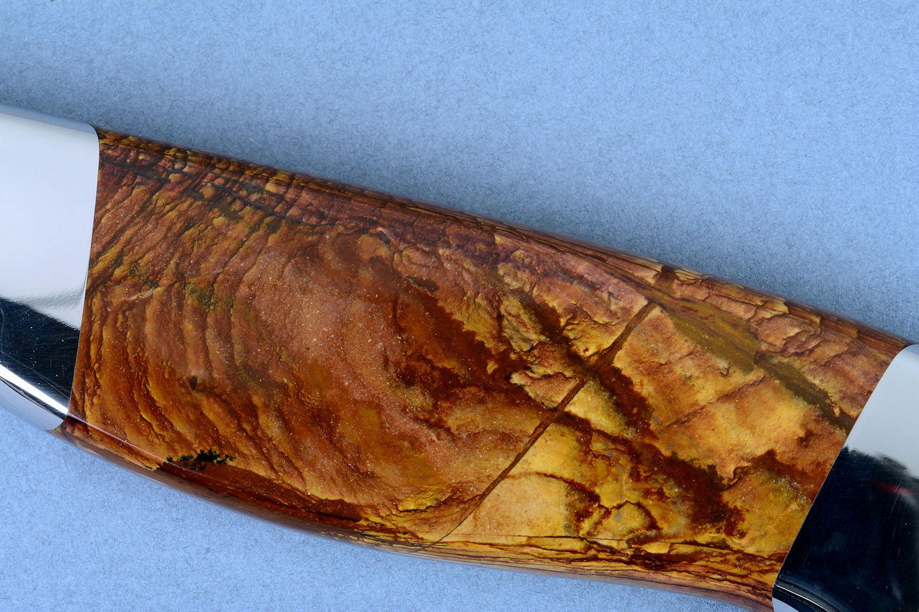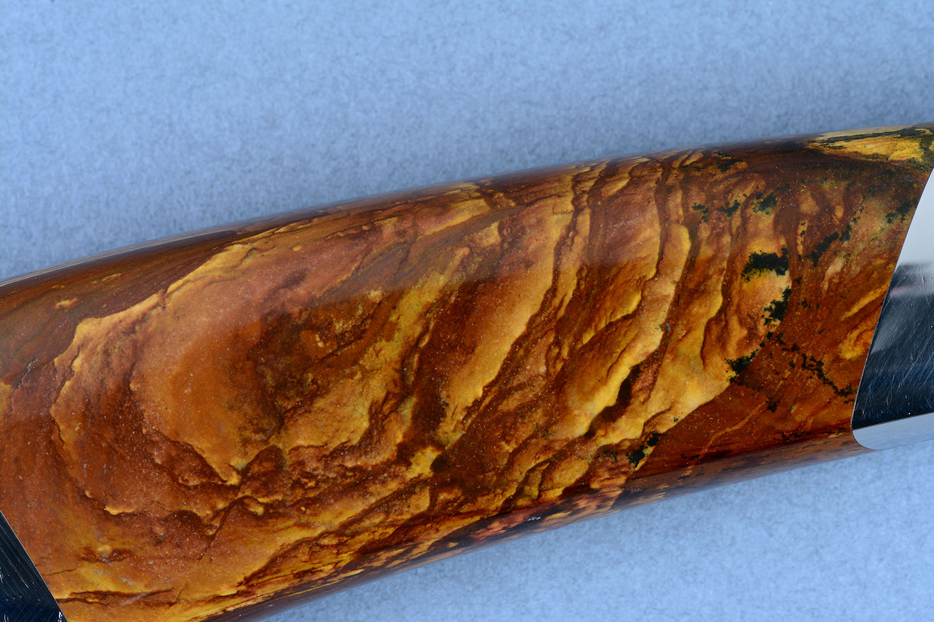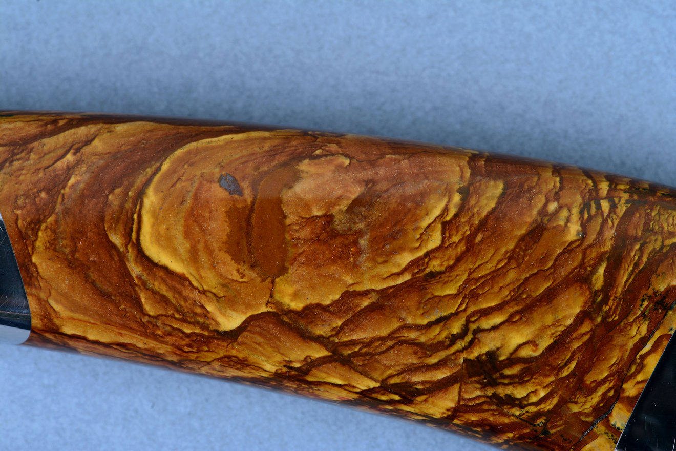 The natural handle material is stunning; it's hard, it's tough, and incredibly durable. This is Deschutes Jasper gemstone, coming from the Deschutes River area near Biggs Junction, Oregon. While the area is known for Biggs Jasper, the premium material found there is Deschutes Jasper. This is a finer, harder, and more even and compact form of the typical Biggs Jasper and it's richer in color and pattern. The scalloped shapes and curvy lines are interspersed with dendritic dark forms and is reminiscent of deserts and hillscapes. Jasper is a fine-grained cryptocrystalline quartz, very hard and durable, and the gemstone will literally outlast the blades. Think of the very oldest remains of man's tools; they are all hard, tough stones and rocks. This is why I call gemstone the eternal natural material.