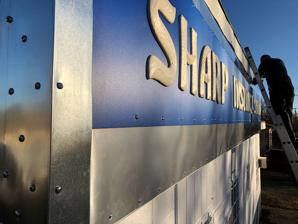 The lower part of the sign is covered in aluminum flashing, and I'll mount the address there in acrylic later. The top of the sign and the edges are covered in 4" x 6" galvanized flashing, to prevent any water from reaching the plywood. This also frames in the blue board. We used a ton of stainless steel truss head screws, everything that is exposed is protected or immune from corrosion.