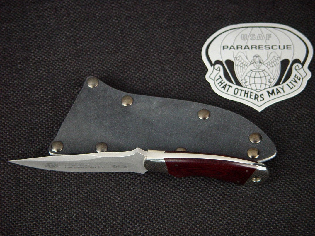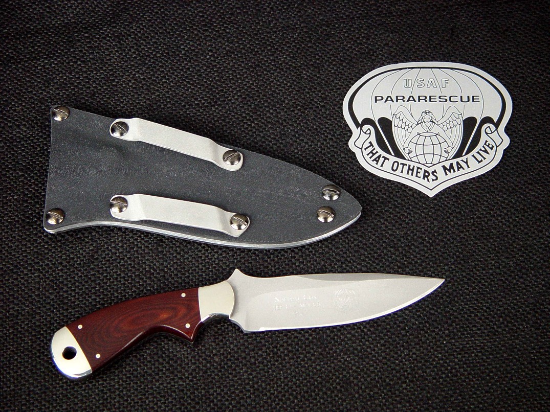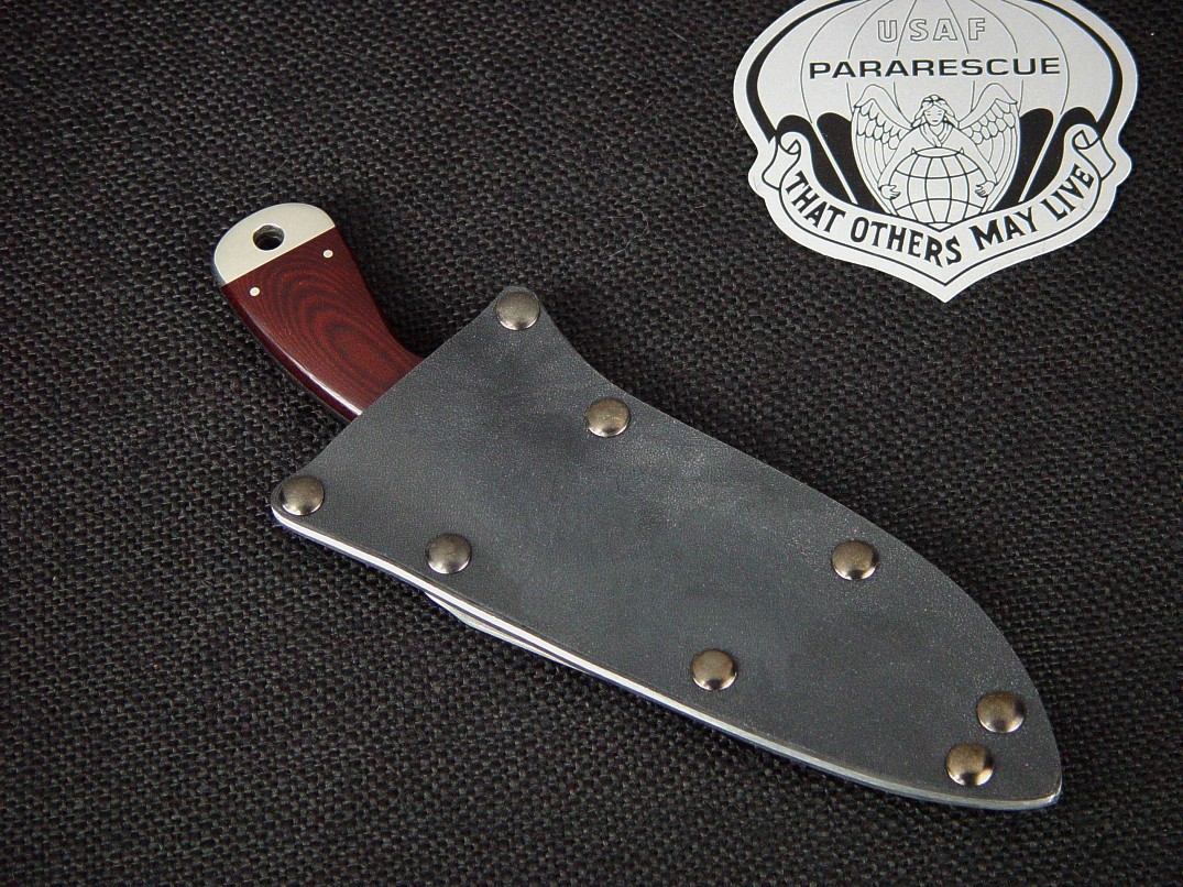 Custom made for a United States Air Force Pararescueman for his service duty use in Combat Search and Rescue, the Creature is a great design that combines a wide, strong blade of bead blasted and machine engraved 440C high chromium martensitic stainless steel blade, 304 high nickel high chromium stainless steel bolsters, and a burgundy or maroon linen Micarta phenolic handle. The handle and bolsters are polished for a smooth, crisp look and feel. The knife has a tension fit double thickness kydex sheath build over a 5052H32 corrosion resistant high strength aluminum welt frame and belt loops, secured with blued steel Chicago screws and posts. A tough, durable and ready knife for professional CSAR.