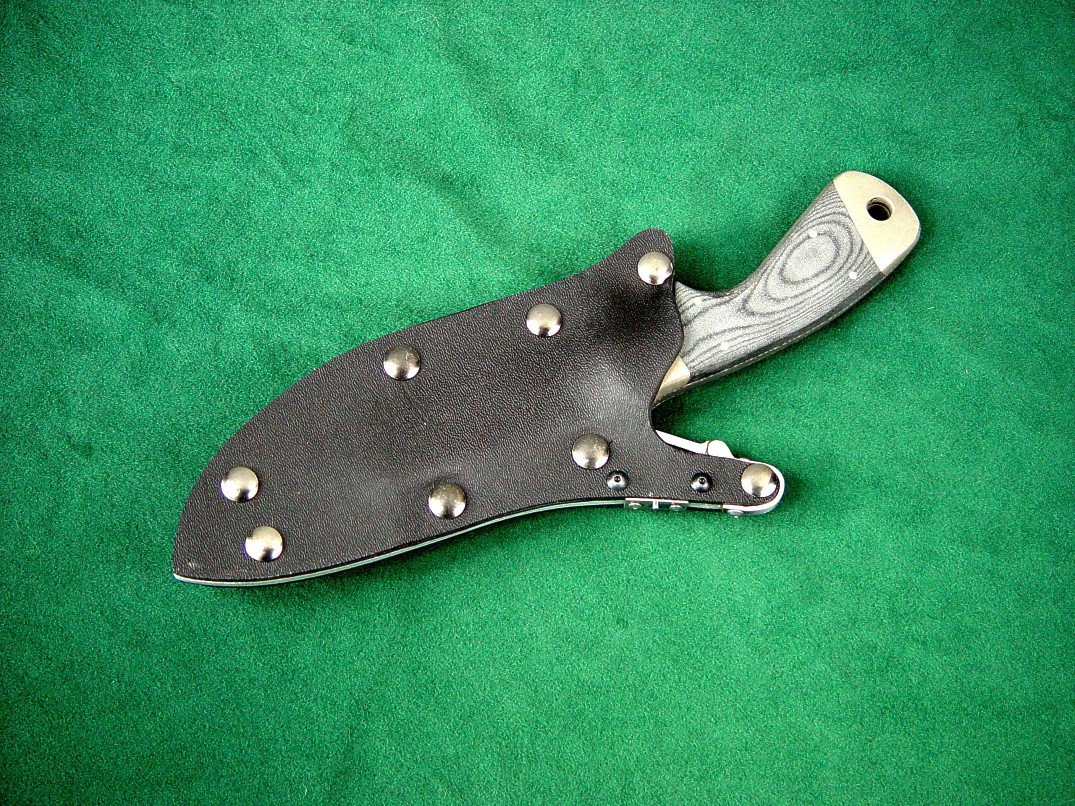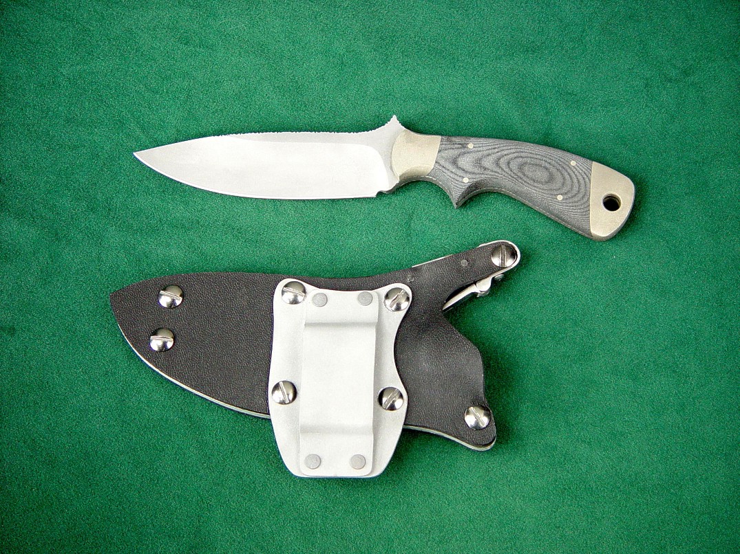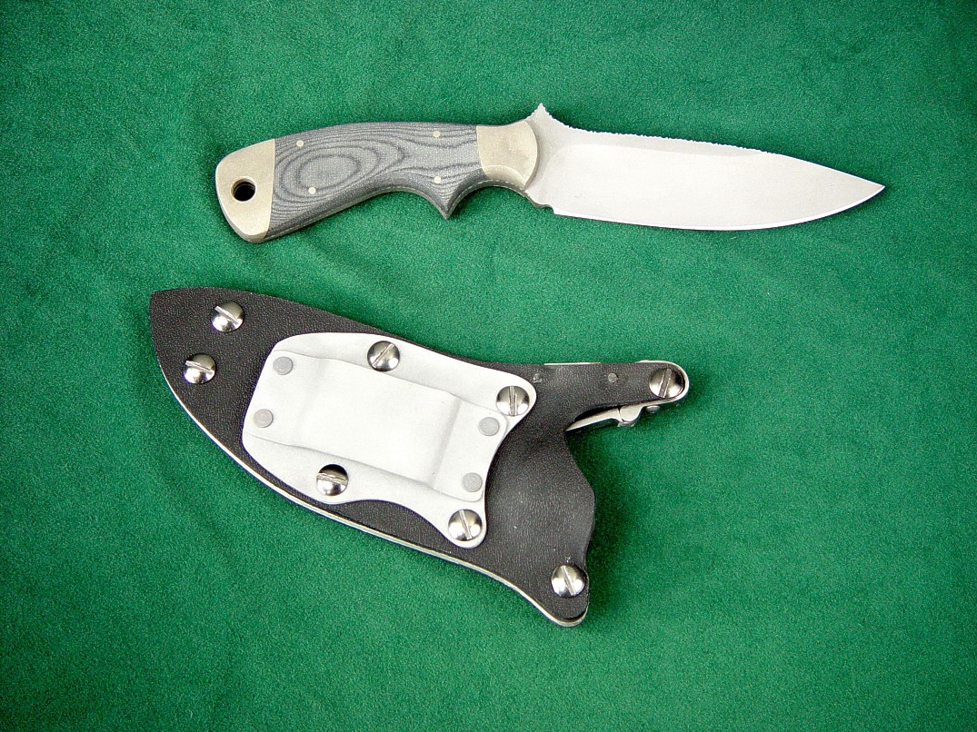 A great knife and sheath combination, the Creature is a solid design that combines a wide, strong, and thick blade of bead blasted 440C high chromium martensitic stainless steel, nickel silver bolsters, and a canvas Micarta phenolic handle. The entire knife and handle are bead blasted for a flat and clean look and feel. The knife has a positively locking double thickness kydex sheath build over a 5052H32 corrosion resistant high strength aluminum welt frame, secured with blued steel Chicago screws and posts and an all stainless steel locking mechanism. The sheath has a removable, reversible belt loop plate that allows either horizontal or vertical wear on either side. A tough, durable, well-equipped and ready knife.
