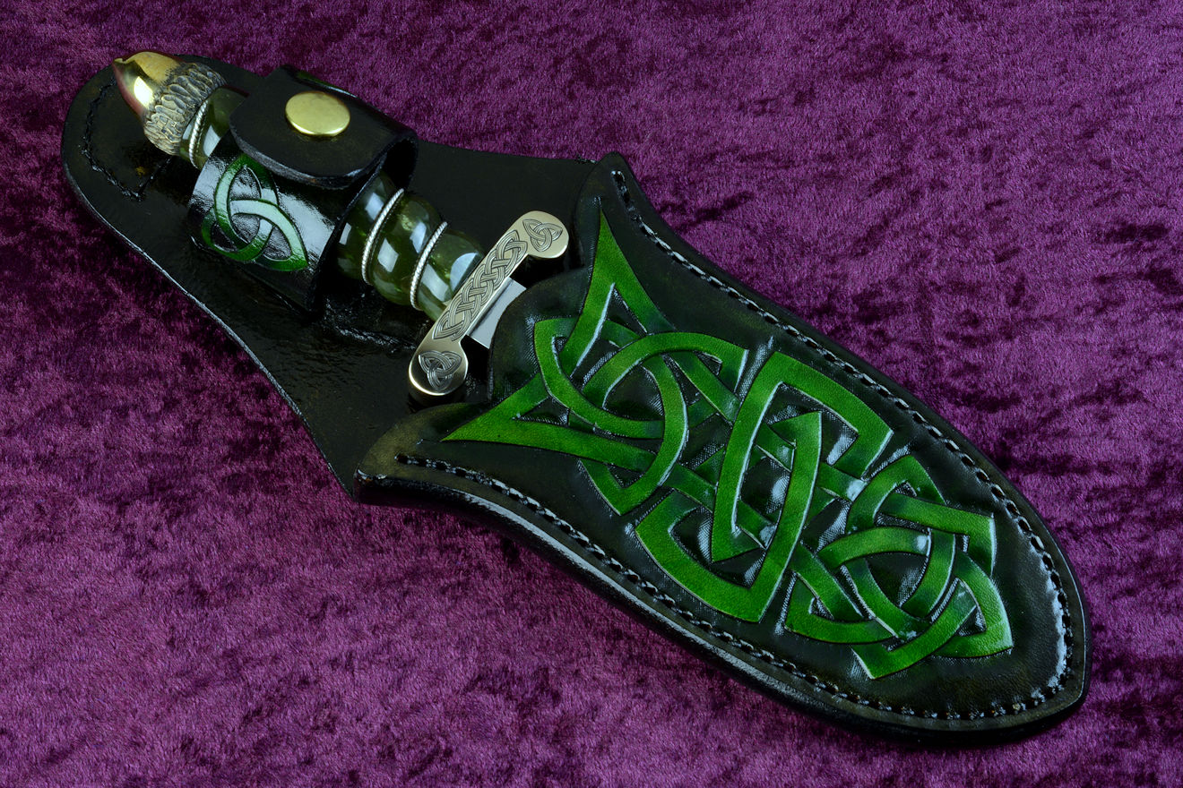 created the sheath in 9-10 oz. leather shoulder, and hand-carved and