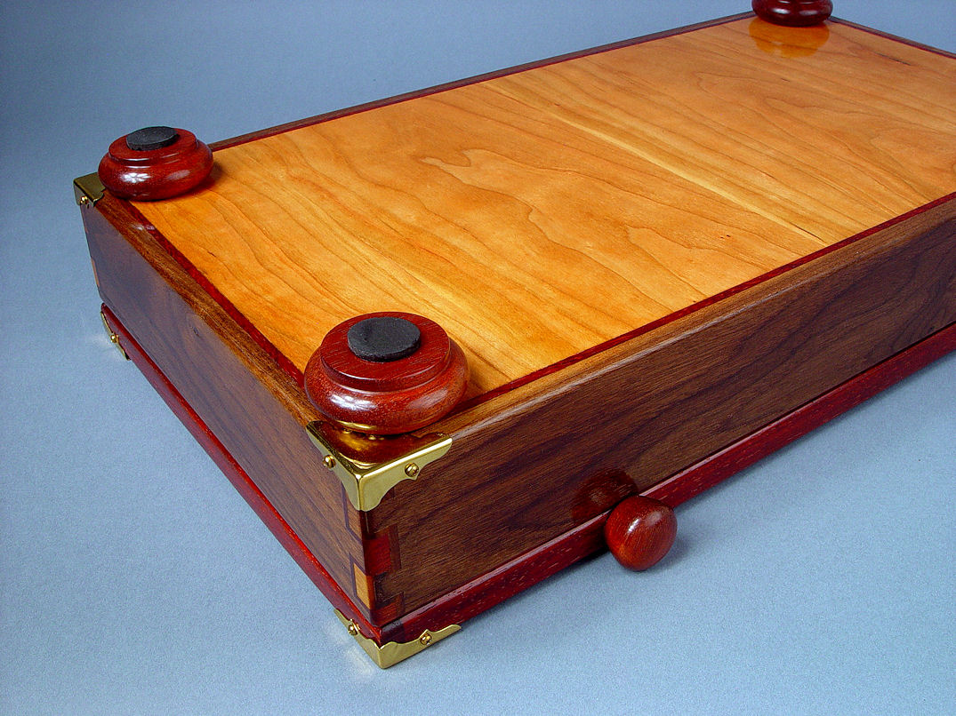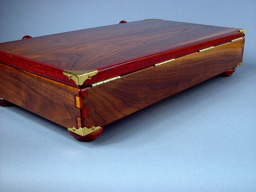 This very special work required an elegant, rich, and commensurate case, one with dark, rich tones and accents, so I made this one with double-double box joints in Black Walnut, Arririba, and Bloodwood, carefully chosen for contrast and strength. The corners are protected with lacquered brass box corners, and the feet and knobs are hand-turned and French-polished Bloodwood, chosen for its rich red color and extreme hardness and durability. The smooth feet are inlaid with neoprene for the protection of any surface the case may rest upon.