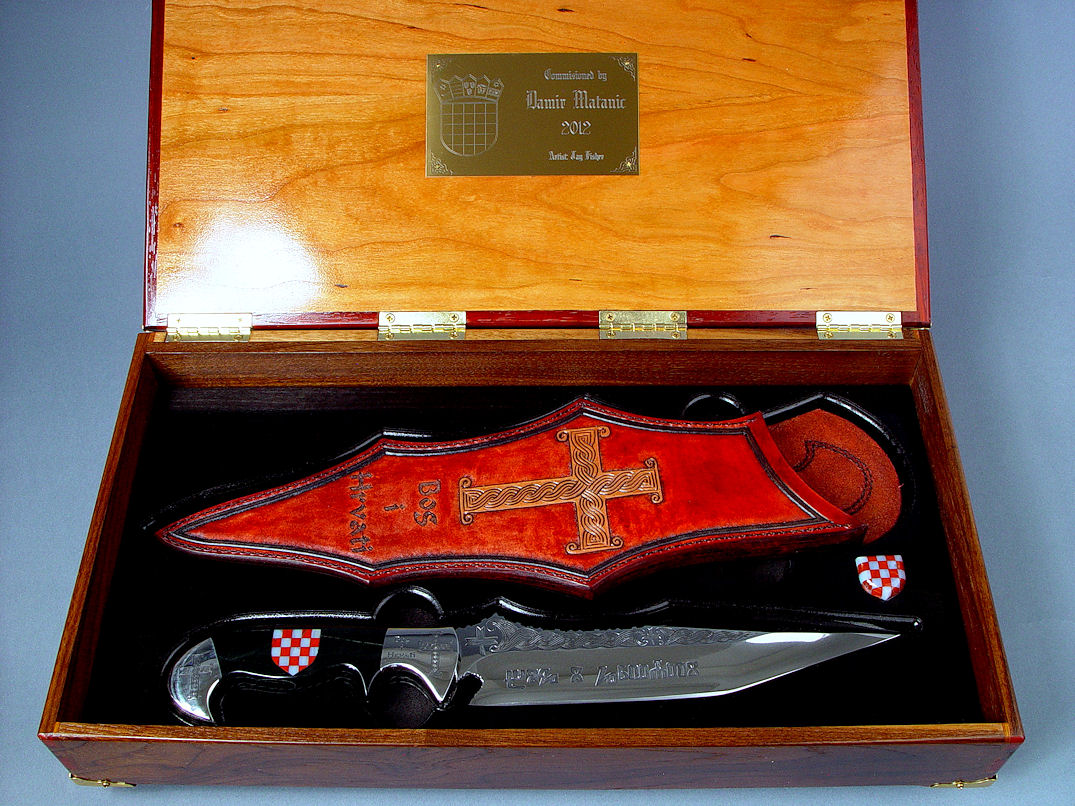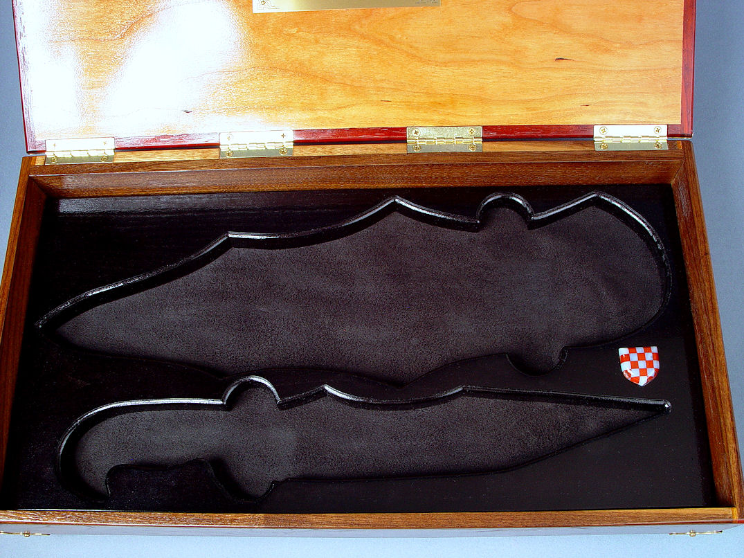 In Croatian, the phrase "Duhovni Ratnik" means Spiritual Warrior. In this fine custom handmade work of knife art, I was honored to have a patron who wished to embrace his heritage to create the Croatian Spiritual Warrior. The special display, storage, and presentation case for the piece was meticulously created to house and protect this cultural legacy. the case top is Black Walnut, banded with Padauk hardwood and brass corners. The knobs are Bloodwood. What lies inside is a formidable work of cultural art.