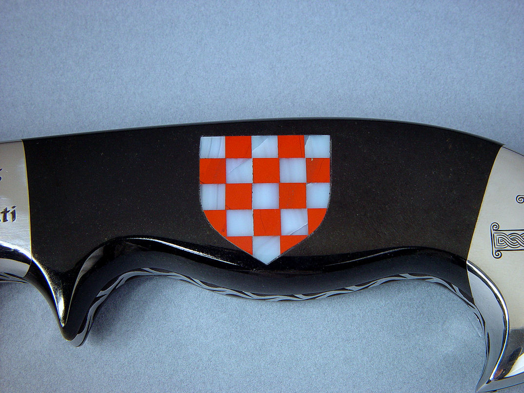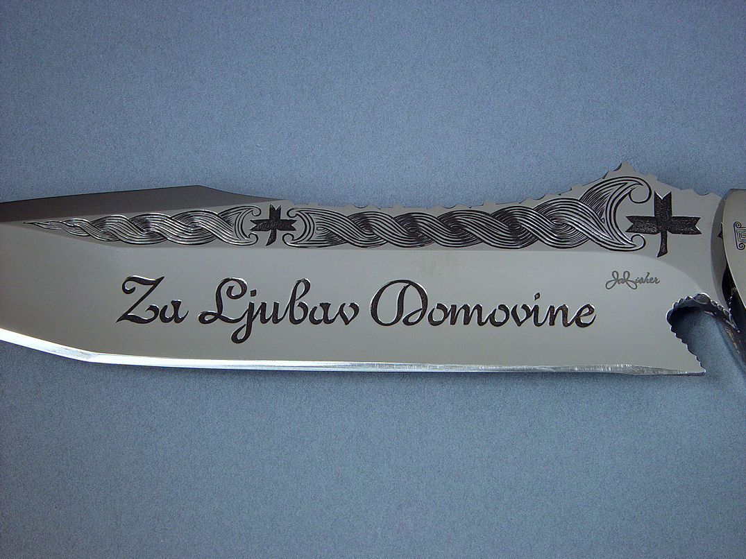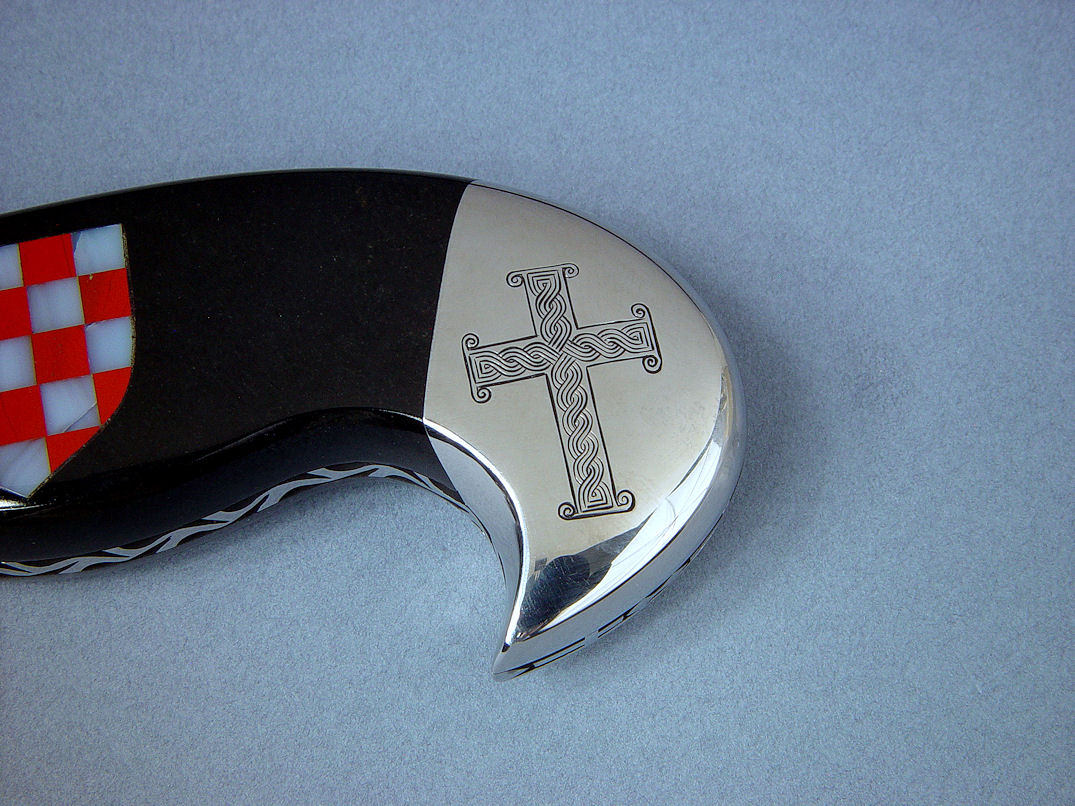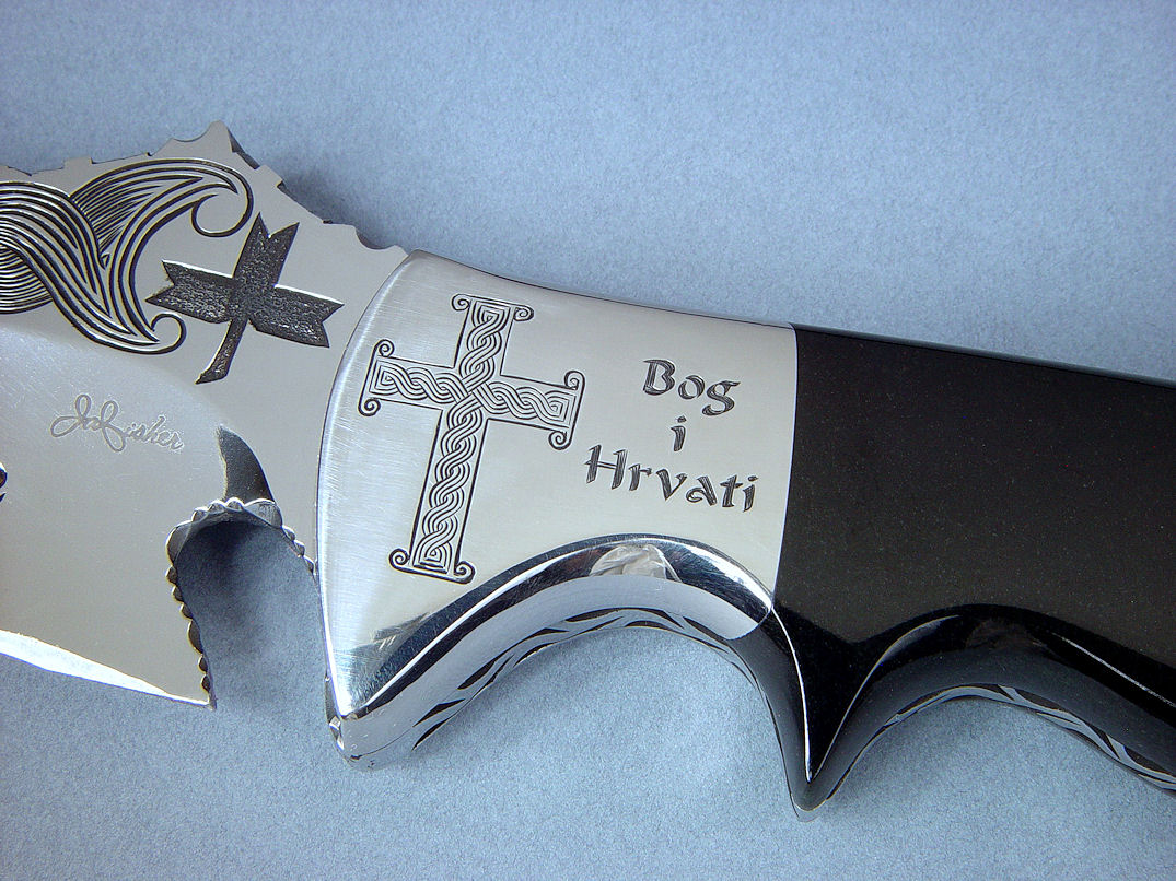 The striking handle of the Duhovni Ratnik is made of scales of thick Black Nephrite Jade gemstone from Australia, with through-body inlays of a mosaic shield of 23 pieces. This was a challenging bit of work, but it suited my client's desire to honor this traditional symbol of his country with grace. I used Red River Jasper from Africa and Geodic White Agate from my own state (New Mexico), and in careful planning and accurate hand-slabbing and lapping, created the mosaic that would become a hand-carved shield. I then pierced and carved the Black Jade to fit the shield, and finished the surfaces together for a smooth and even polish and glassy feel. The small engraved forms on the bolsters were also a significant challenge, as the bolster steel is high nickel and high chromium stainless, the same steel used in the toughest stainless steel nuts, bolts, and fasteners. The phrase literally translated means "God and Croatians."