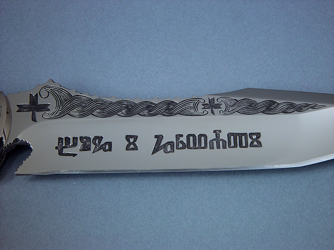 The knife represents a powerful Croatian Spiritual Warrior, and is a substantial weapon, tool, and work of edged art. The blade is meticulously hand-engraved 440C high chromium stainless steel, and it took many days to hand-engrave the mirror polished blade with the deep characters and embellishments. The phrase means "For the love of the Fatherland" and the twisted scrollwork is a very ancient traditional art form from the country. The trefoils represent the military bearing, and the one thousand year old design of the cross honors the Christian heritage. One of the most striking features is the mosaic of the twenty-three piece "checkerboard" inlayed completely in the black Nephrite Jade handle. The fittings are hand-engraved 304 high nickel, high chromium stainless steel with substantial size and strength. The handle shape is deep, large, and comfortable, with finger grooves pulling the hand to a solid fit with the knife. The blade has an original, striking geometry with a double-angled point that is both ancient and devastating. The profile features a top spine depression and top swage to create an aggressive point in the thick and deeply hollow ground blade. A profound choil accents the full filework around the entire tapered tang. In the reverse side view below, you can see the deeply engraved ancient Croatian Script Glagoljica in the hollow grind. The reverse of the sheath is also hand-carved with the ancient twisted spiral design.