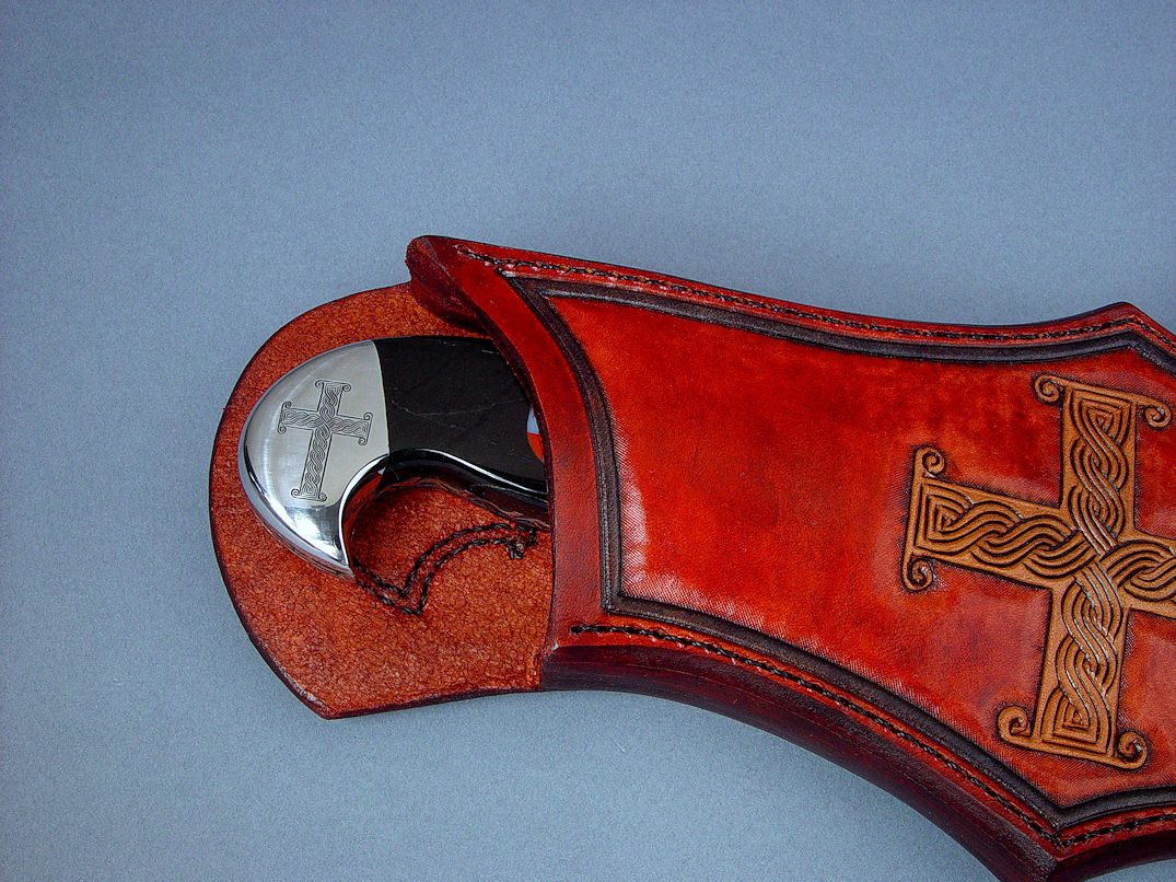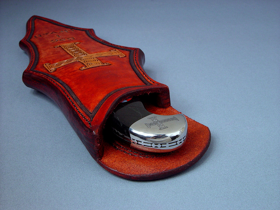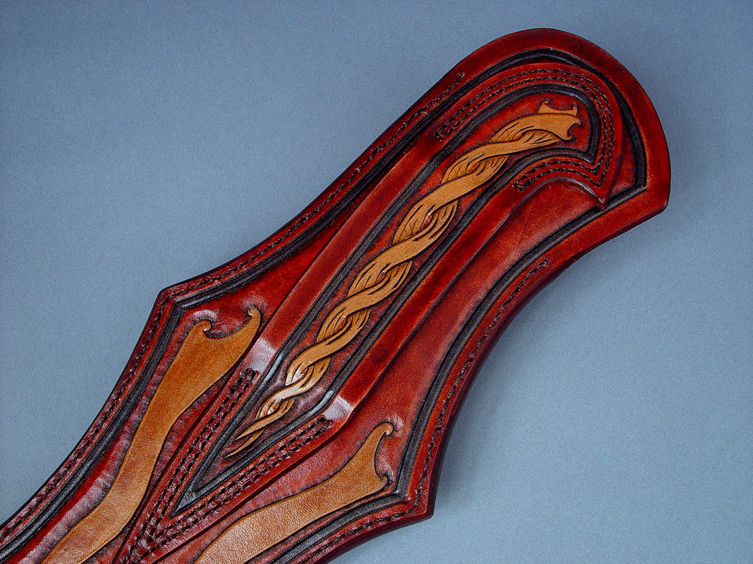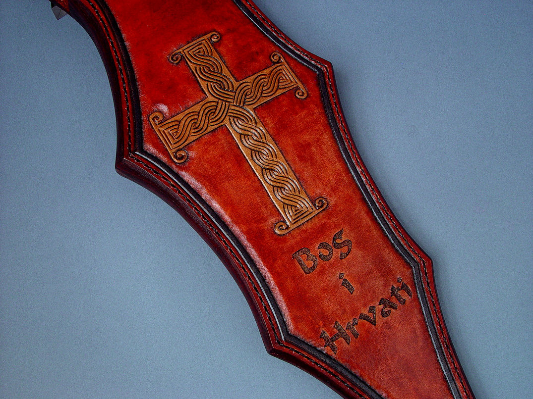 The sheath had to be very special for this beautiful heritage piece, so I constructed in in heavy leather shoulder. The leather was hand-carved with the design matching the knife, and the phrase "God and Croatians" on the face. The leather was carefully hand-dyed with overlaying and interactive dye layers to achieve the density, color, and rich style the knife deserved, and finished front and back. I knew that the sheath alone must be a work of dedicated art and I'm very happy with the result.