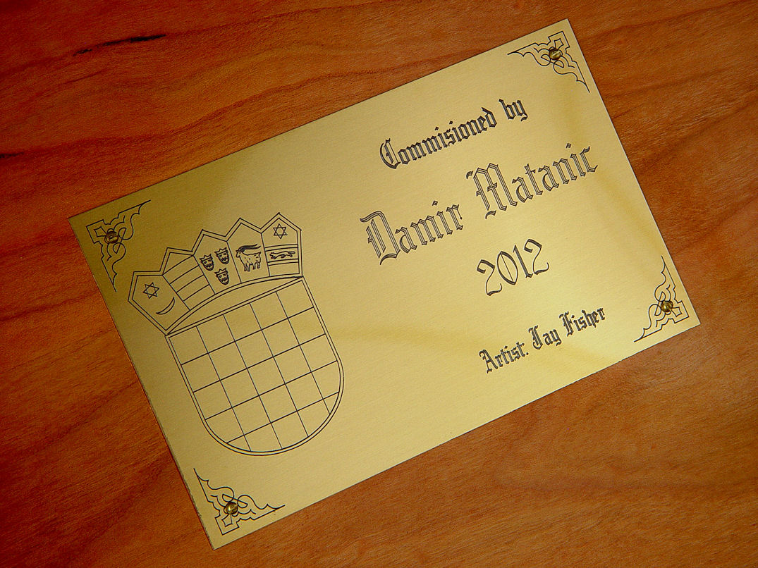 The striking colors and pattern reflect the honor of the Croatian people and their coat of arms. On the dedication plate, my patron is identified beside the ancient coat of arms of Croatia. The medieval checkerboard is the oldest standard.