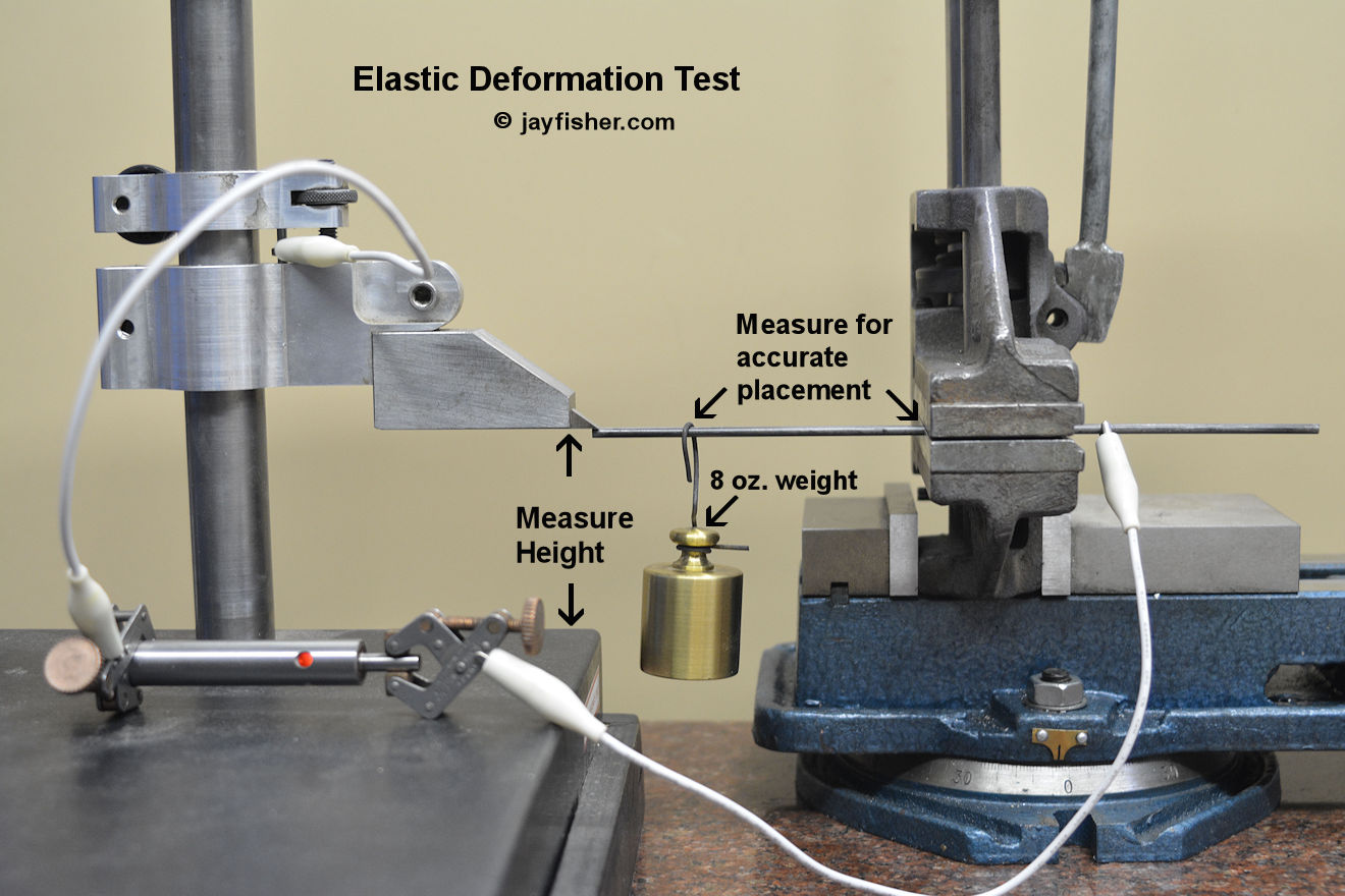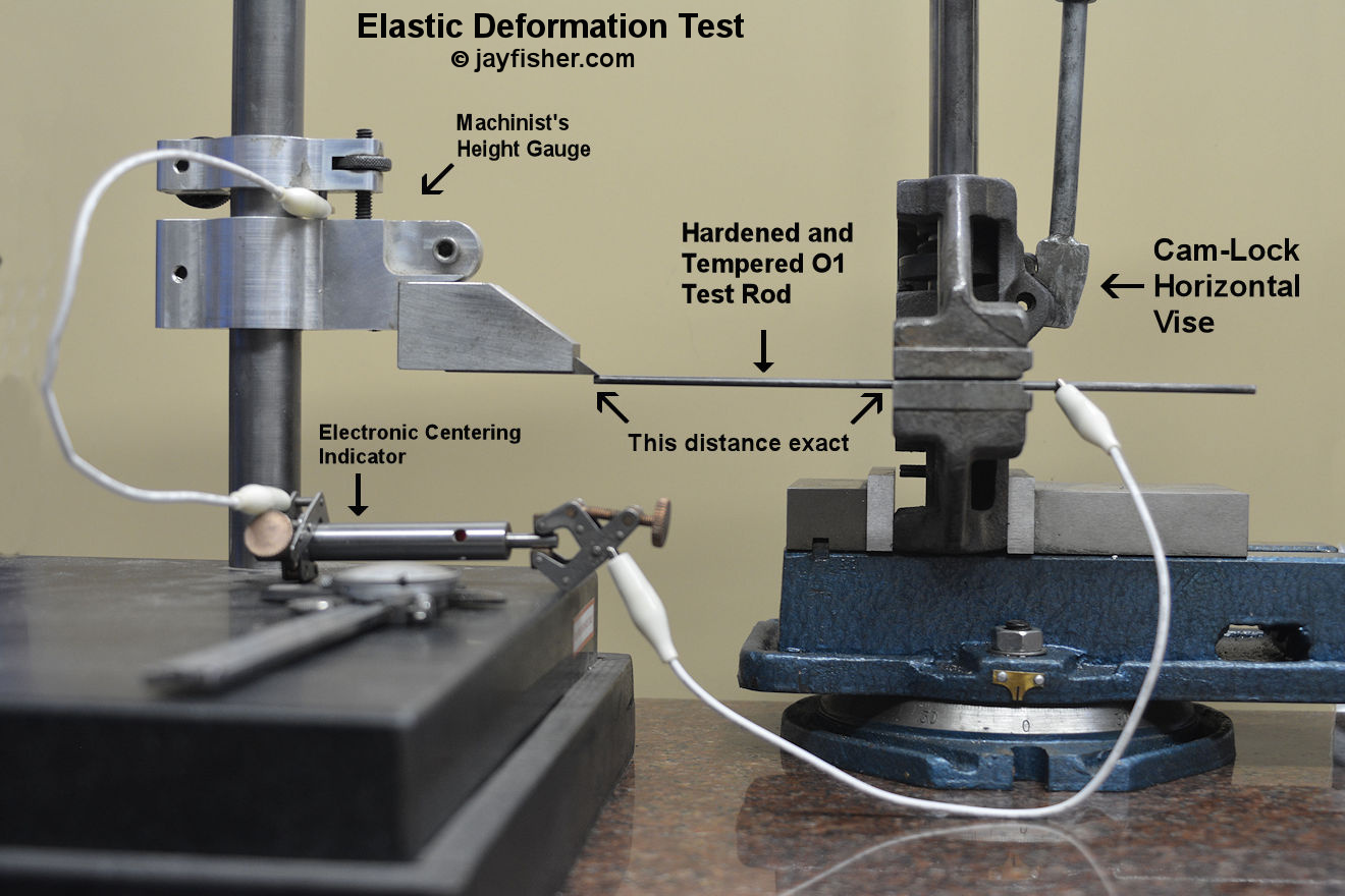 Repeat it with all three rods at the two different hardnesses. Repeat it three times for each rod by taking the rod out of the vise, rotating it around its axis (not end to end) and placing it back in the vise. This assures that any variation in the grain structure of the rod will be eliminated (there was none in my test rods). This will assure consistency. Just make sure that you clamp the rod, get an unstressed height and then immediately measure with the weight (stressed). If your deflection (bending) varies more than two thousandths of an inch from previous measurements of the same rod and same deflection (with or without the weight), then repeat the test to improve your accuracy. You'll find that once you set it up, it's surprisingly consistent no matter how the rod is oriented about its axis in the vise. Using the logged measurements, calculate the difference in height of each rod with the weight and without.