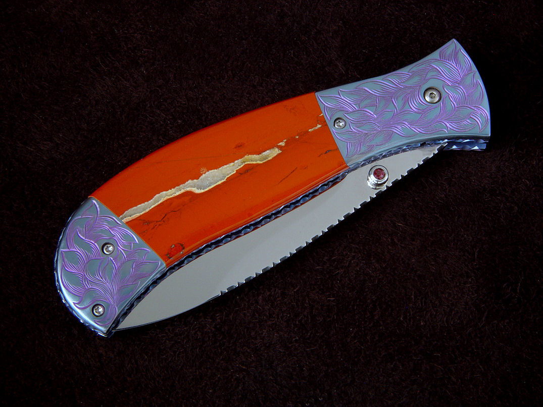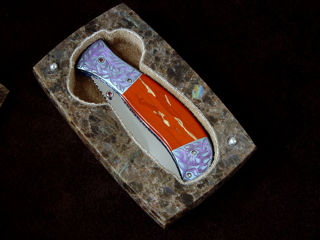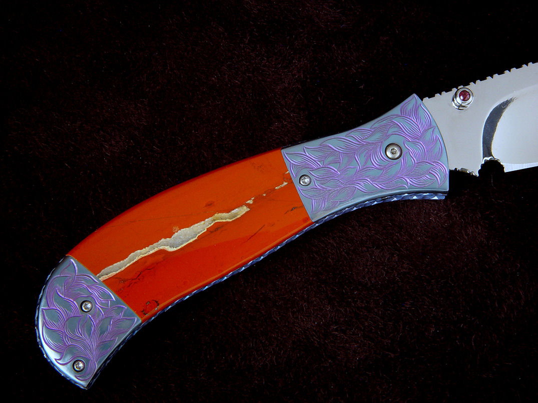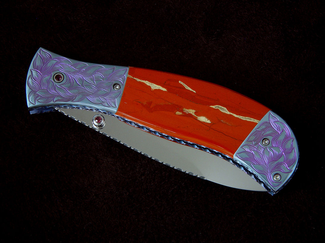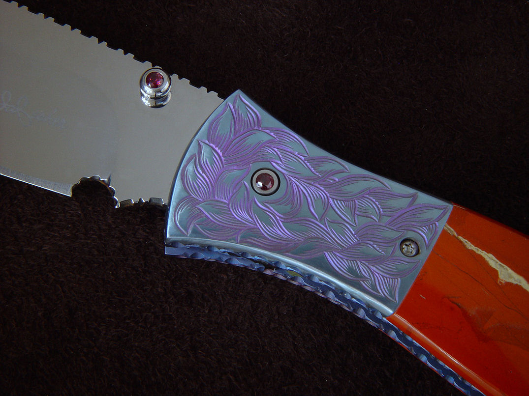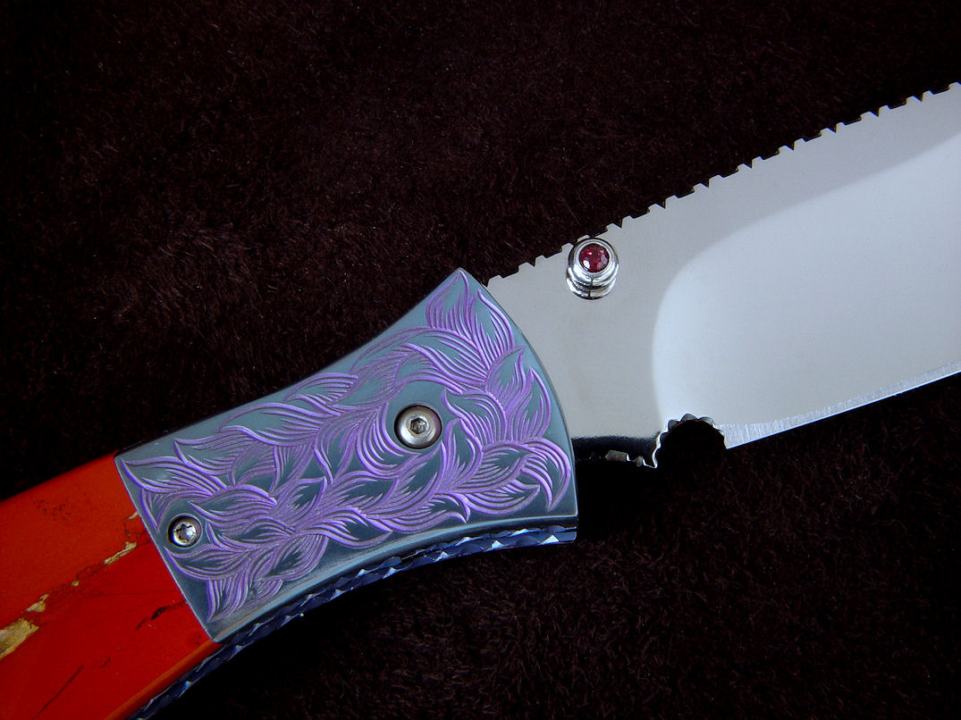 gemstones. The knife has bolsters of hand-engraved 6AL4V titanium, a