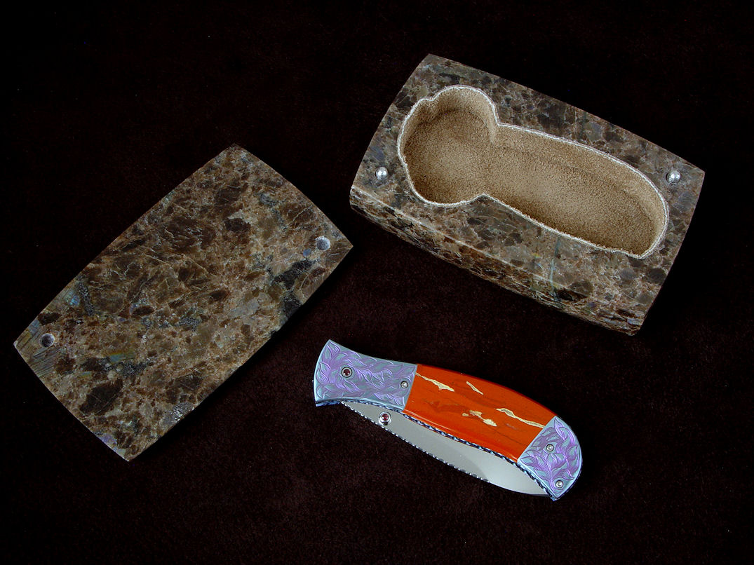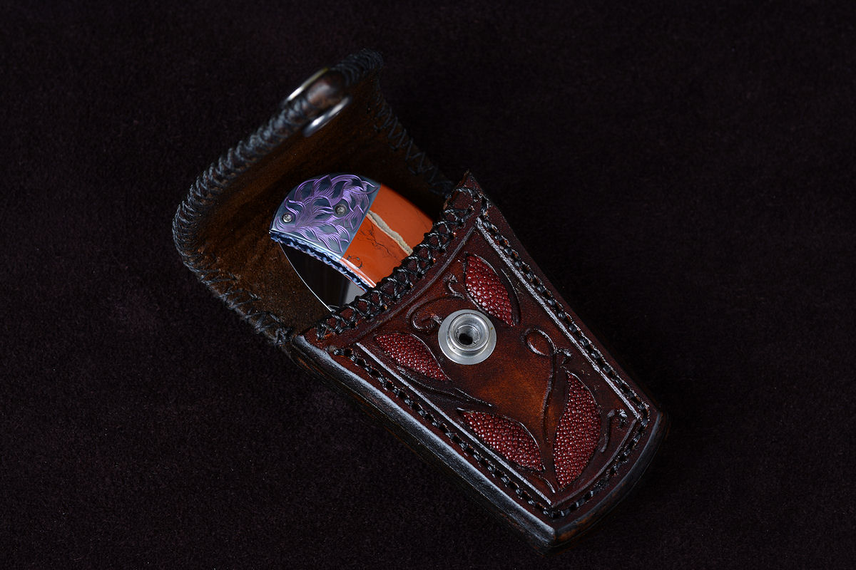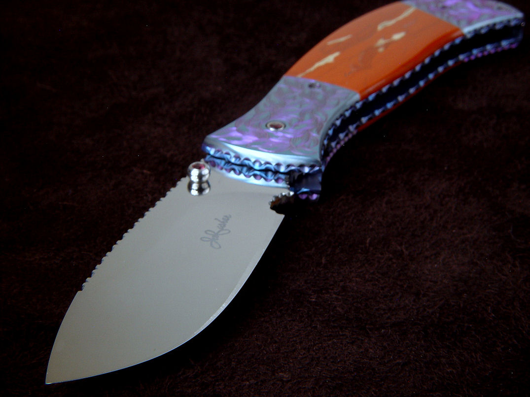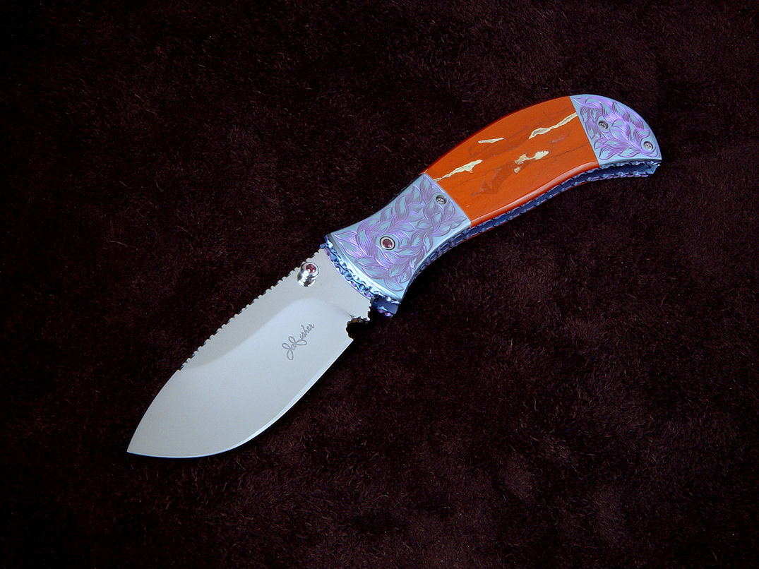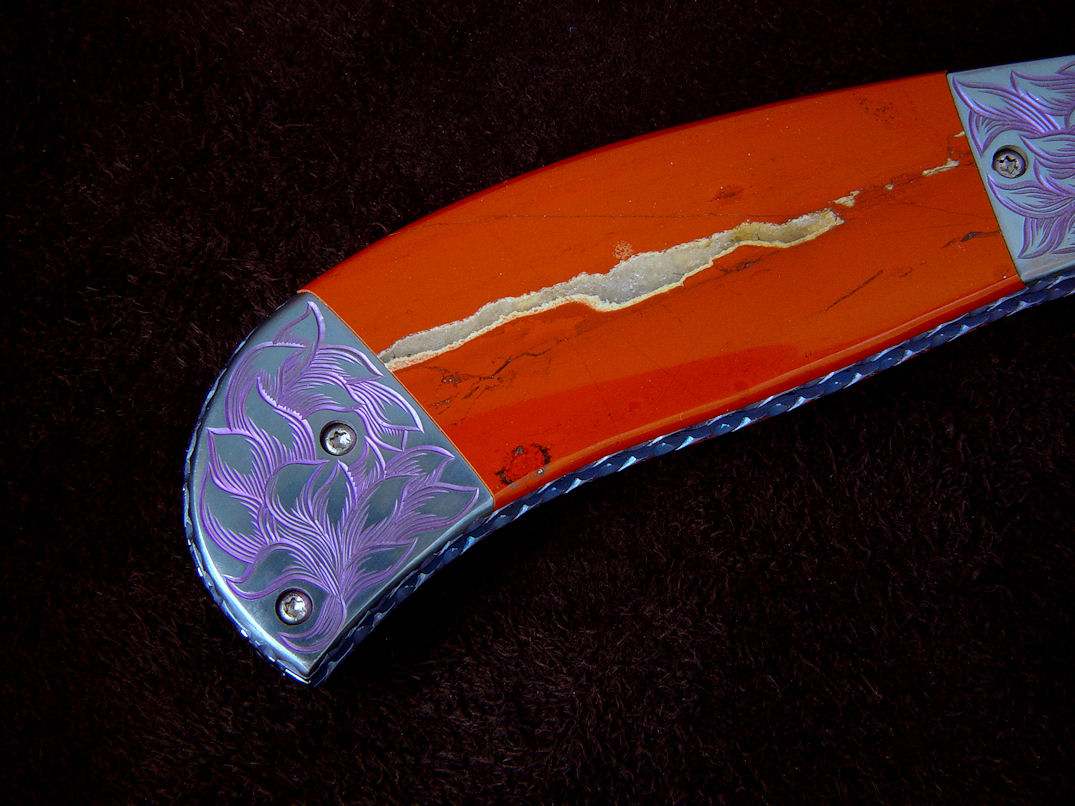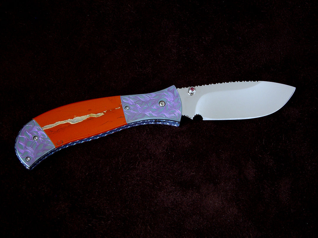 gemstones. The knife has bolsters of hand-engraved 6AL4V titanium, a