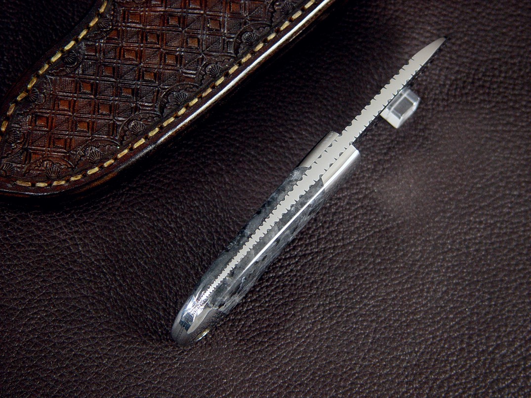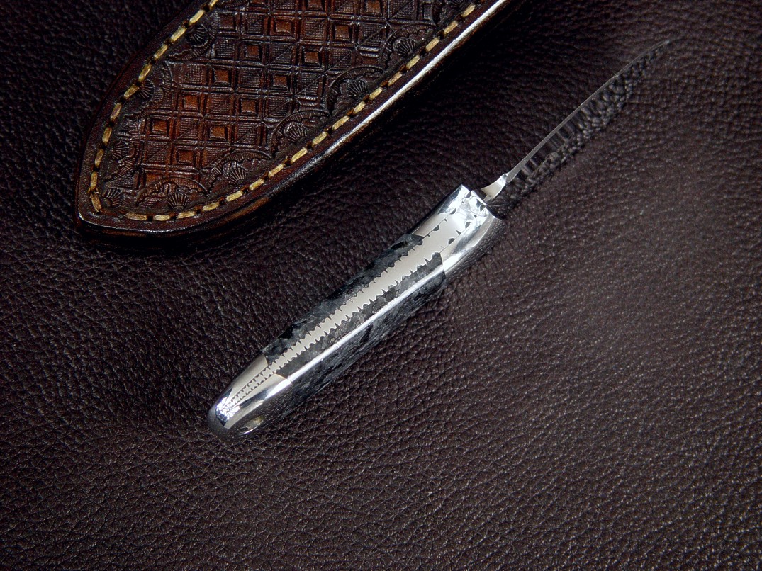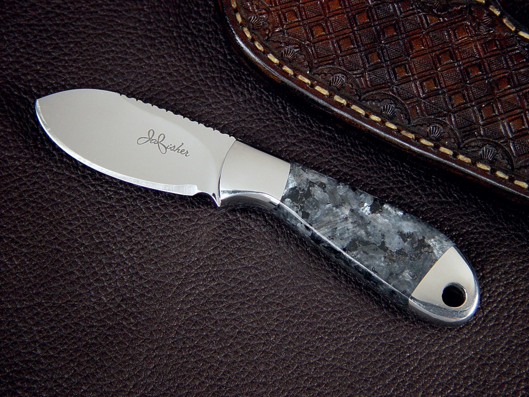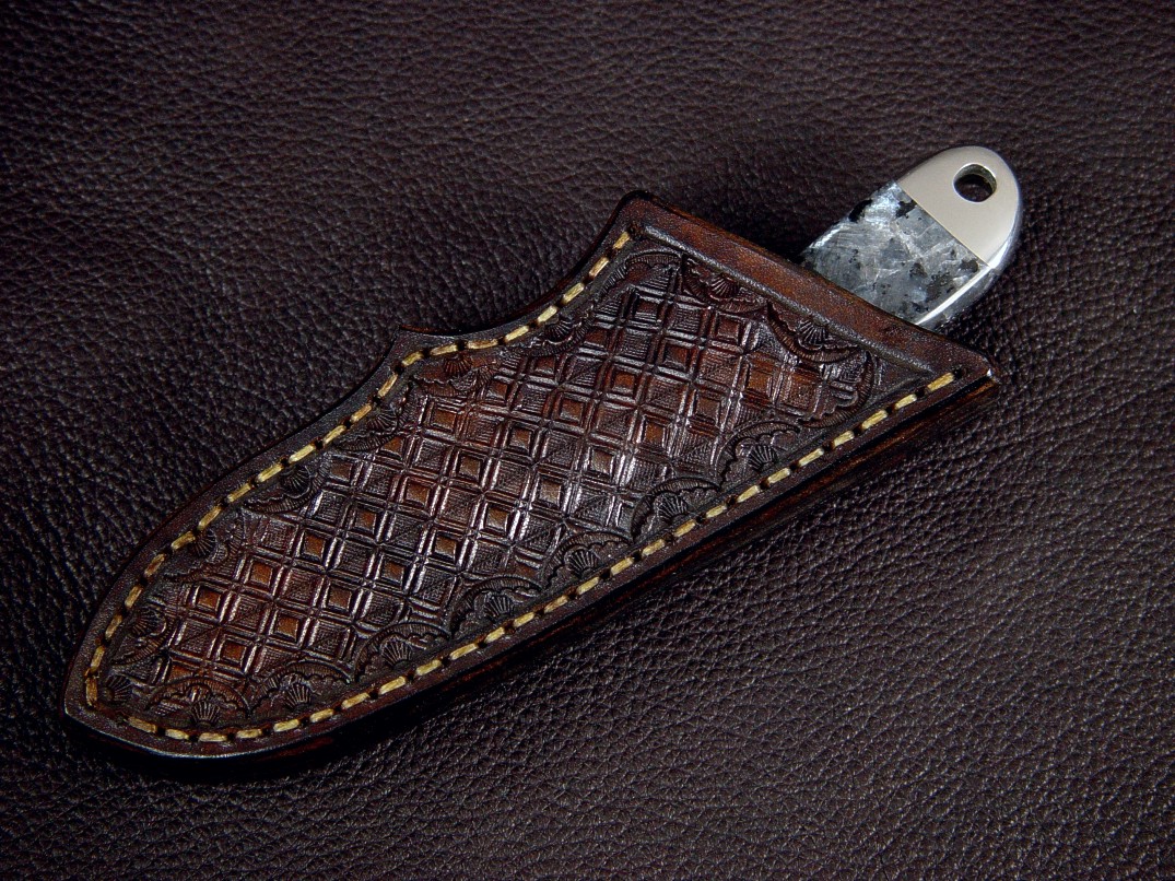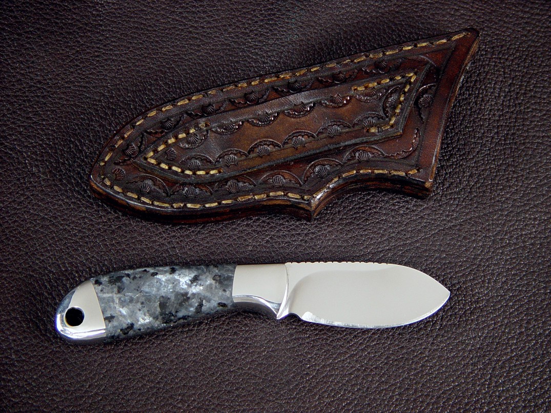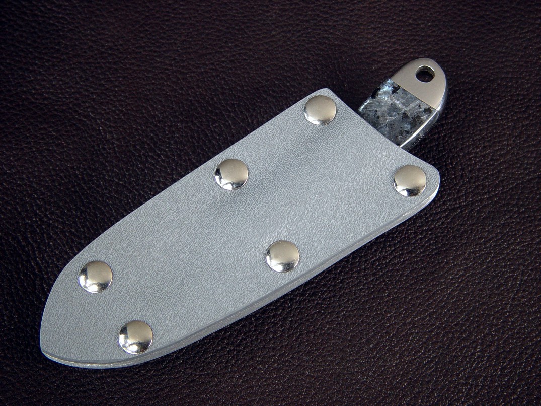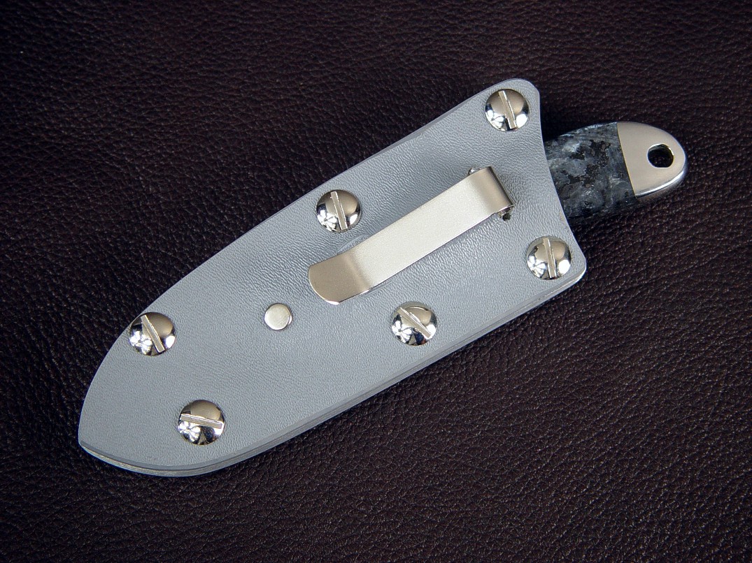 The Firefly is a small knife, one of the smallest fixed blade knives I make, with a 2.5" ((6.4 cm) long blade and less than 6" (15.2 cm) overall length. This one was custom made for a client, with a mirror polished ATS-34 high molybdenum stainless tool steel blade, 304 stainless steel bolsters and a Larvikite (Blue Pearl Granite) gemstone handle. The client requested two sheaths, one in hand-stamped and hand stitched leather shoulder, dyed medium brown, and a gray kydex sheath with nickel plated steel Chicago screws and a nickel silver belt clip.