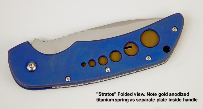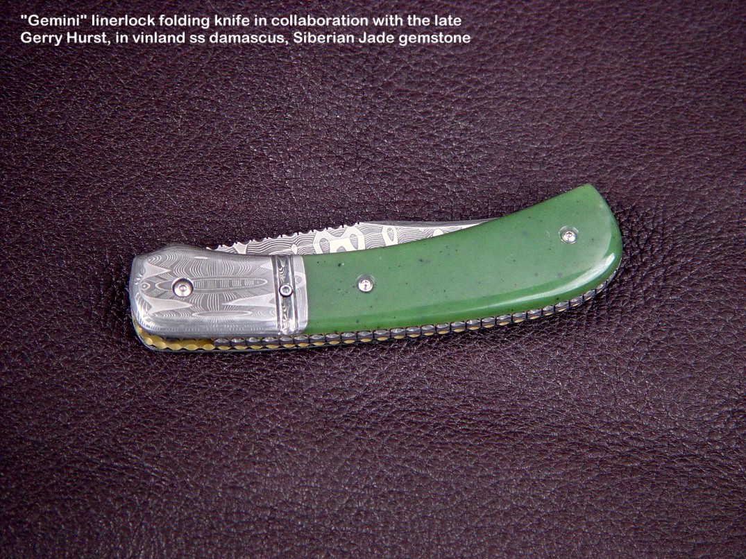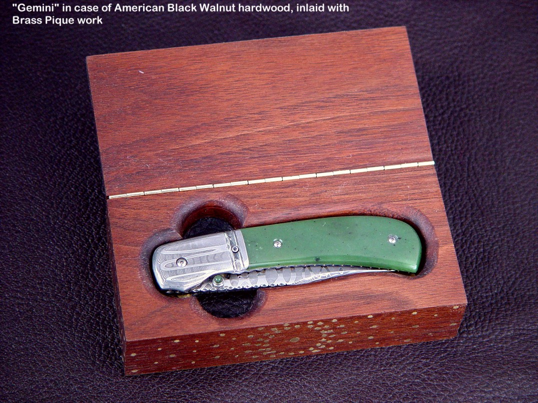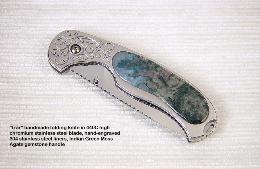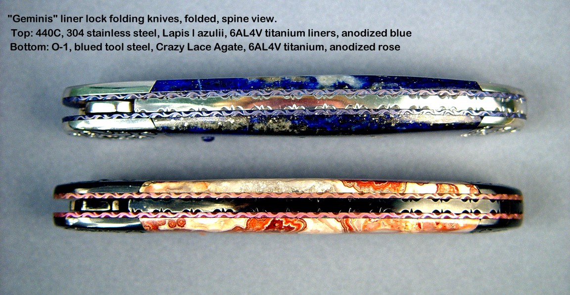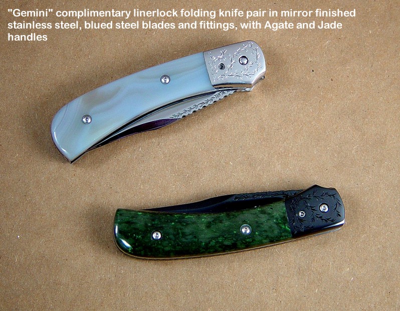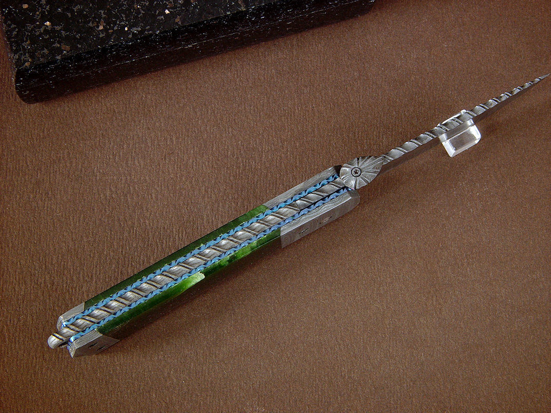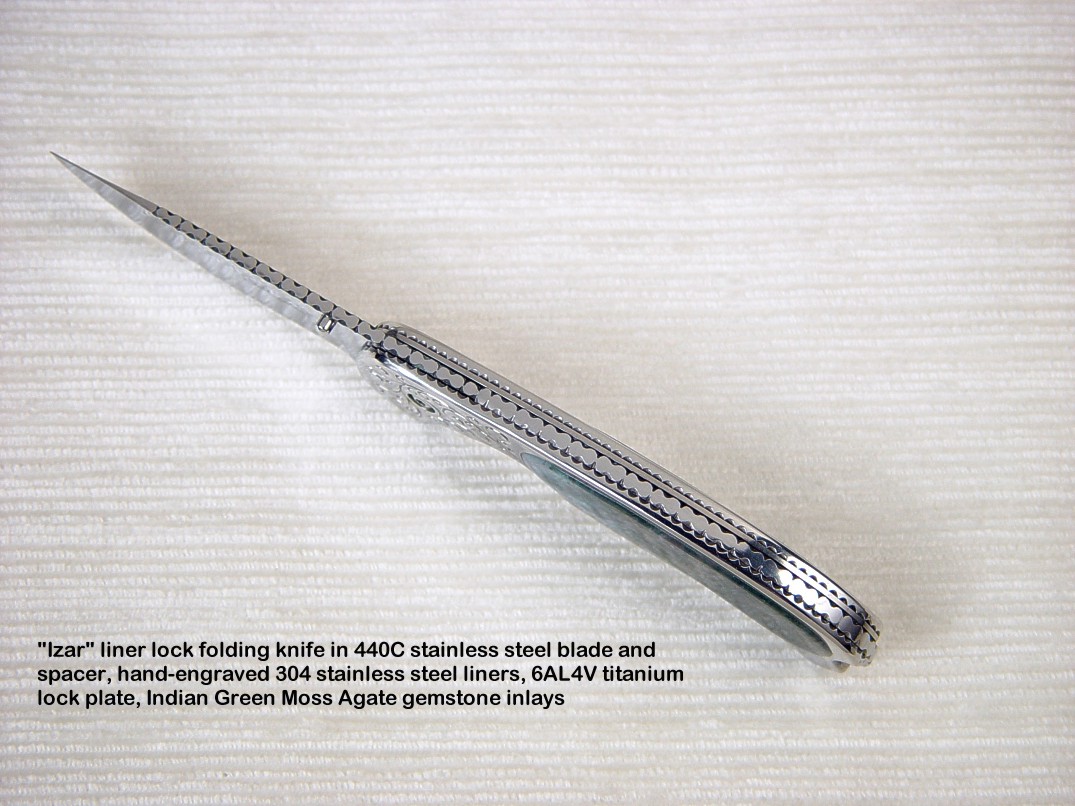 Handle scale choices are not as wide ranging as on a fixed blade knife. Most hardwoods will work well, but gemstone choices are limited by the overall strength of the gem material, and the method used to mount the scales. If scales are to be mounted with screws, only very hard and tough gemstones can bear the point contact pressure of machine screws. Gems like agate, jasper, and jade are the best choices for this type of mount. If the handle scales are inlaid in metal (see Izar below and at the link box), then the choices are much wider, as the gemstone floats, bedded in a supporting liner of steel. Horn, bone, ivory, and shell (Mother of Pearl) can also be used and the type of mount plays a role in determining the type of material used, but my forte, and what most of my clients expect is gemstone. Chosen and executed well, the gemstone will outlast all of the metal components of the knife.