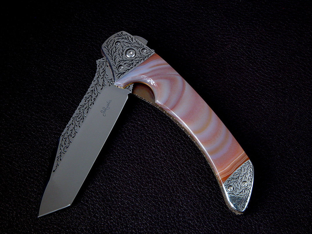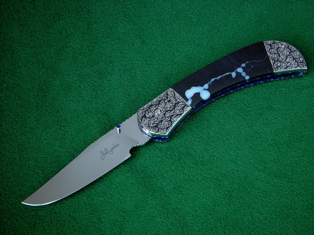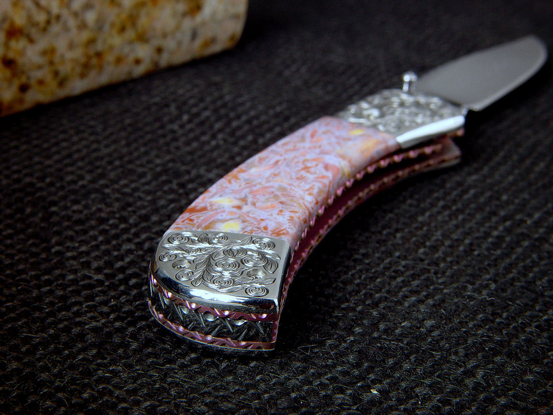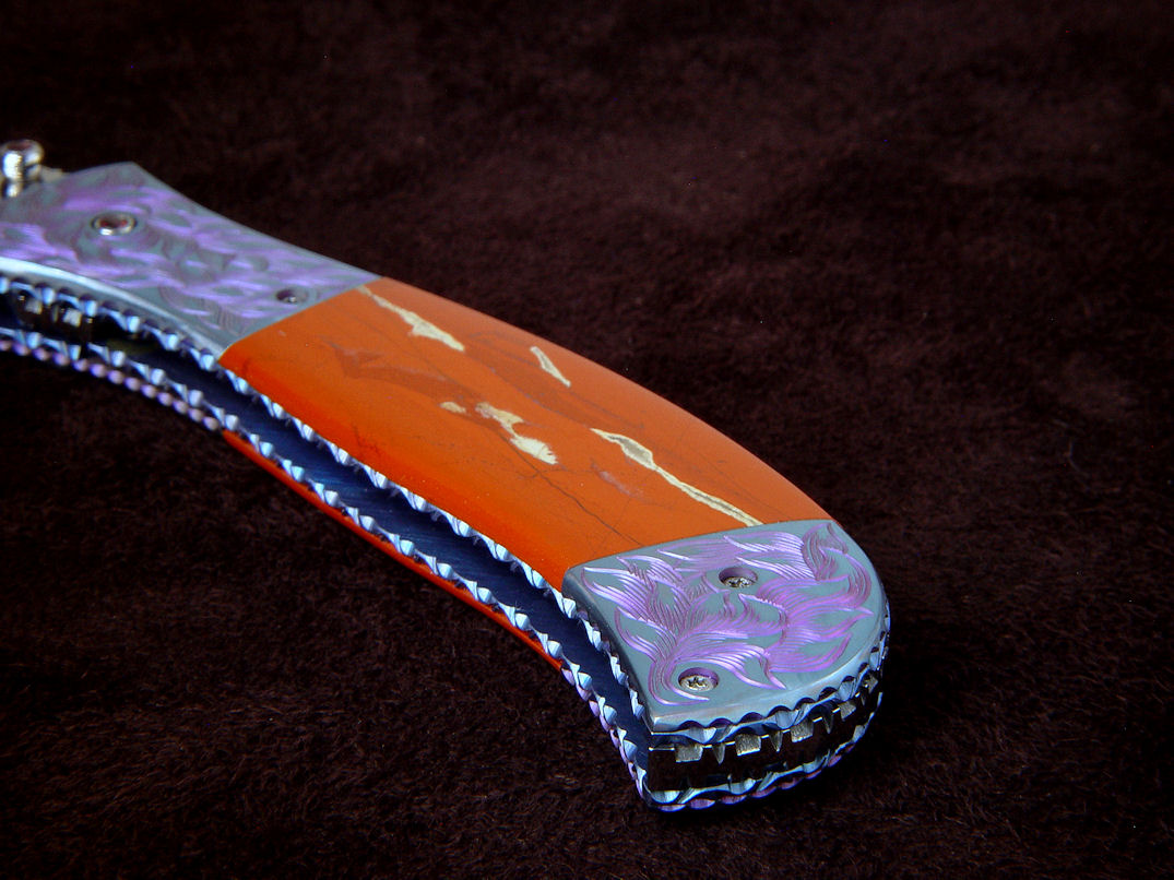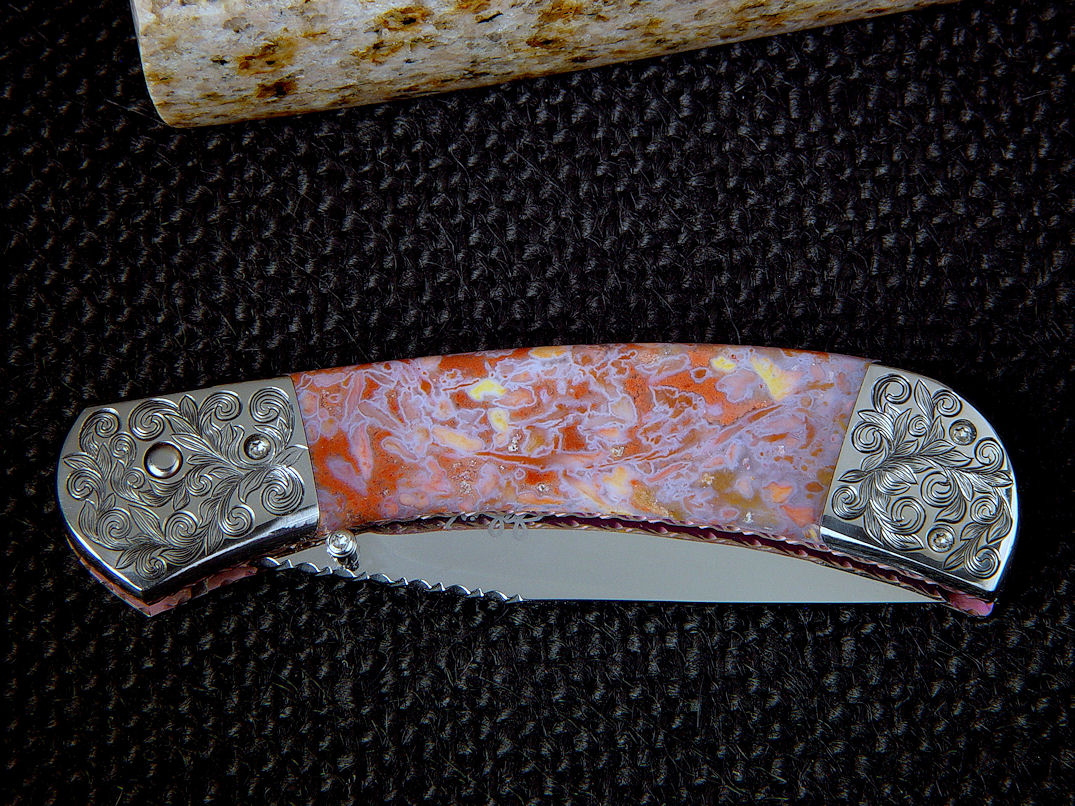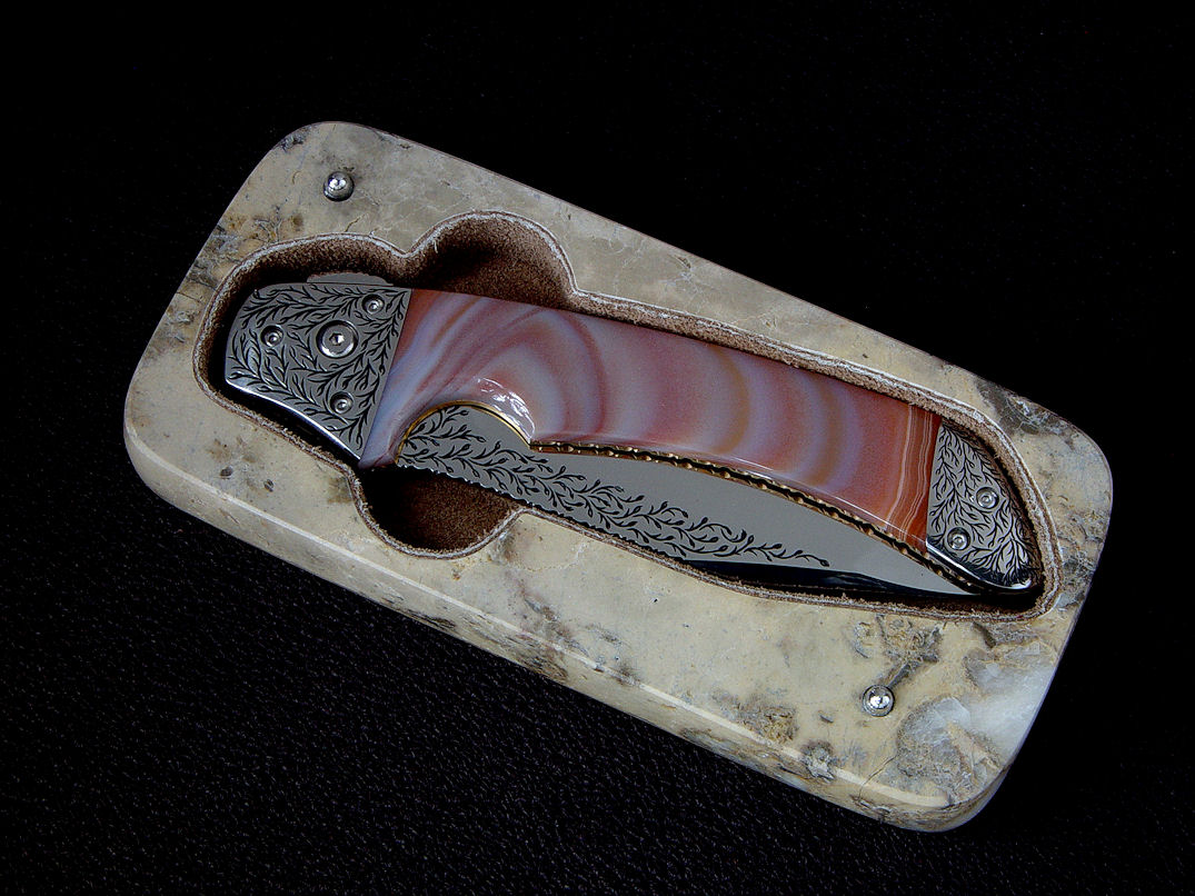 Since I make more gemstone handled knives than any other individual maker, you've probably guess that I make most of my folding knives with gemstone handles. I am not limited to gemstone though, and you'll see other handle materials on my folders. Materials used are just the start of any differences, and my patterns and styles are also unique. Embellishment like filework and engraving is usually enhancing the folding knife. The engraving that I apply is my own style, constantly evolving. Since I consider each folding knife an individual endeavor, the stand, case, or accoutrements are also unique and in my own style.