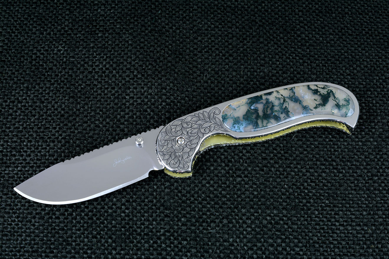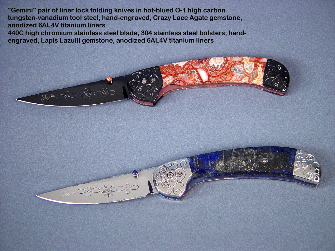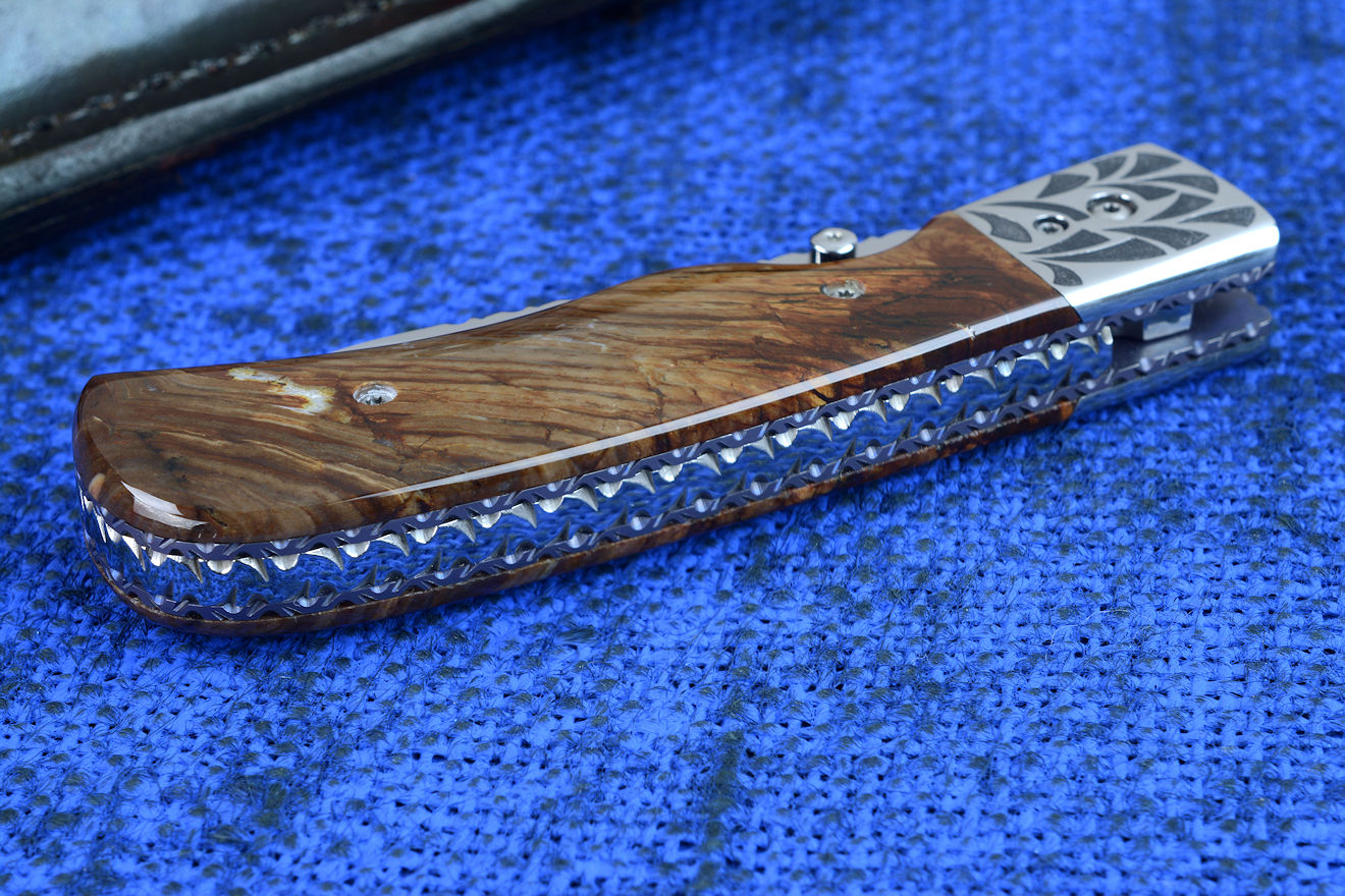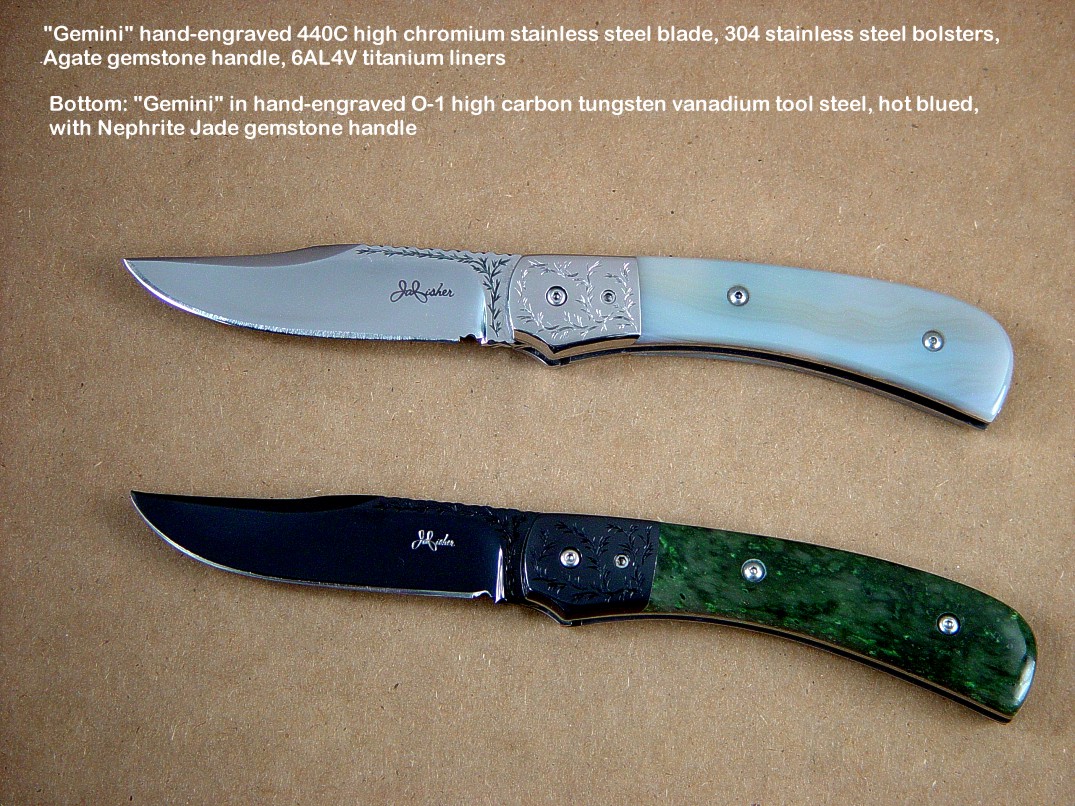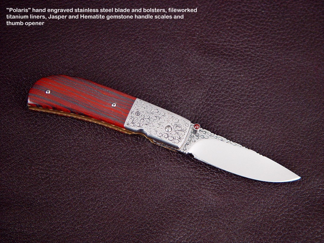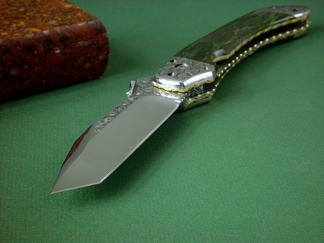 Since I make more gemstone handled knives than any other individual maker, you've probably guess that I make most of my folding knives with gemstone handles. I am not limited to gemstone though, and you'll see other handle materials on my folders. Materials used are just the start of any differences, and my patterns and styles are also unique. Embellishment like filework and engraving is usually enhancing the folding knife. The engraving that I apply is my own style, constantly evolving. Since I consider each folding knife an individual endeavor, the stand, case, or accoutrements are also unique and in my own style.