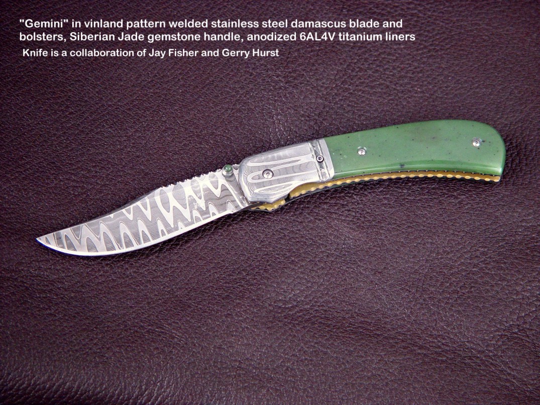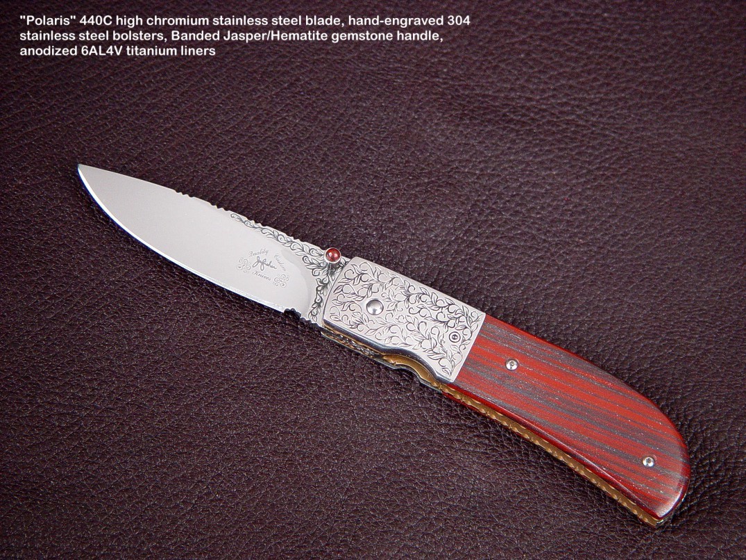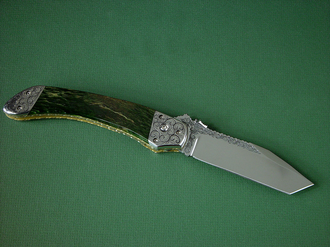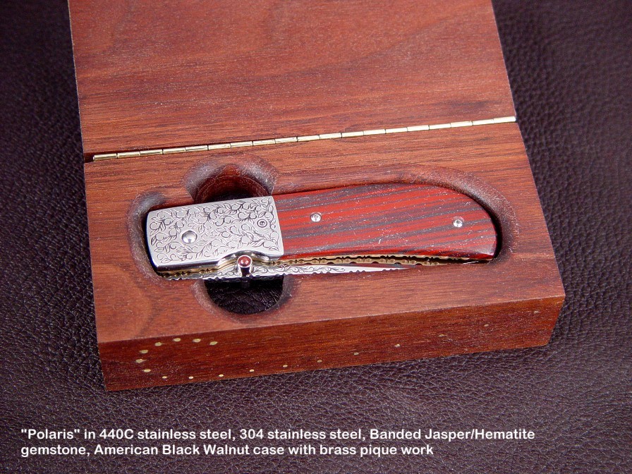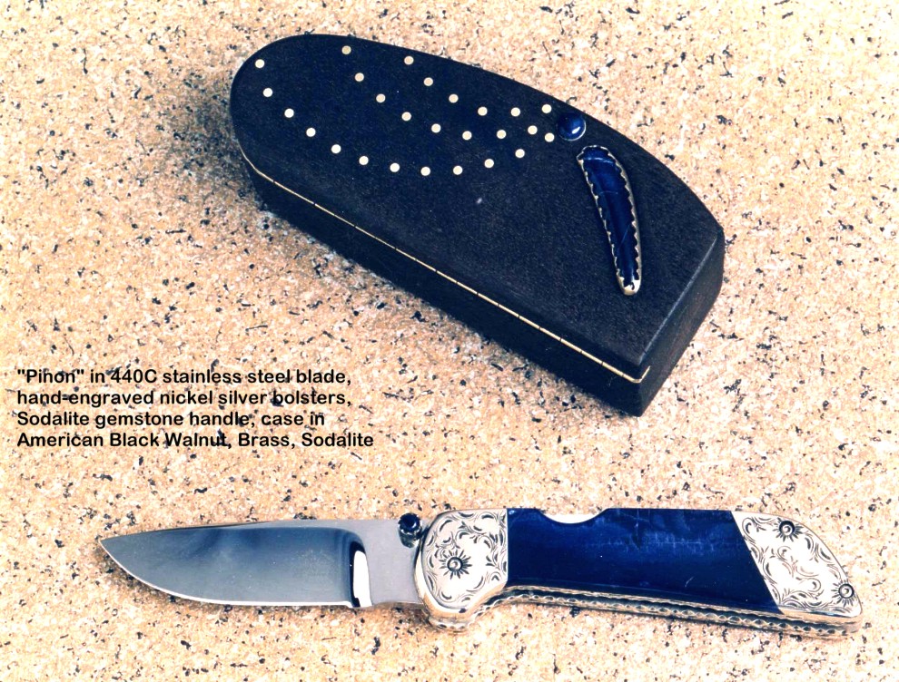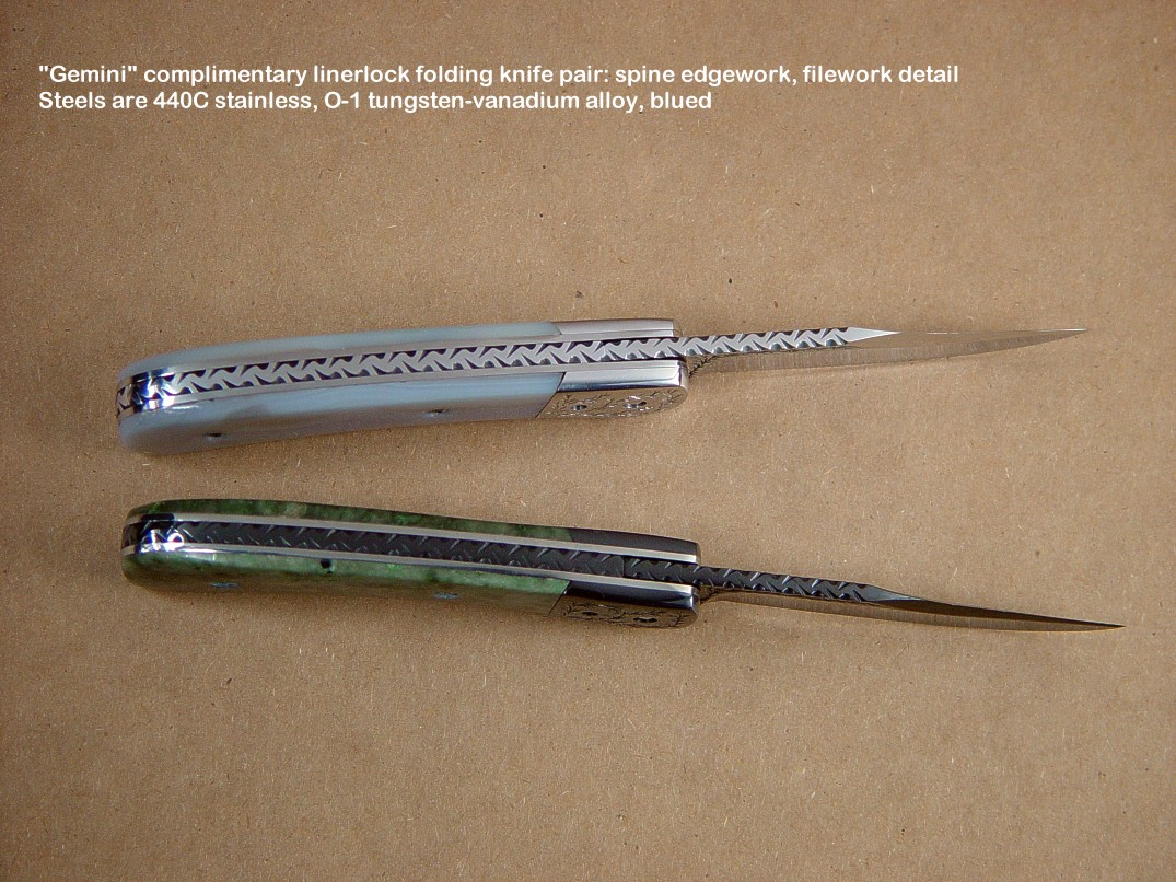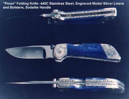 Since I make more gemstone handled knives than any other individual maker, you've probably guess that I make most of my folding knives with gemstone handles. I am not limited to gemstone though, and you'll see other handle materials on my folders. Materials used are just the start of any differences, and my patterns and styles are also unique. Embellishment like filework and engraving is usually enhancing the folding knife. The engraving that I apply is my own style, constantly evolving. Since I consider each folding knife an individual endeavor, the stand, case, or accoutrements are also unique and in my own style.