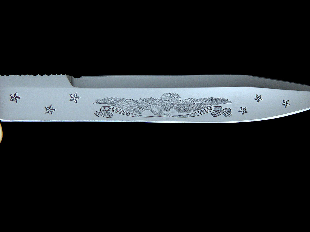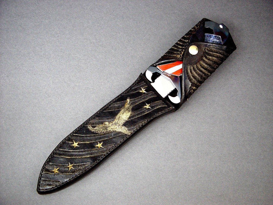 The sheath of this fine knife matches the theme of the eagle, so I hand-carved 9 - 10 oz. leather shoulder into wings, a detailed eagle, and stars and stripes, dyed it black, and washed the carvings with 24kt gold powder. The sheath is lacquered, hand-stitched with nylon, lacquered and sealed.