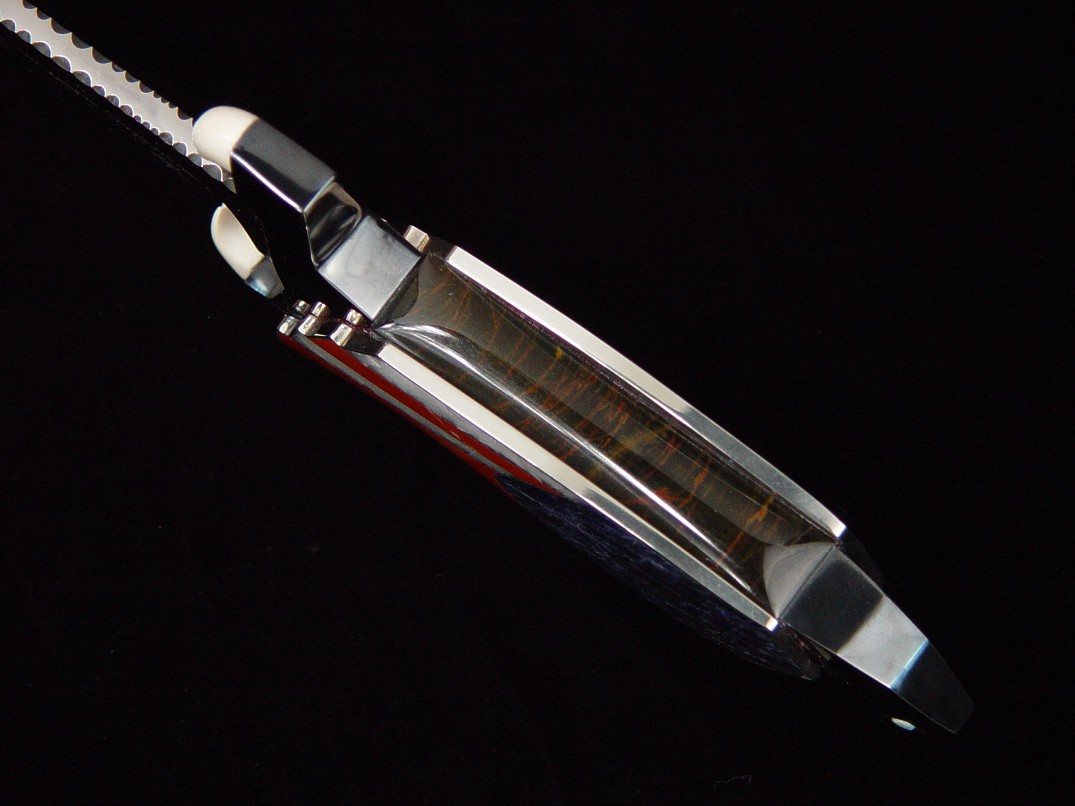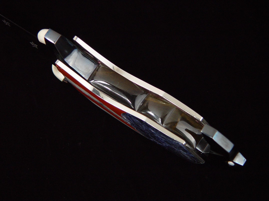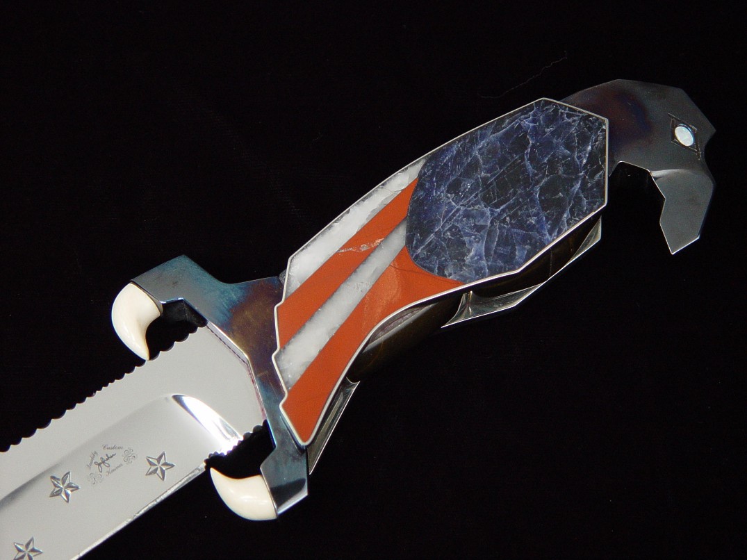 A stunning knife, Freedom's Promise was made from the paper design up, with careful consideration and application of materials for a very specific look. I started with at blade of 440C high chromium martensitic stainless steel, hollow ground and mirror polished, on which I hand-engraved a very early historic version of our nation's Great Seal. The eagle spreads his wings and holds the banner "E Pluribus Unum" (From the many, One). The hand-engraving is tough and detailed, on both sides of the blade, and the seal is flanked by stars. The blade has a top two-thirds hollow grind in addition to the main grind, and the straight length of the blade is fileworked, including the choil. This is a hidden tang knife, so has a full guard. The guard I designed and made with low carbon steel which is nitrate-blued for a bluish, reddish finish blending the colors of the handle with improved corrosion resistance. The guard is inlaid with Elephant Ivory, carved and polished in talons reflecting the eagle's claws. The pommel of the handle is also blued and hand-carved low carbon steel, and is inlaid with two solid Opals for the eagle's eyes. The handle is framed on the edges with polished cabochons of Crocidolite gemstone, with bits of Tiger Eye Quartz, Red Jasper and metallic gray Hematite. The handle scales are mounted inlay frames of nickel silver, and the inlays are a mosaic of Red River Jasper, White Milky Quartz, and Dark Blue Sodalite gemstone.