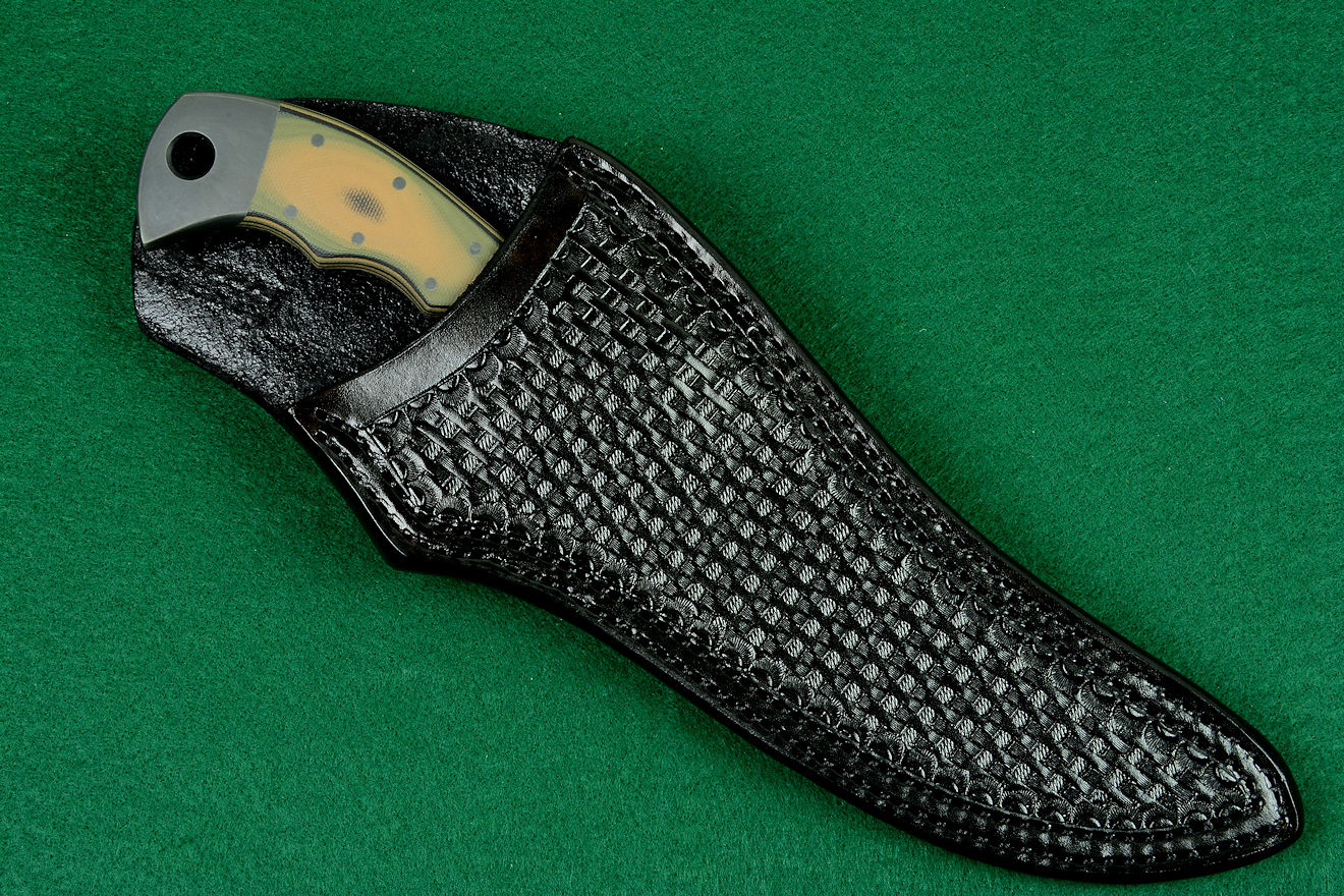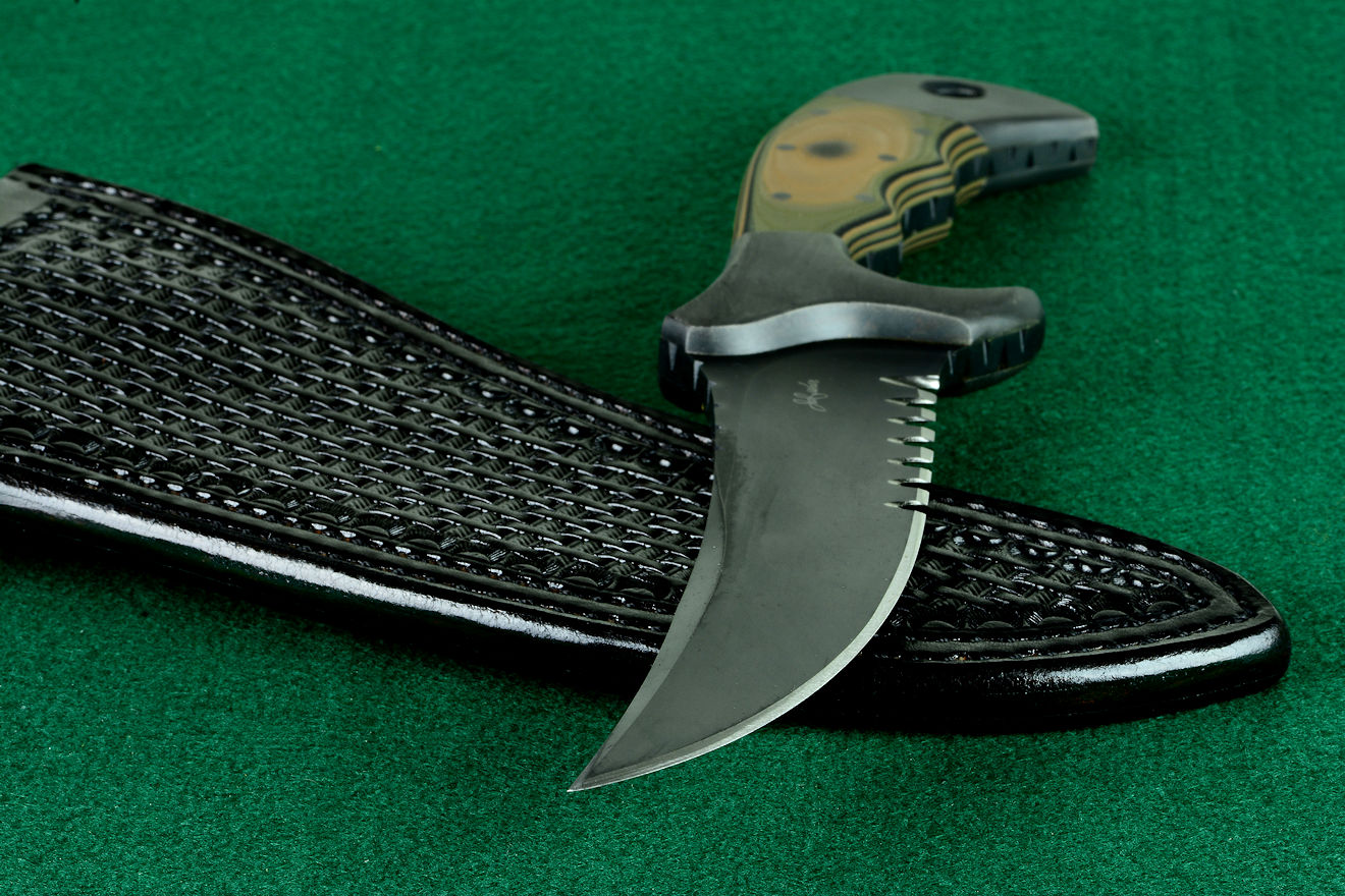 - Sheath: Heavy 9-10 oz. thick leather shoulder, hand-stamped, black lacquered