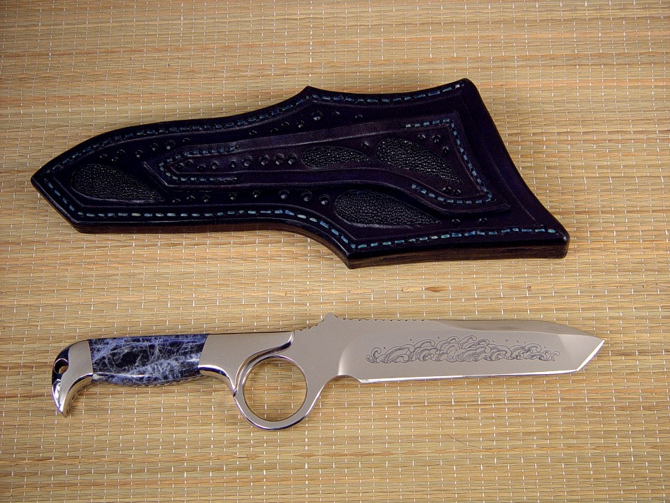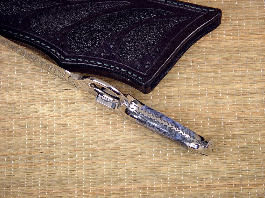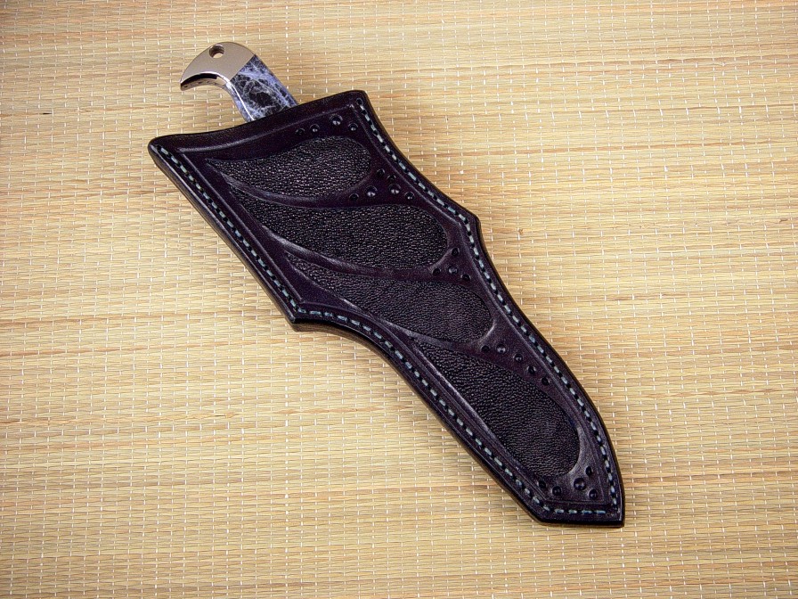 Sheath: Black Rayskin inlaid in deep blue Hand-Carved Leather