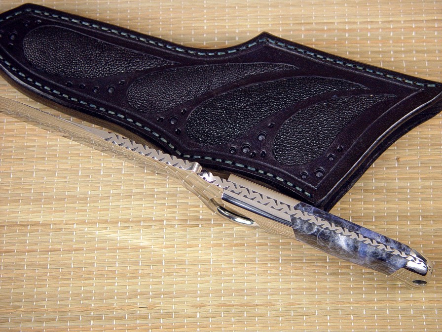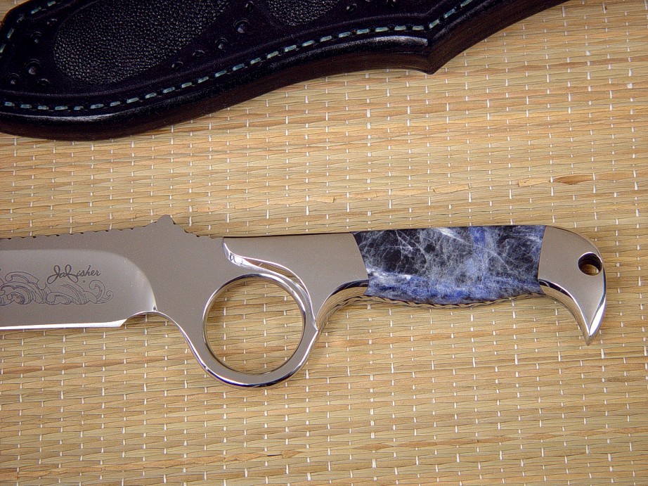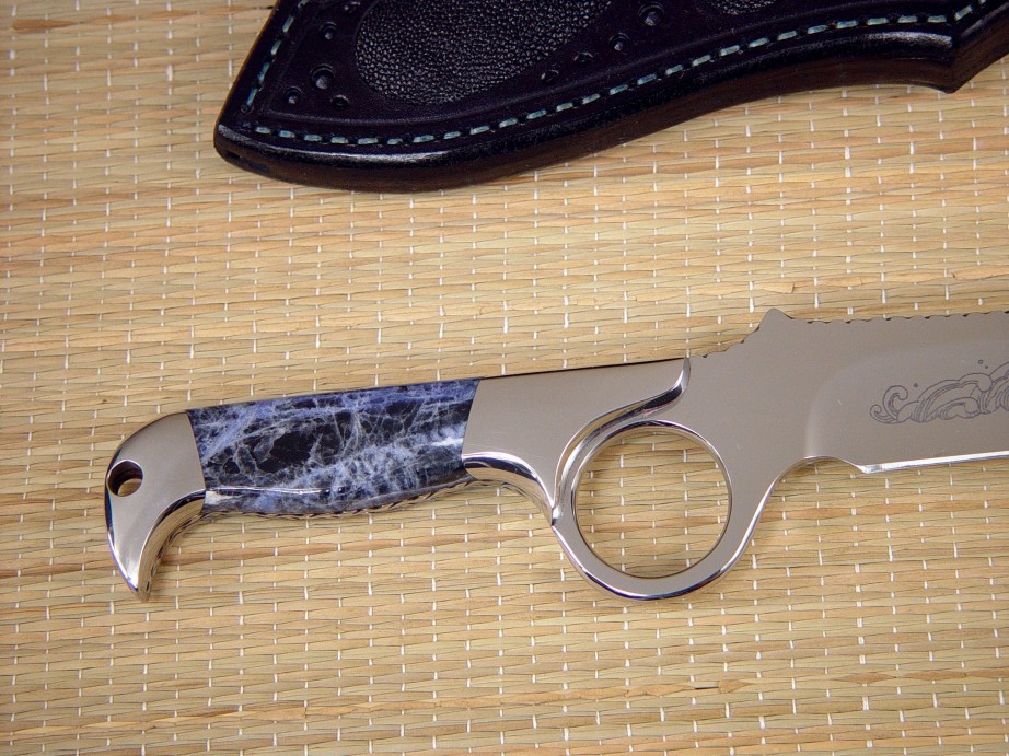 This tough Gibson Trailhead was stylized by fine etching on the blade, a Japanese wave pattern which matches the sodalite and the deep