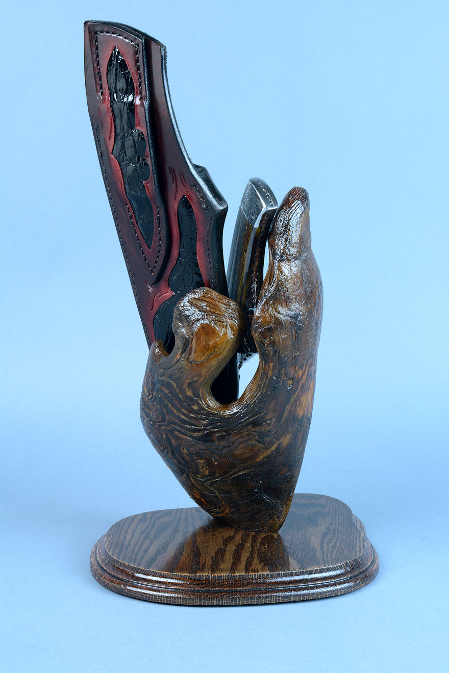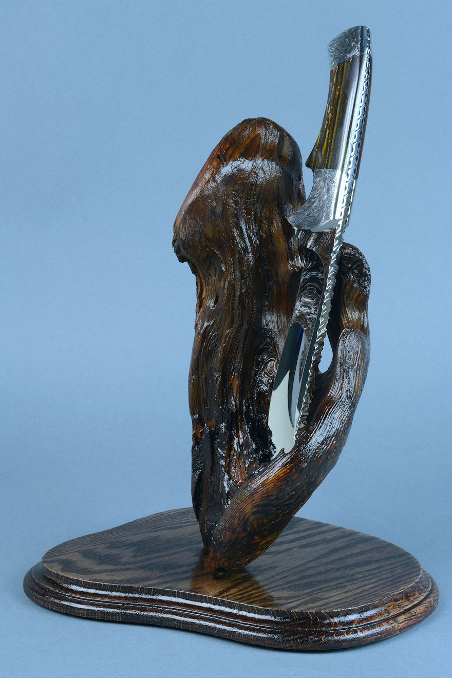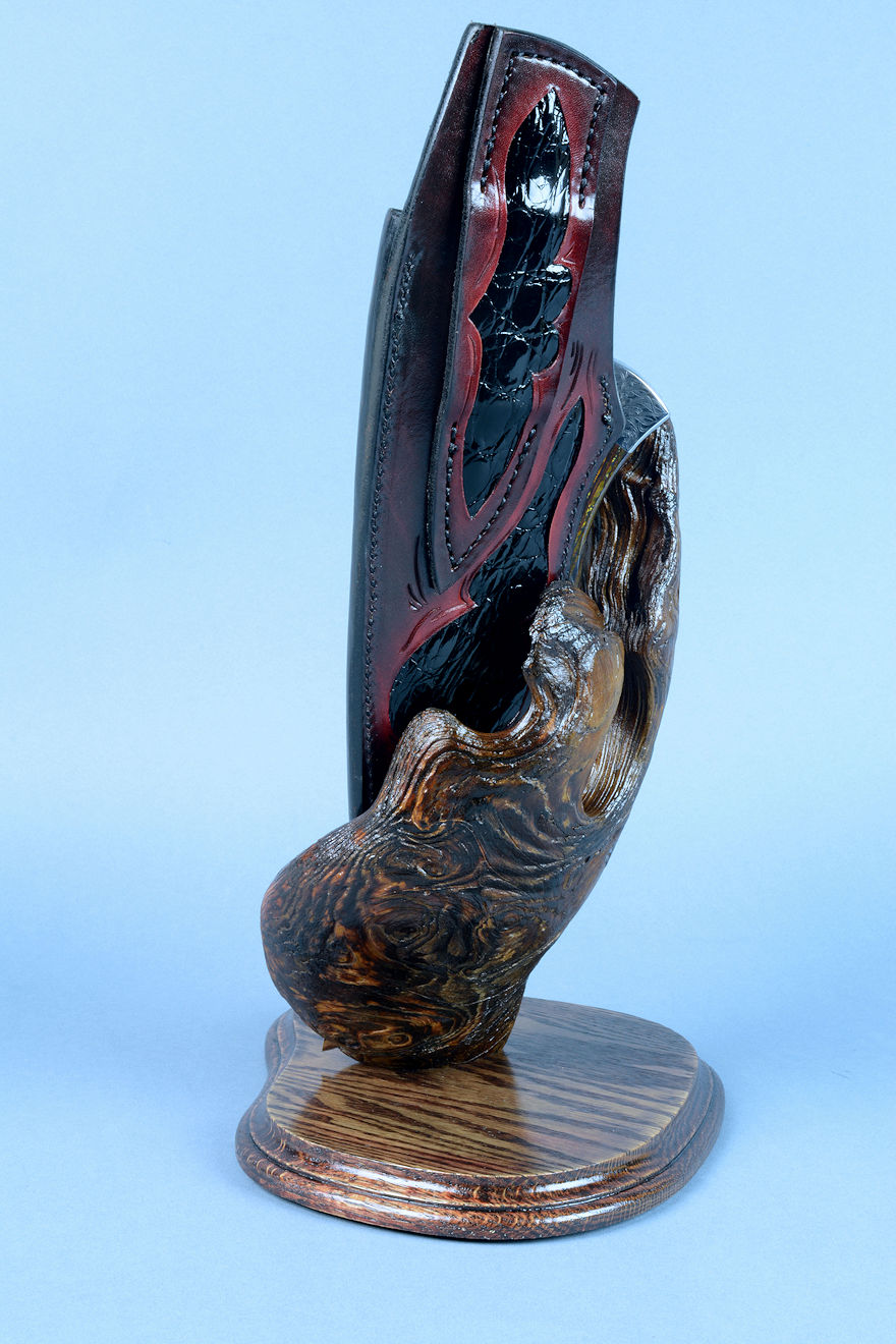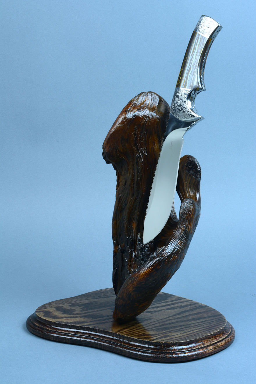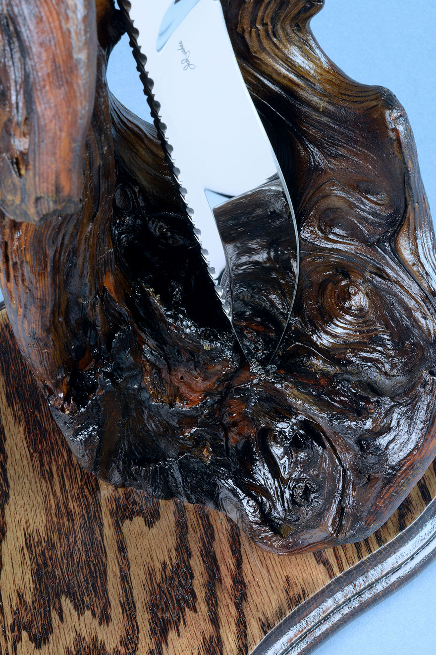 nested in the curved wing of the burl, or the knife can be displayed