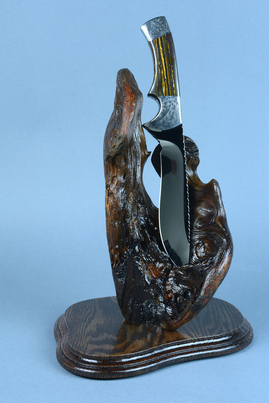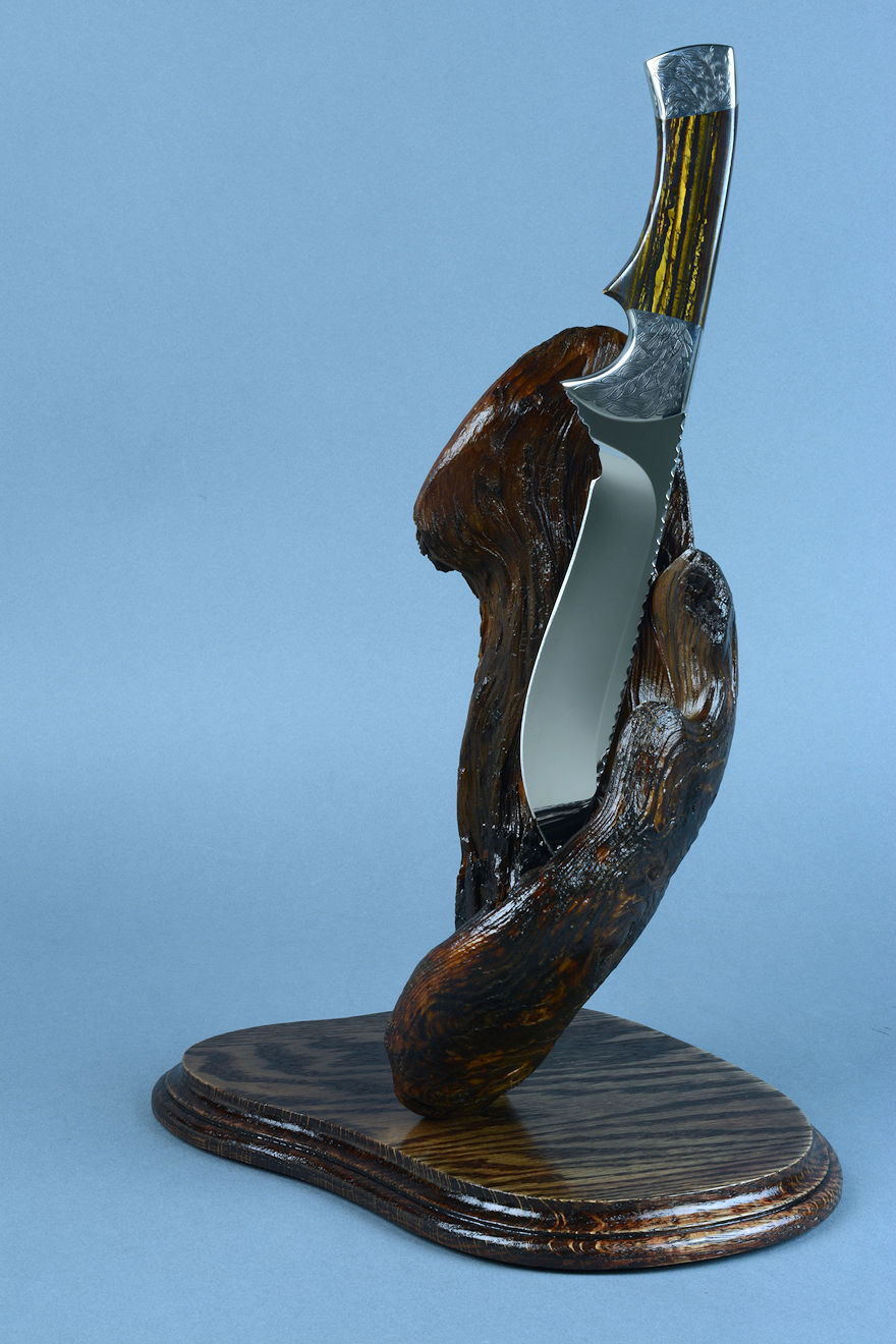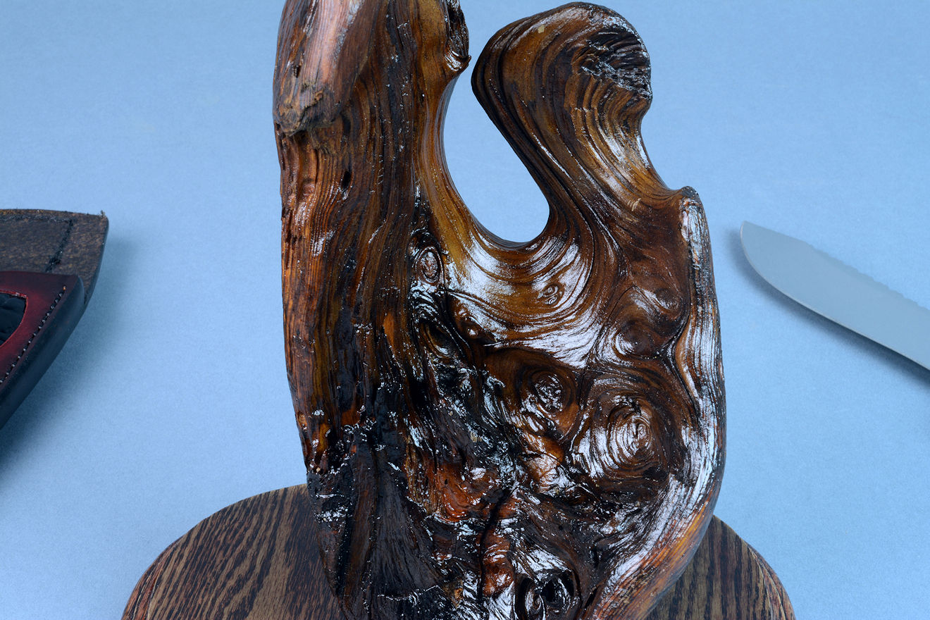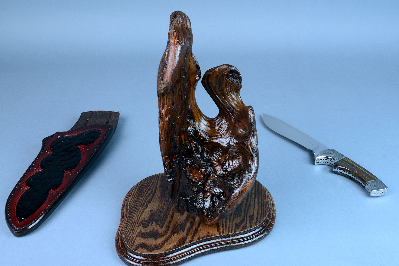 nested in the curved wing of the burl, or the knife can be displayed