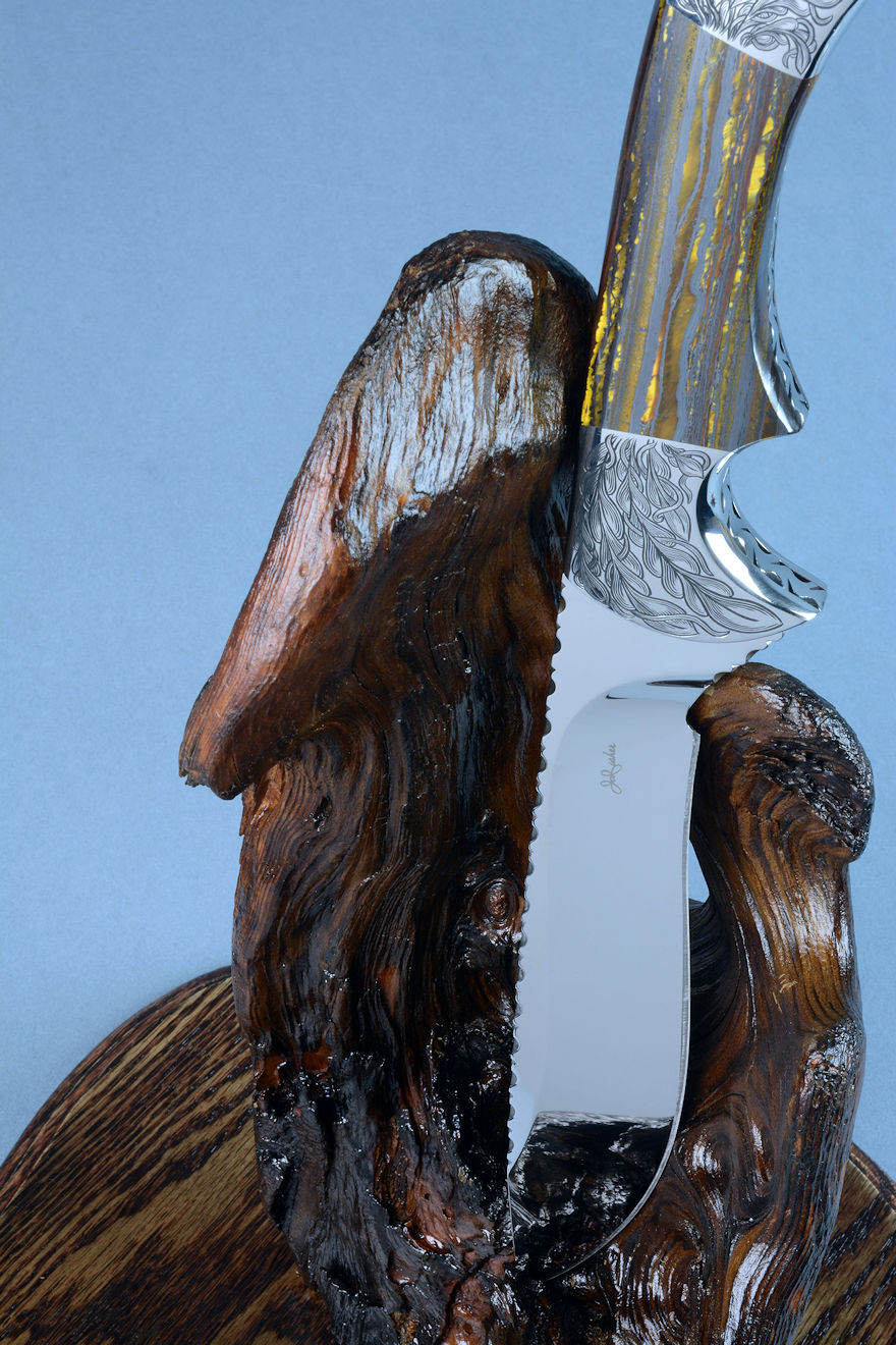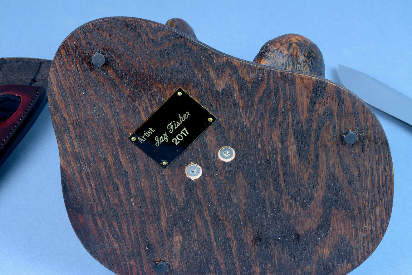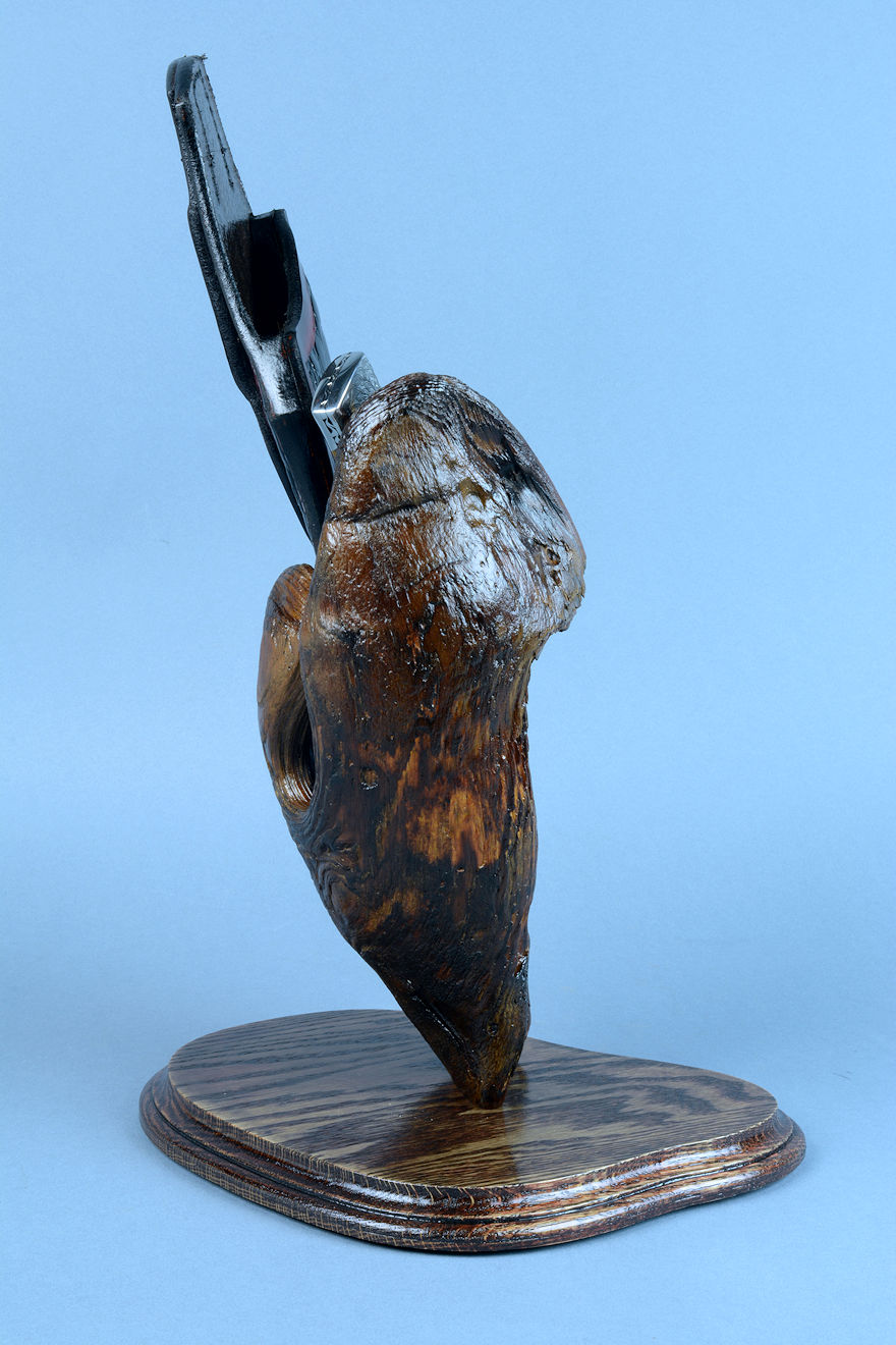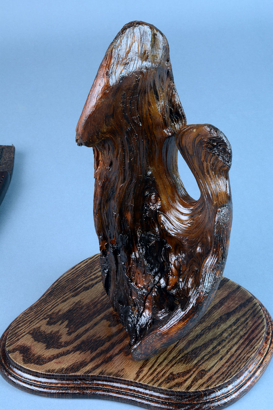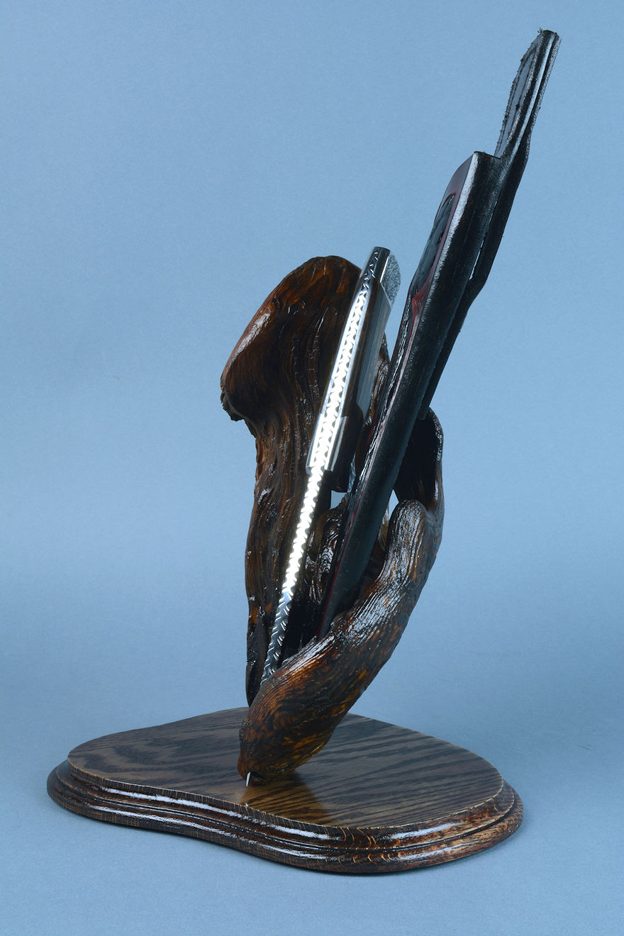 nested in the curved wing of the burl, or the knife can be displayed