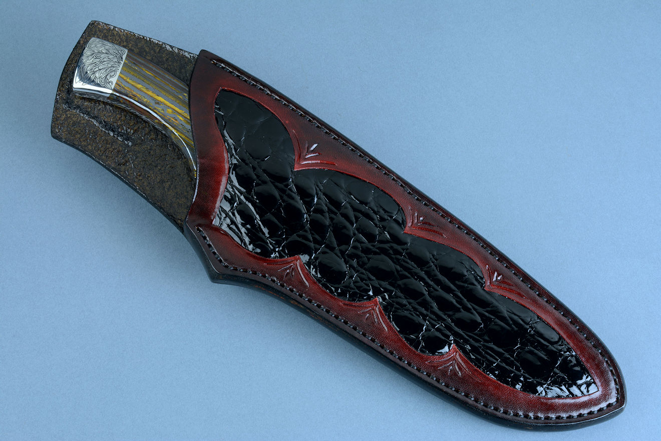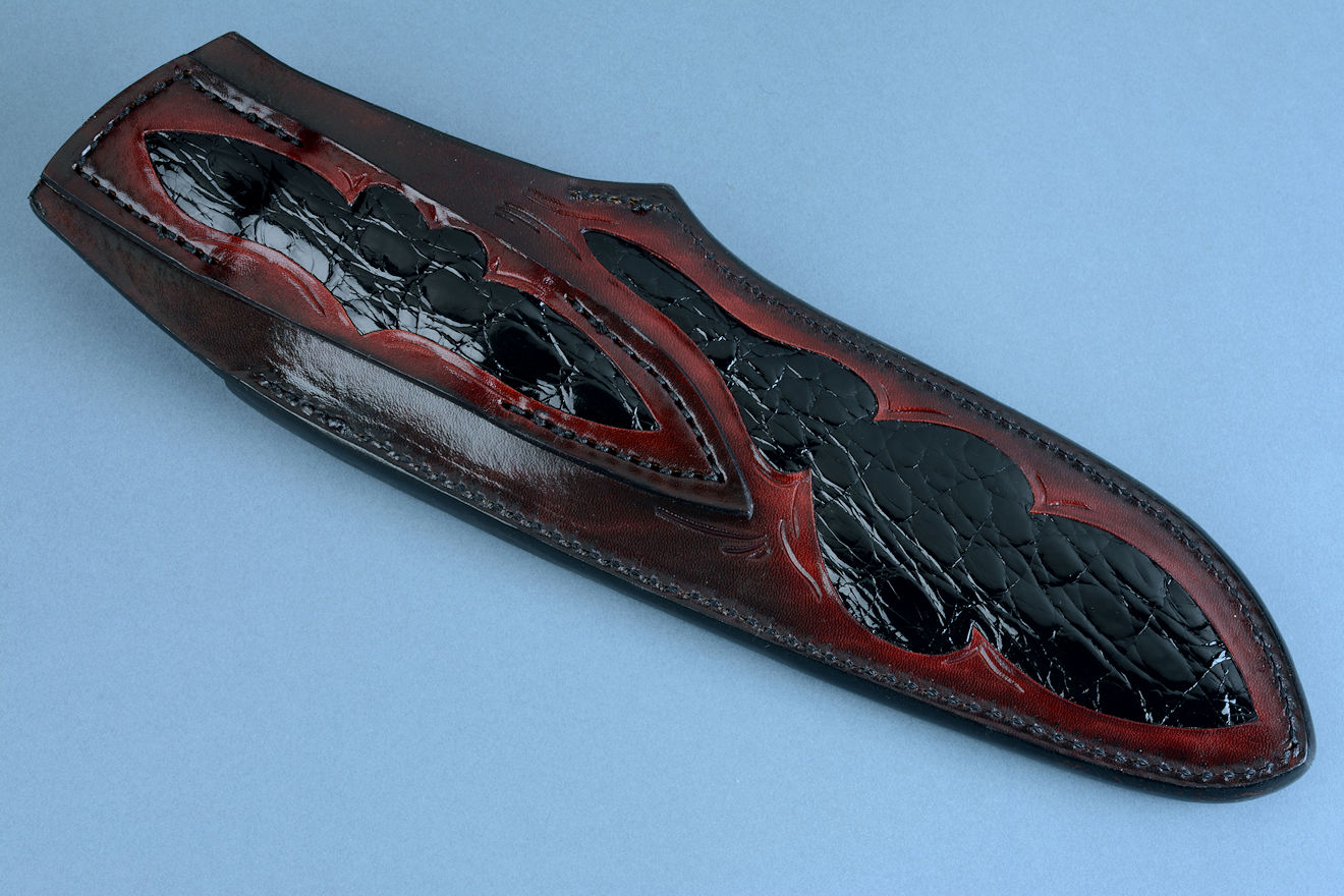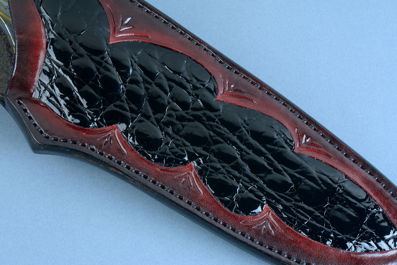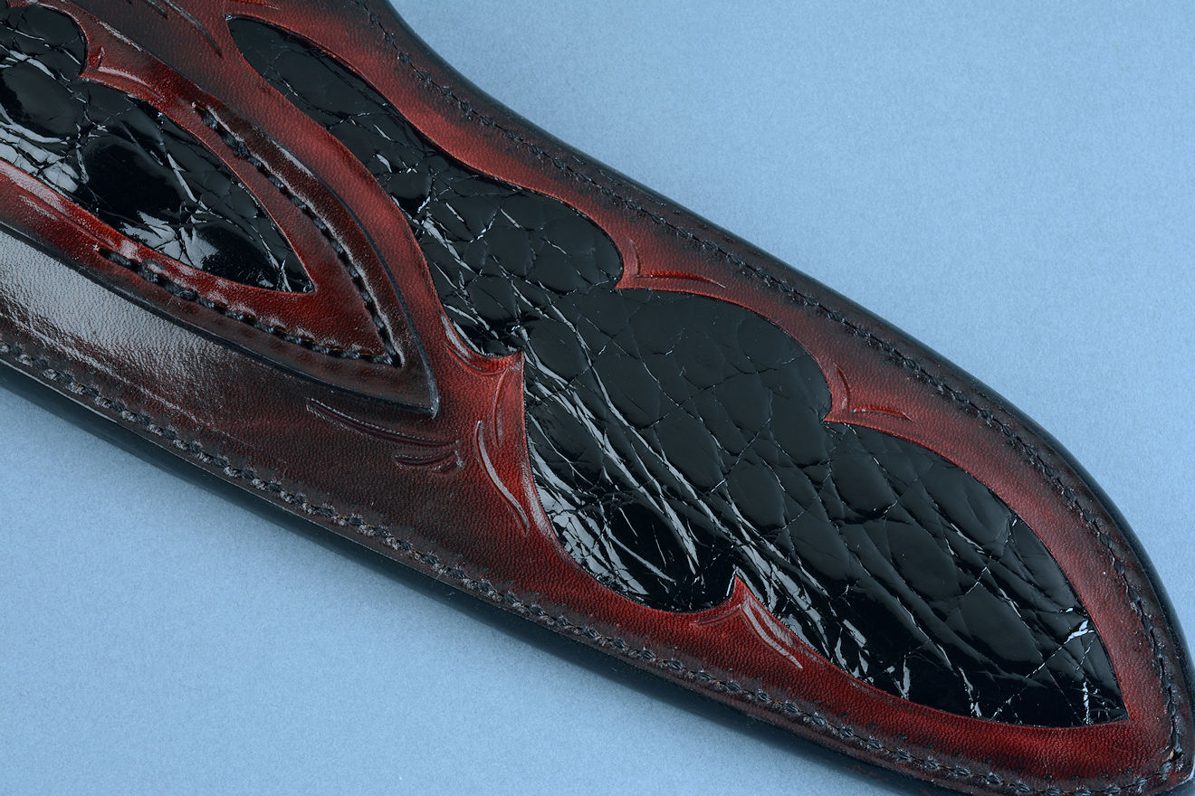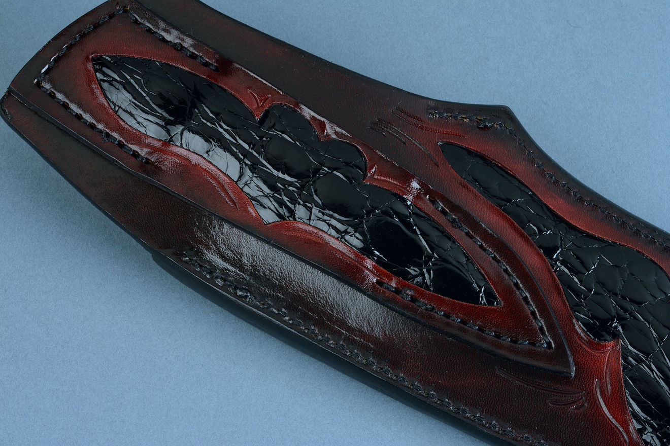 Sheath: Hand-carved, Hand-dyed Leather Shoulder inlaid with black glazed Caiman skin