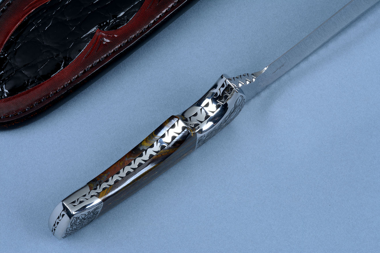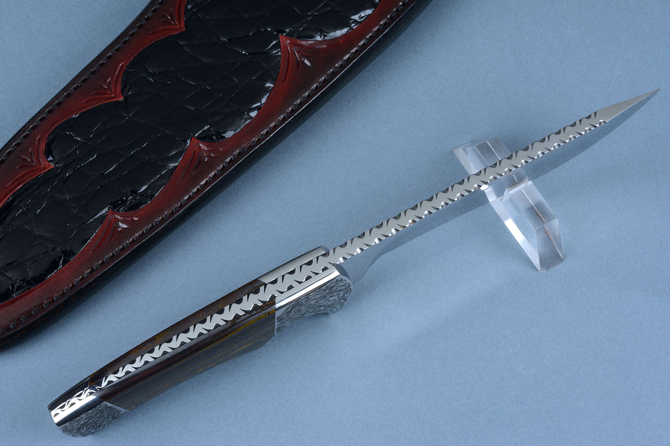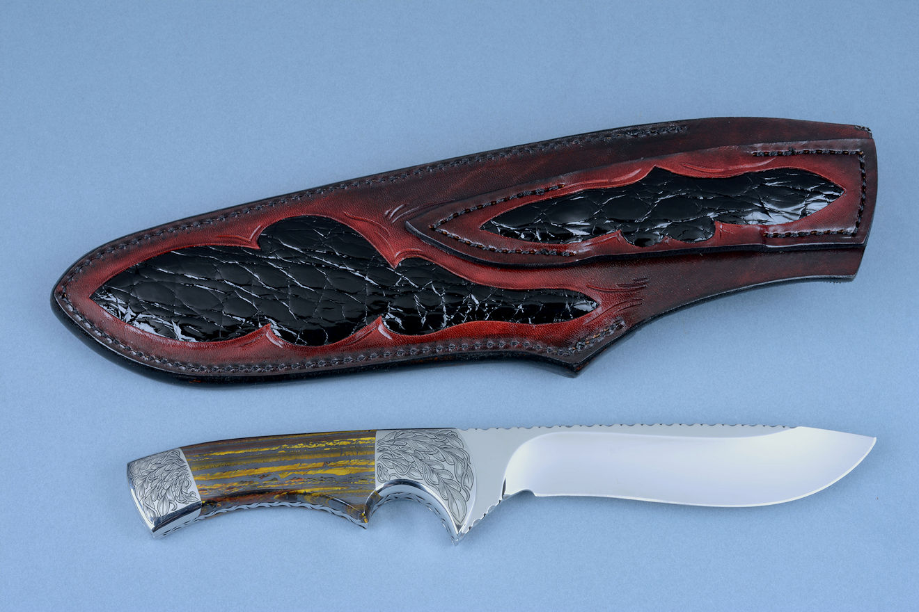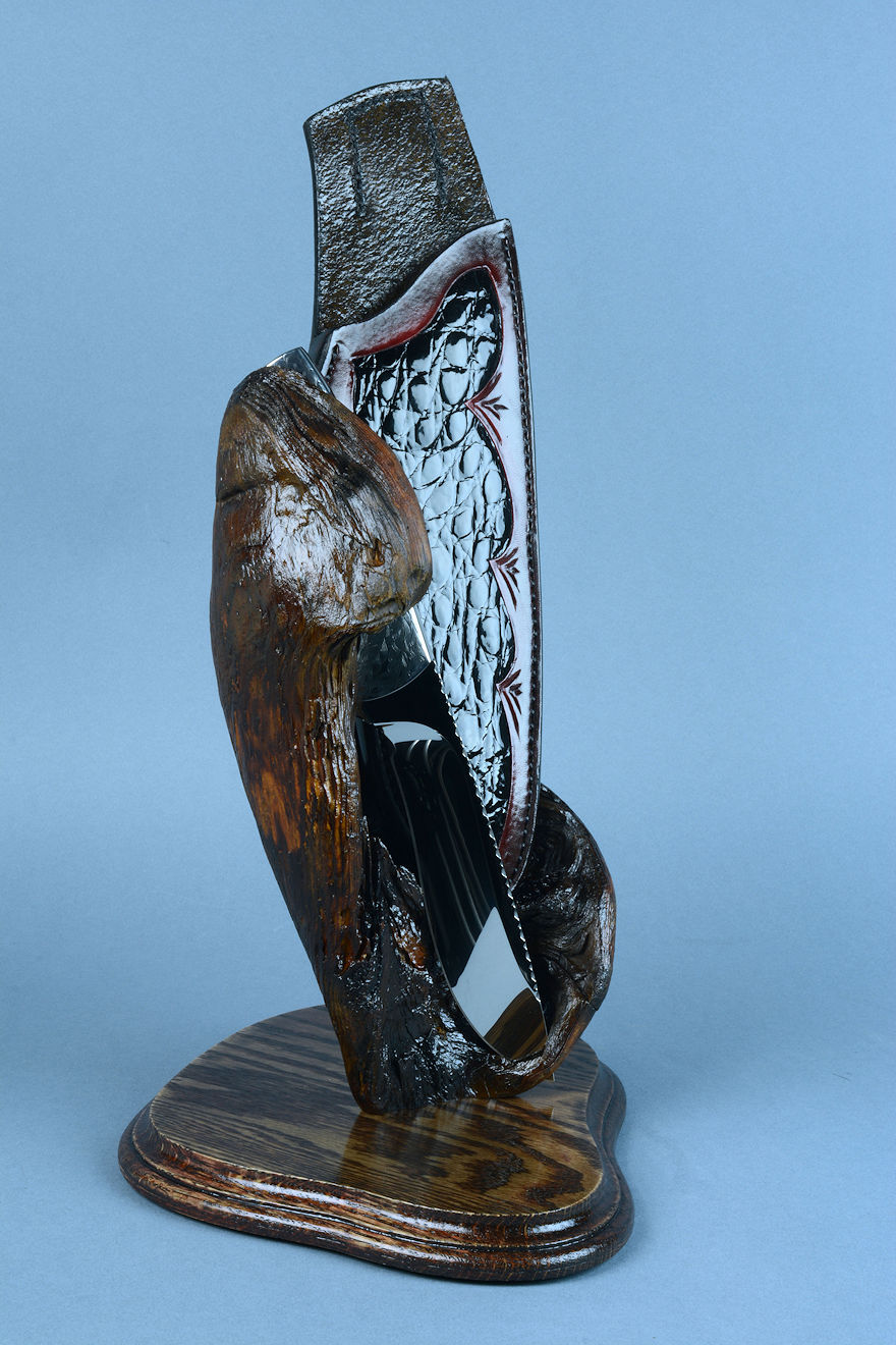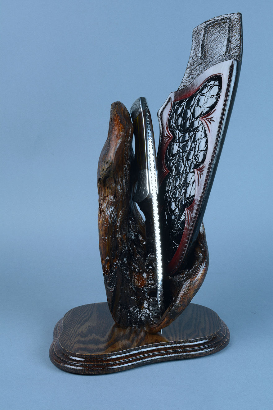Sheath: Hand-carved, Hand-dyed Leather Shoulder inlaid with black glazed Caiman skin