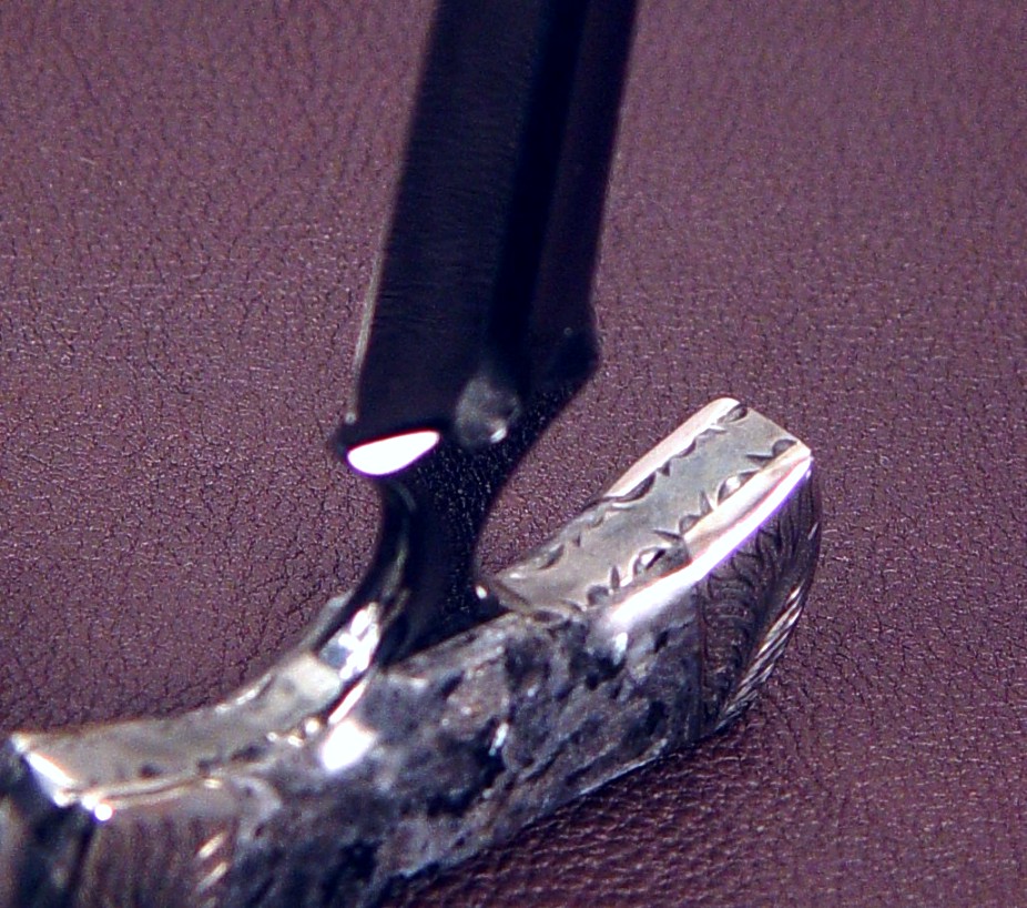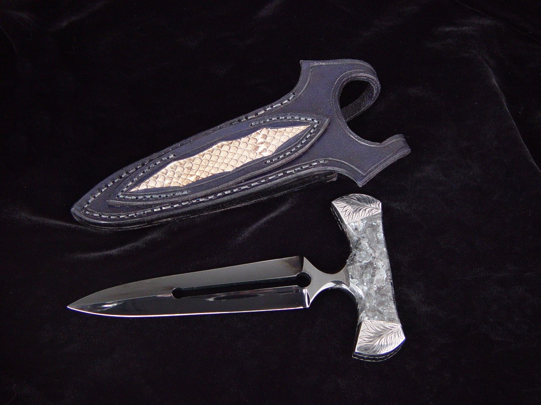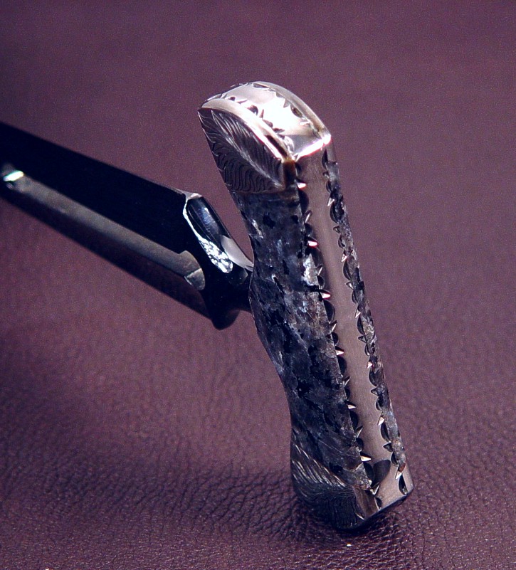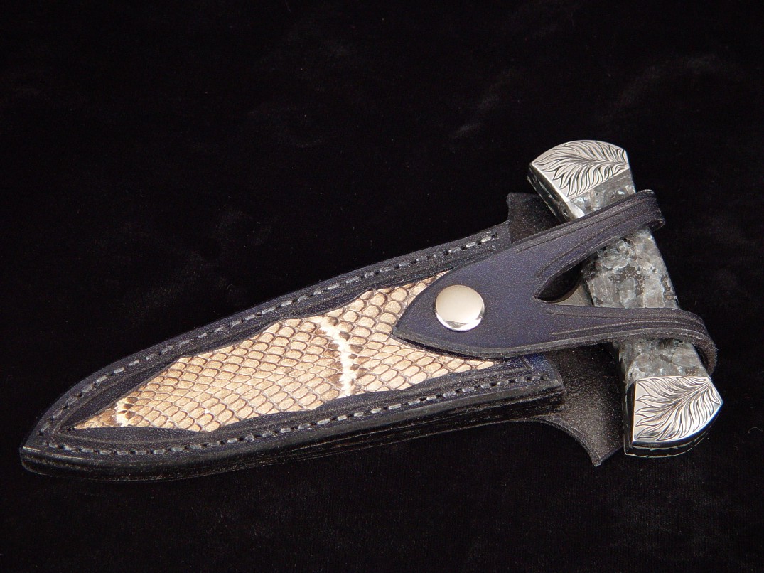 A style also used and carried by some of my military clients, the Grim Reaper is a formidable knife. The blade is over five inches long, and this particular version is made in collector's grade and fashion. The blade is tough and durable O-1 high carbon tungsten-vanadium tool steel, milled to reduce weight, double hollow ground, mirror polished and hot blued for a jet black glistening appearance and improved corrosion resistance. The blade is 5/16" thick at the ricasso, and the handle is bolstered with hand-engraved carbon steel to match the blade. The bolsters are dovetailed and bed a pair of beautiful Larvikite (Blue Pearl Granite) gemstone handle scales, which are orthoclase feldspar granites, tough and strong with a bright polished finish. The sheath is hand-carved leather, inlaid with real Cobra skin, front and back.