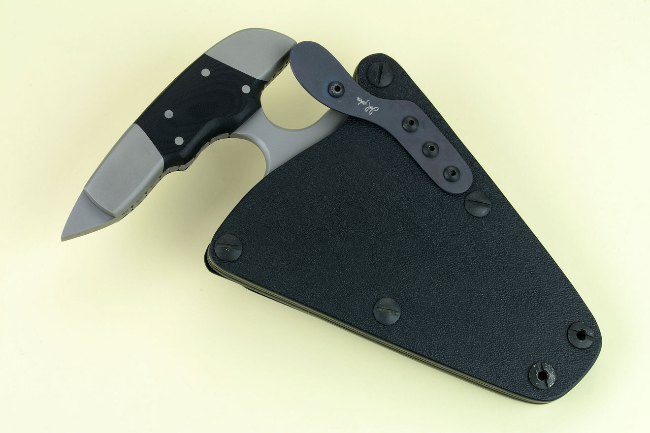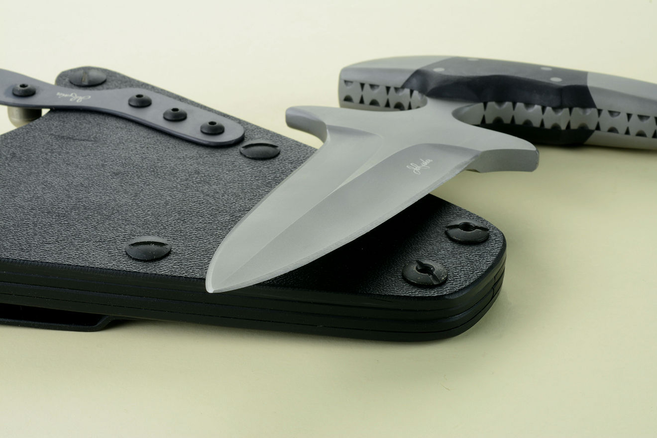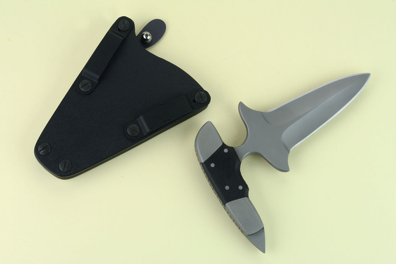 "Guardian" Custom Counterterrorism Push/Punch Dagger, obverse side view in ATS-34 high molybdenum stainless steel blade, 304 stainless steel bolsters, G10 composite handle, hybrid tension-locking sheath in kydex, anodized aluminum, anodized titanium, blackened stainless steel