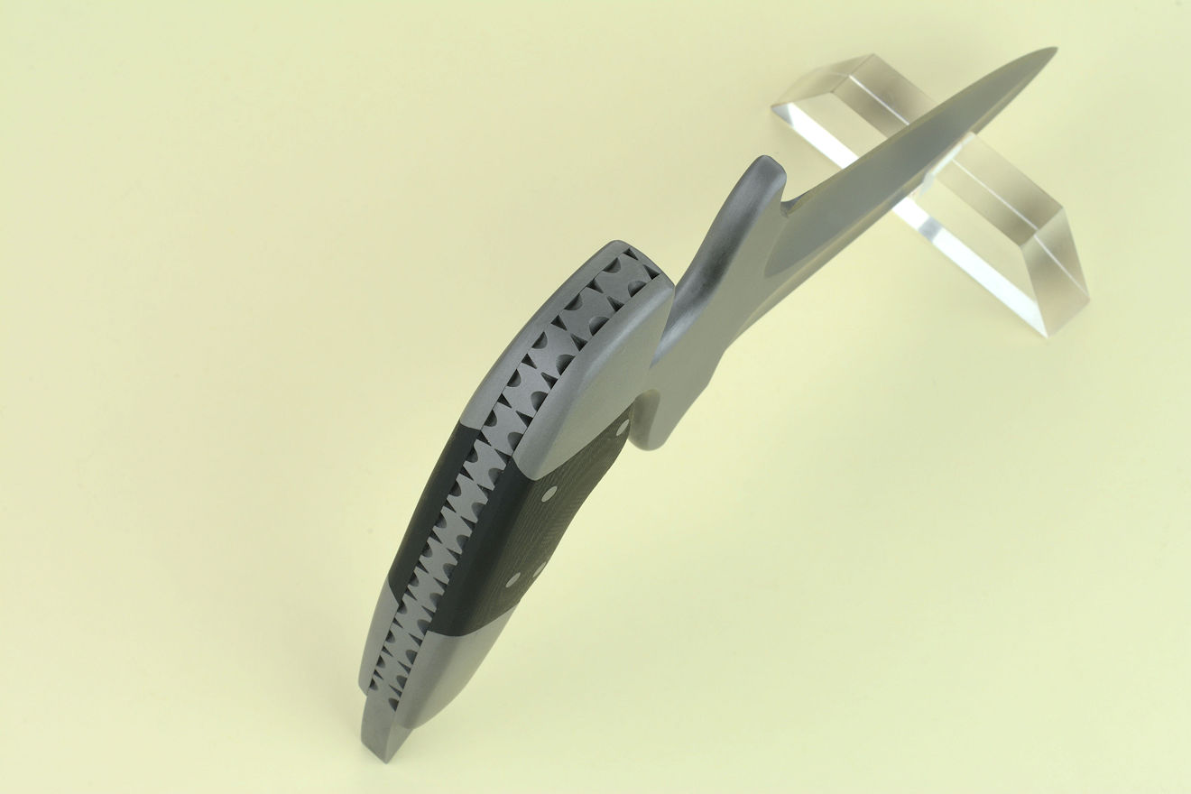 The Handle is shaped in a unique fashion, not because of a desired look, but because this was the shape that was most secure in our testing of this particular knife design and size. The steps of the handle shape solidify the grip in the palm, and the handle is bolstered in the critical areas with zero-care 304 high nickel, high chromium austenitic stainless steel. The bolsters are permanently and solidly attached with zero clearance pins that are so tight, they are invisible. The bolsters reinforce, protect, and strengthen the handle and are dovetailed to bed a pair of G10 fiberglass/epoxy composite laminate scales. The scales are blasted for texture and are locked, sealed, and bedded under the bolsters overhanging dovetailed fittings. They are then secured with four heavy through-tang 304 stainless steel pins for the ultimate in mechanical as well as adhesive strength. The bolster at the heel of the hand is contoured and front-finished, and supports the persuader (skull crusher) point. This is not a razor-sharp point (so it won't slice the owner), but is an extremely heavy geometry, so that hammer-blows with the fist are amplified to deliver many hundreds of pounds per square inch. While the persuader can be used for life threatening defense, such as a blow to the head, face, or neck, it can also be used for less lethal persuasive means on the soft tissues and bones of the limbs with simple hammer-fisted movements. The handle is entirely rounded, contoured, smoothed, and finished so it feels natural and comfortable to the human hand gripping it. The balance point is exactly at the neck of the ricasso, and the knife feels stable and powerful.