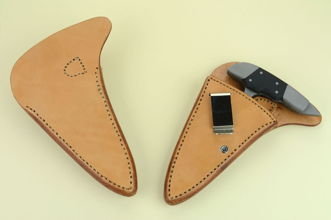 • Sheath 2: 9-10 oz. thick Leather Shoulder, Nickel Plated Spring Steel Clip, polyester sinew, (inside belt or waistband angled wear, left)