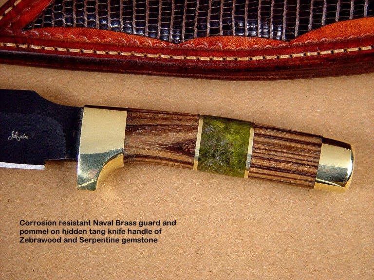 Brass: Brass is an old standard for knife bolsters and guards, and is an alloy of copper and zinc. Some guys aren't even interested in a fitting that isn't brass. Brass resists decaying corrosion that would "rust" it away, and brass develops a passive patina that inhibits further corrosion. It polishes easily, it has an initial warm, inviting color, and it engraves easily. It solders easily, and brazes well, both advantageous on milled-through guards. It's good for knives made for people who have nickel allergies.