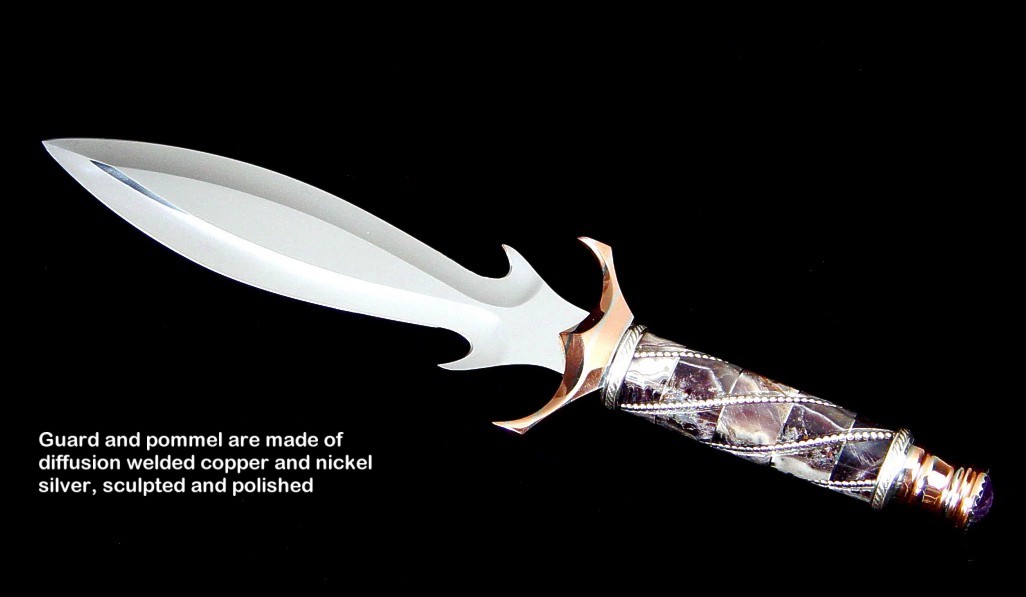 Guards are made from the same materials as the bolsters listed above, and are milled and machined to fit on a reduced tang that is also milled to fit. The guard is mechanically fitted to the tang, then usually soldered in place at the shoulder. It is this fit to the shoulder of the ricasso and the cross-sectional thickness of the tang through the guard that determines the overall strength of the knife/handle junction. It is weaker than the bolster/full tang design, but there are some designs that simply cannot be made any other way. The tang of the knife is then tapped or hard-soldered or welded to a threaded rod. The handle pieces are drilled and stacked onto the tang, then the pommel (which is drilled and tapped) is screwed on. The whole assembly of the handle may take many components (I've made one knife that had over 50 pieces on a hidden tang), and is usually filled with high quality, high strength jeweler's epoxy. After the epoxy sets, the handle, pommel, and guard are ground, sanded, and finished. This design lends itself to full, rounded handles, and decorative styles like fluting, spiral fluting, and wire wrapped inlays. It also hearkens back to the days when good steel was prized for its rarity, and not "wasted" beneath handle material.